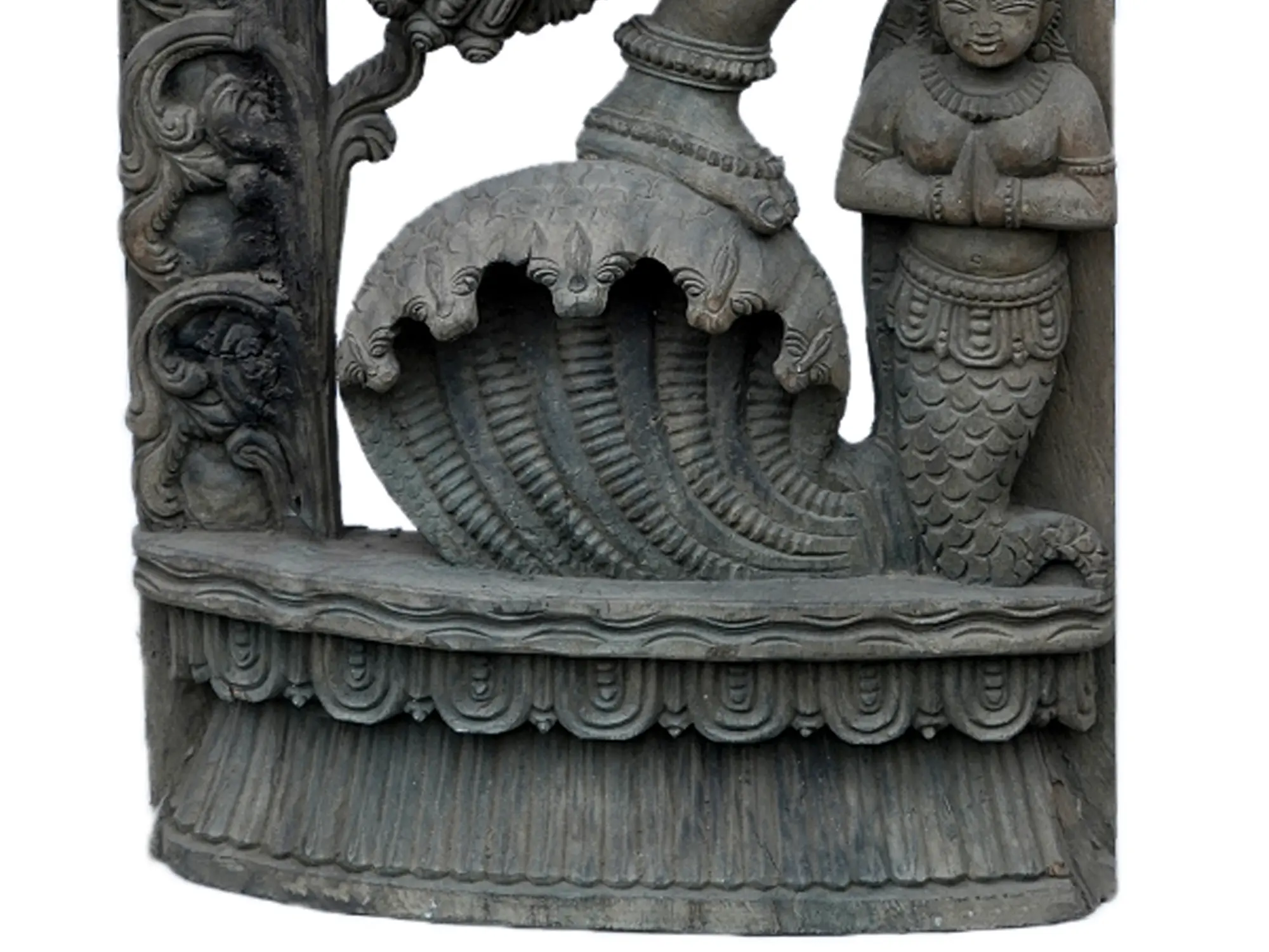 This magnificent, large-scale wooden sculpture captures a pivotal moment from Hindu mythology: Lord Krishna's triumphant dance upon the serpent Kaliya. Standing at an impressive height, this piece is a testament to the skill of master artisans, meticulously carved from fine wood to bring a legendary tale to life. The intricate details, from the delicate facial features of Krishna to the imposing coils of the multi-headed serpent, are rendered with breathtaking precision, making this sculpture a true work of art. The narrative depicted is one of divine power and compassion. The story of Krishna subduing Kaliya, a venomous serpent who had poisoned the Yamuna River and terrorized the inhabitants of Vrindavan, is a central theme in the Puranic literature, particularly the Srimad Bhagavatam. Kaliya, with his numerous hoods and immense power, was a formidable foe. However, the young Krishna, with his divine playfulness and unwavering strength, fearlessly approached the serpent in its watery abode. The sculpture portrays Krishna in his characteristic graceful posture, dancing upon Kaliya's hoods. This dance signifies not just the serpent's defeat, but also Krishna's ultimate control over all negative forces and his role as the protector of the universe. The surrounding ornamentation further enhances the visual appeal and narrative depth of the sculpture. Elaborate floral motifs, intertwined vines, and celestial beings adorn the frame, evoking the lush natural beauty of Vrindavan and the divine realm. These decorative elements are not merely aesthetic; they are often imbued with symbolic meaning, representing the interconnectedness of life and the pervasive presence of the divine. Look closely, and you might even spot figures of apsaras (celestial dancers) and gandharvas (heavenly musicians) who would have graced such a divine spectacle, adding to the richness of the scene. This sculpture serves as a powerful reminder of the timeless stories of faith, courage, and the triumph of good over evil. It is a piece that will undoubtedly become the focal point of any space, inspiring awe and contemplation. Whether placed in a home, a temple, or a spiritual center, this handcrafted masterpiece is designed to resonate with devotees and art enthusiasts alike, bringing a sense of divinity and artistic excellence to your surroundings. The aged wood, with its subtle textures and rich hues, adds a layer of warmth and authenticity, suggesting a deep connection to tradition and craftsmanship. ––––––––––––––––––
