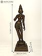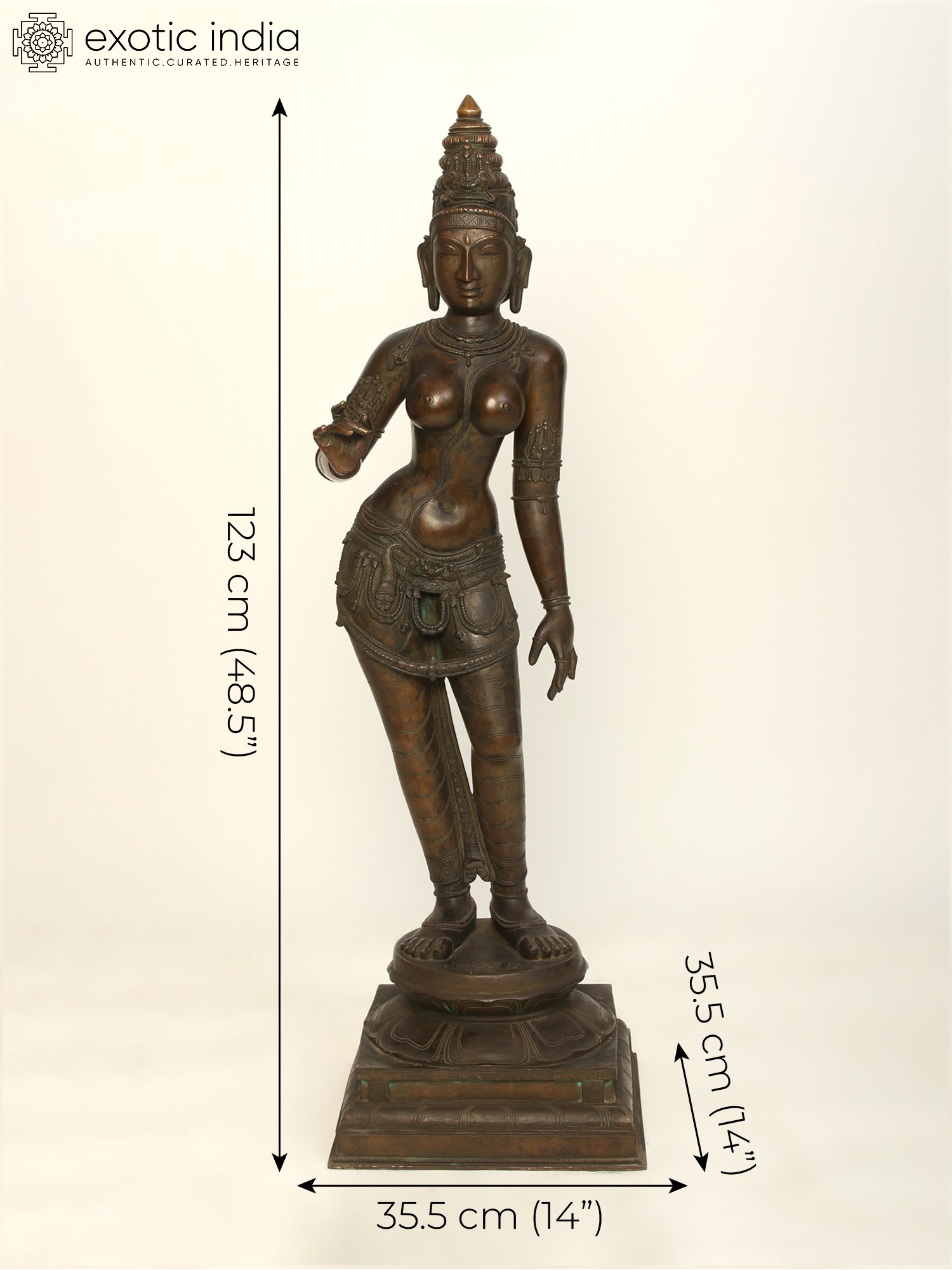 A lovely Uma Devi statue in pure bronze make. Tall and curvaceous, She stands on the pistil of an upturned lotus plinth. A silken dhoti wound around Her limbs, revealing rather than concealing the beauteous musculature of the divine. Held in place by an ornate girdle made of many bejewelled layers.