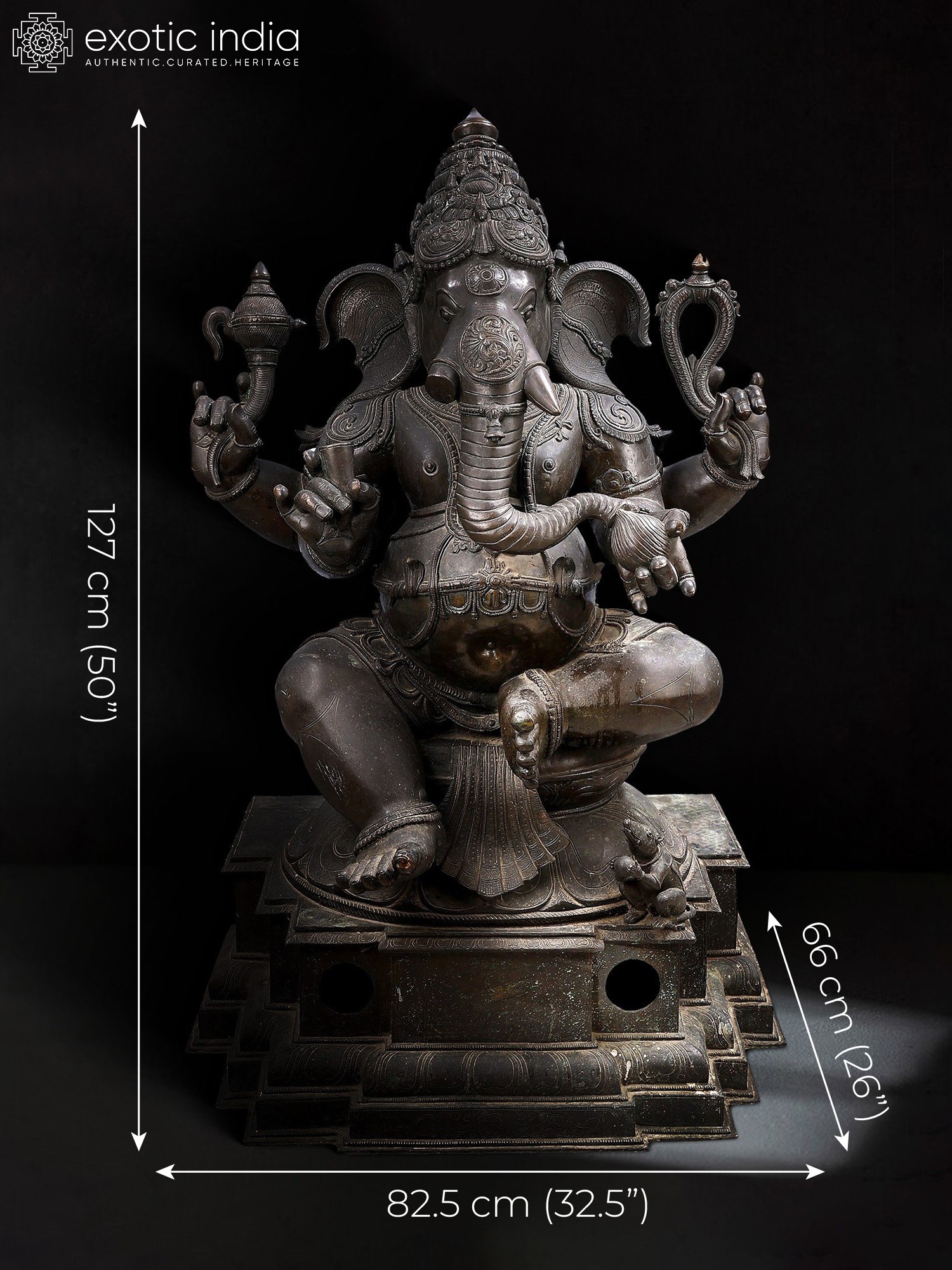 A pure bronze casting of the seated Ganesha. ‘Seated’ in Indian iconography usually translates to lalitasana, a stance of the lower limbs wherein one is folded across the seat and the other is pendant. The elements borne in each of the chaturbhujadhari’s hands add to the traditional Ganapati iconography. This Ganesha sculpture is a composition of substantial proportions. Its most distinguishing aspect is the deep, solid monotone; a dense earth colour that comes from the natural tone of pure bronze. It gives off a silvery glow against light, and adds to the gravitas of Ganesha’s divinity. A great deal of detail has been introduced into the murti. A luxuriantly engraved crown. Lifelike musculature of the limbs and brow. The angular plinth upon which He is seated, which is the most telling aspect of South Indian craftsmanship.