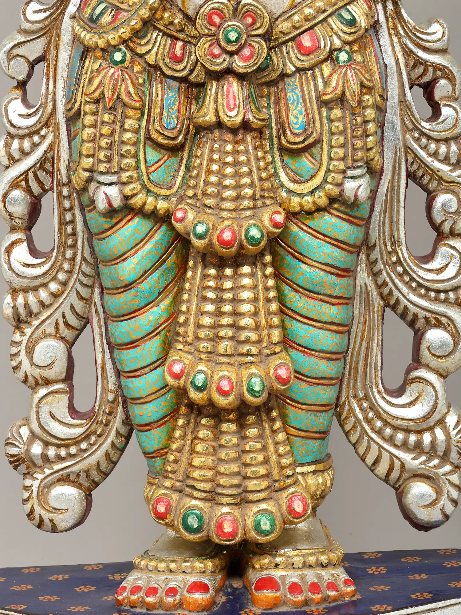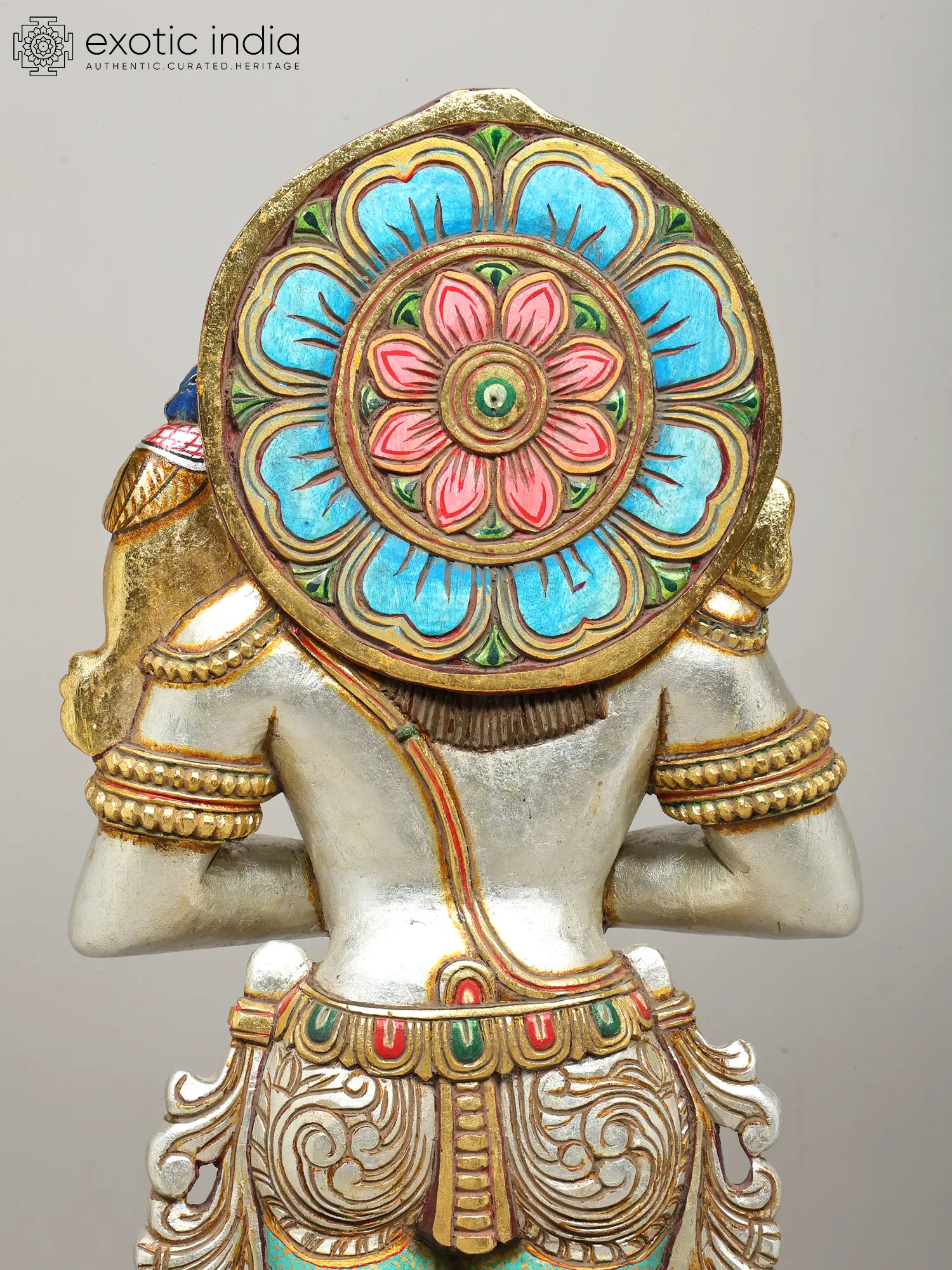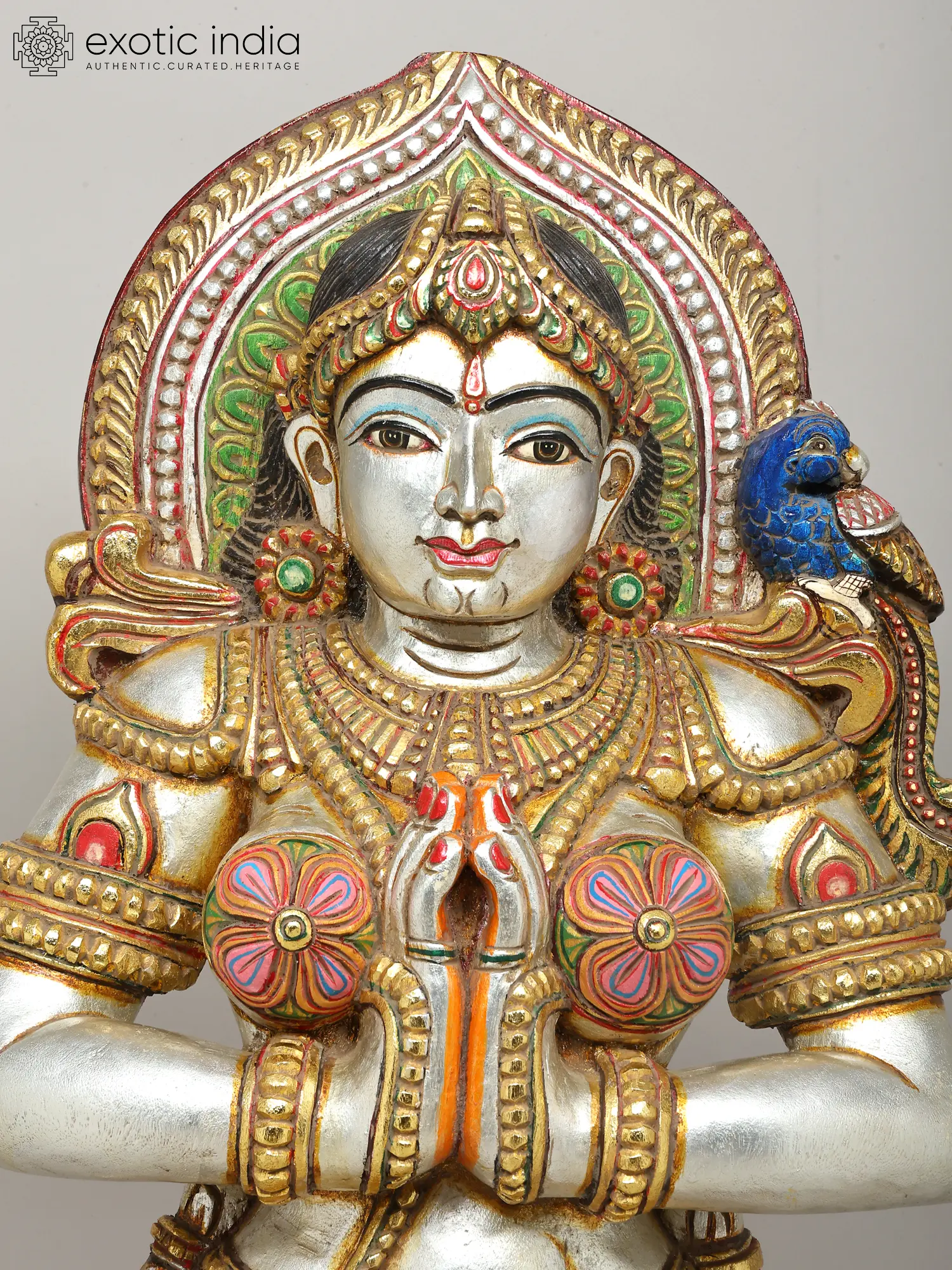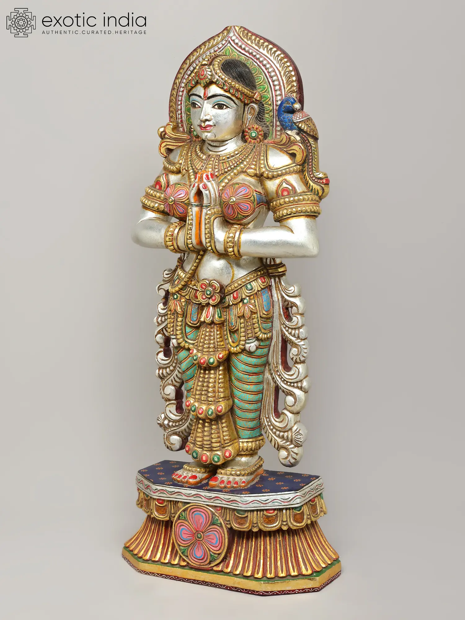 Crafted from the finest wood, this sculpture is a testament to the enduring skill of traditional artisans. Each detail, from the intricate ornamentation adorning the figure's attire to the delicate rendering of her facial features, is meticulously brought to life through patient, time-honored carving techniques. The vibrant, multi-hued finishes are applied with precision, enhancing the depth and narrative of the piece.