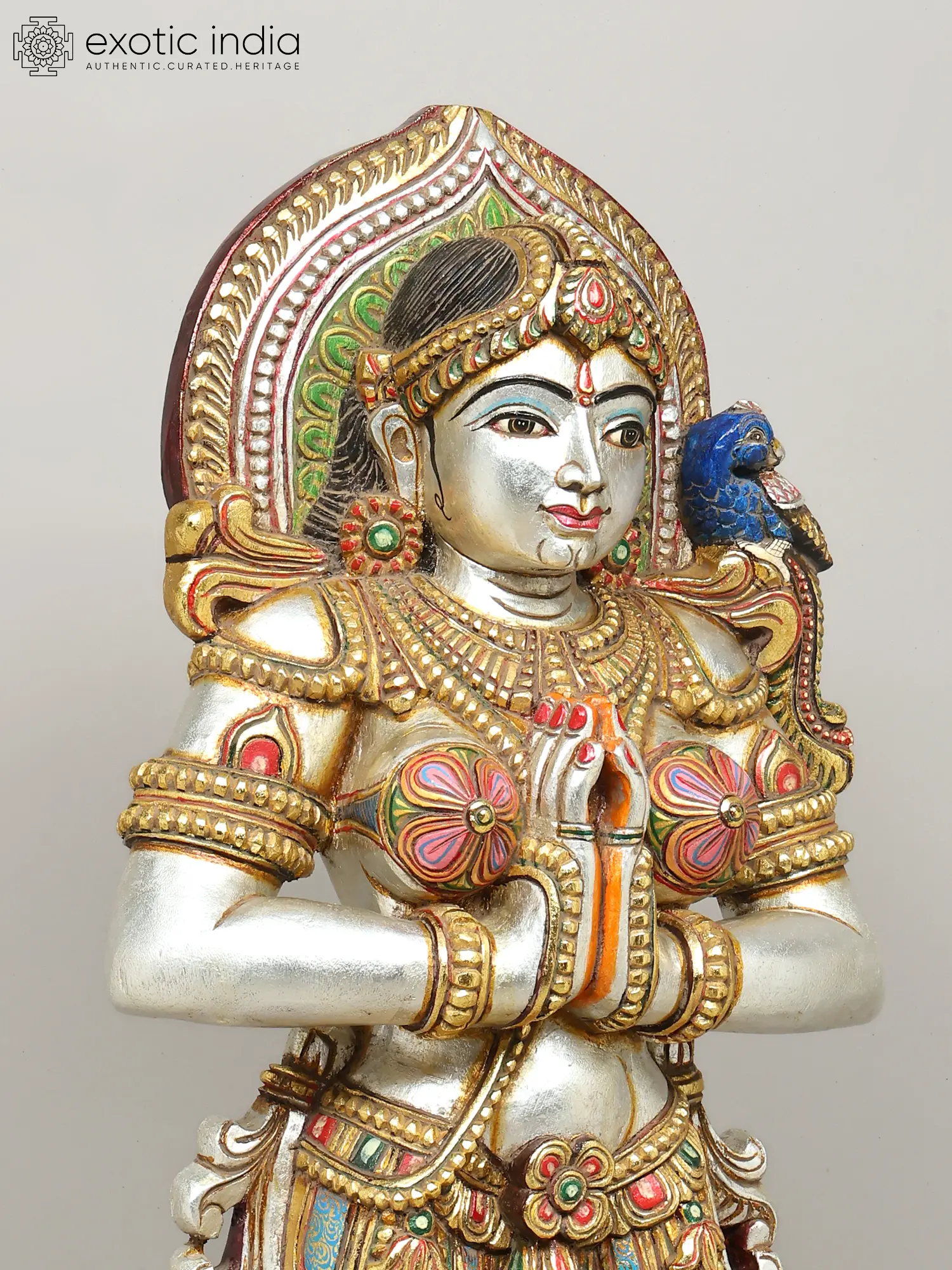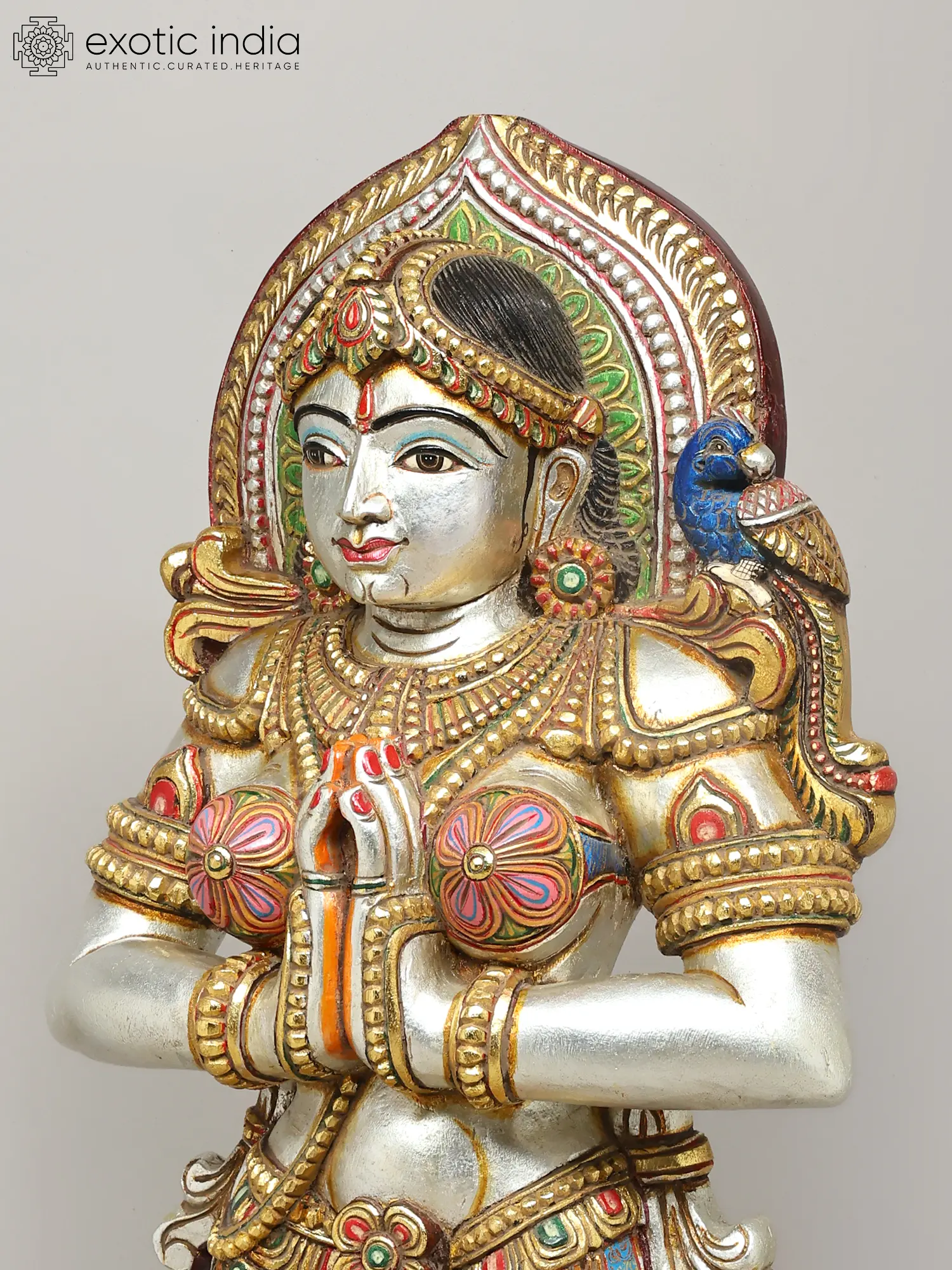 Observe the delicate embellishments that grace this figure; you'll appreciate the layered patterns of her headdress, the detailed jewelry, and the dynamic sweep of her garments. The harmonious interplay of silver, gold, and jewel-toned hues creates a rich visual tapestry, drawing the eye across the piece. A charming bluebird perched gently on her shoulder adds a touch of whimsy, while her serene expression, framed by expressive eyes, conveys a sense of welcoming grace.