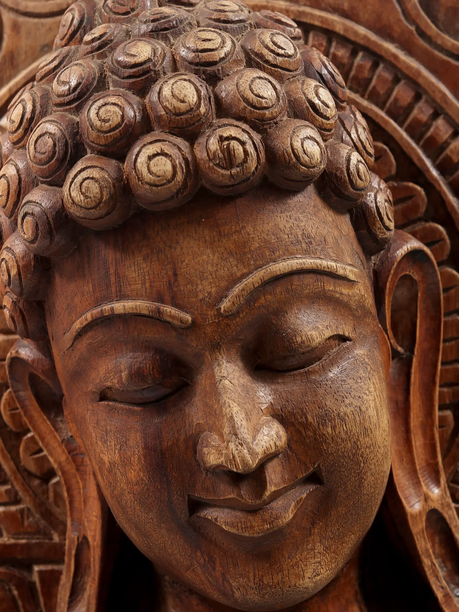 This magnificent 48-inch tall standing Buddha statue, carved from rich wood, is a testament to the enduring power and serenity of Buddhism. The statue depicts the Buddha in the Vitarkamudra, the gesture of discussion or teaching, embodying the essence of his enlightened teachings and the path to enlightenment he showed others. This imposing yet graceful piece is perfect for creating a tranquil focal point in your home, temple, meditation space, or yoga studio. Its presence will invite peace, contemplation, and a sense of spiritual connection. The intricate detail in the wood carving ensures this statue is not just a beautiful object but also a powerful symbol of faith and devotion. The warm tones of the wood create a feeling of warmth and comfort, making it a truly captivating addition to any environment.