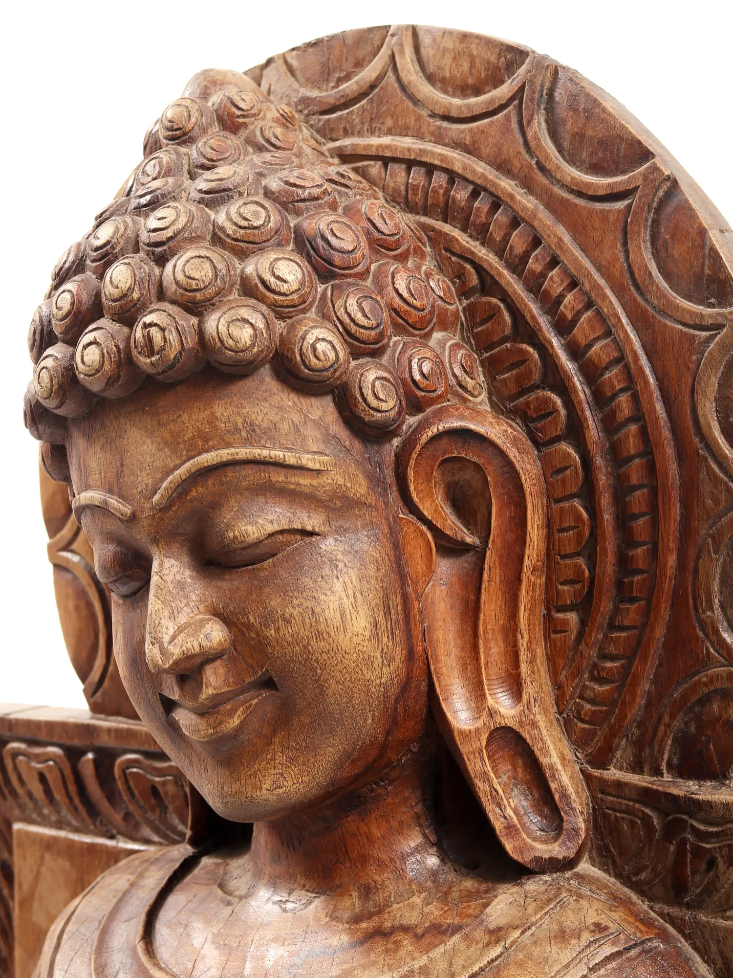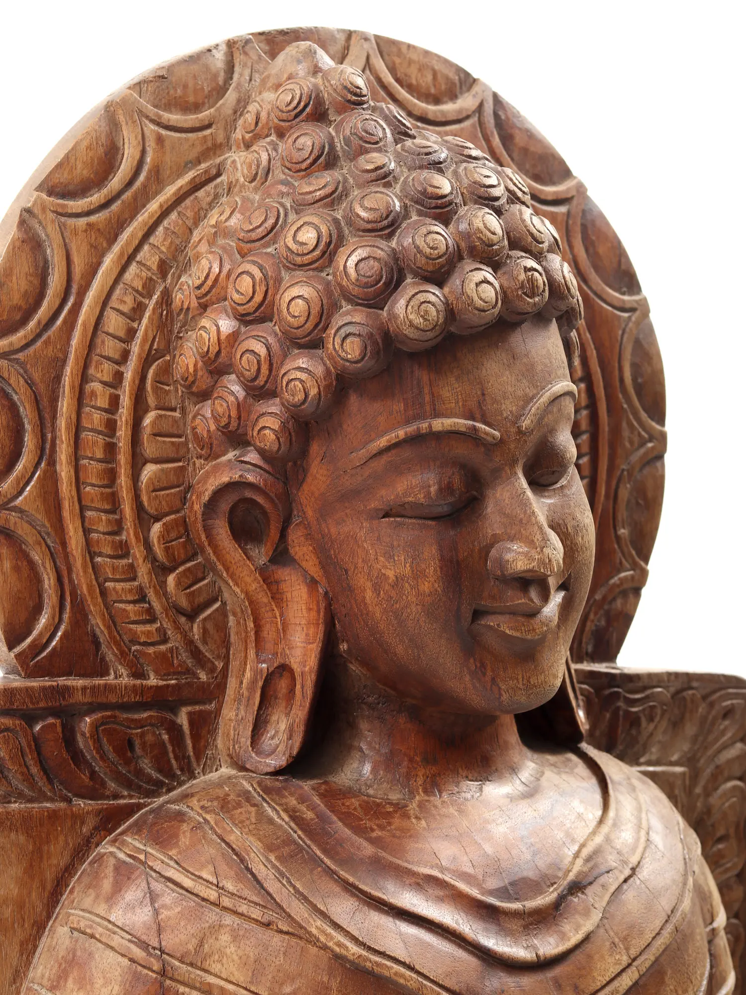 This statue is more than just a representation; it's a work of art. Each detail, from the gentle curve of the Buddha's lips to the intricate folds of his robes, is meticulously carved, showcasing exceptional craftsmanship and attention to detail. The rich, warm tones of the wood highlight the artistry of the piece, inviting a closer look and deeper appreciation. The smooth, polished surface of the wood offers a pleasing tactile experience. This is a piece designed to stand the test of time, a lasting tribute to the Buddha and a testament to the dedication of the artisans who created it. The substantial size and weight of the statue also add to its imposing presence and sense of permanence.