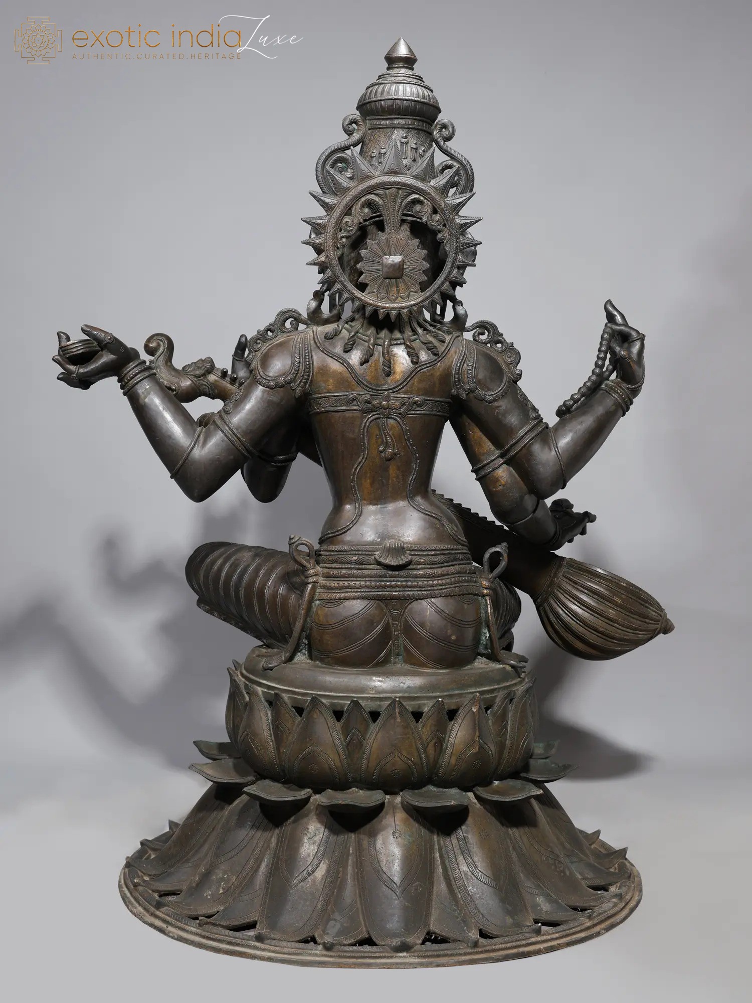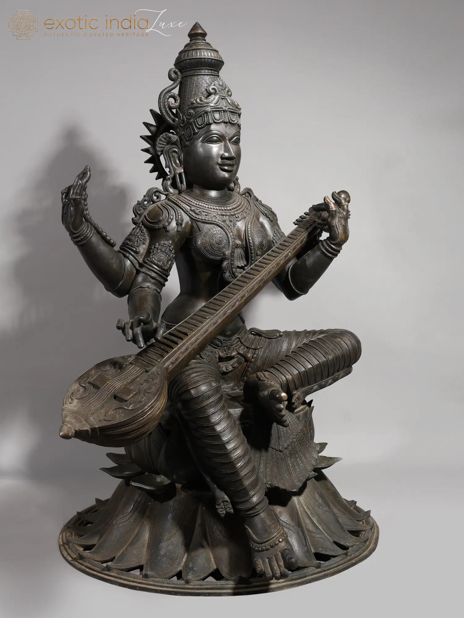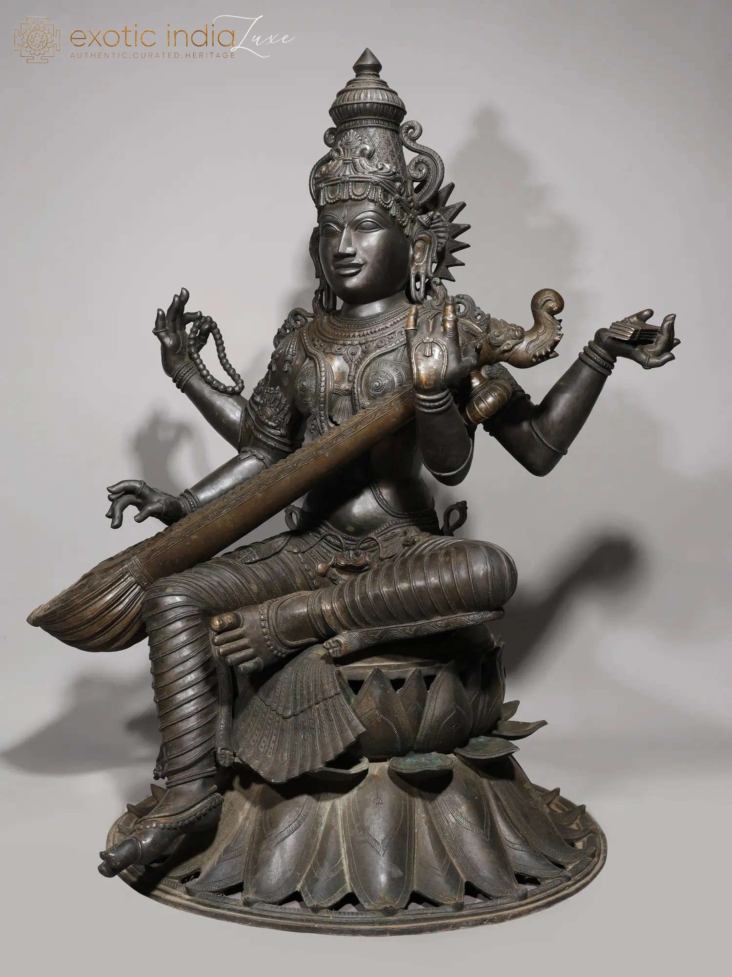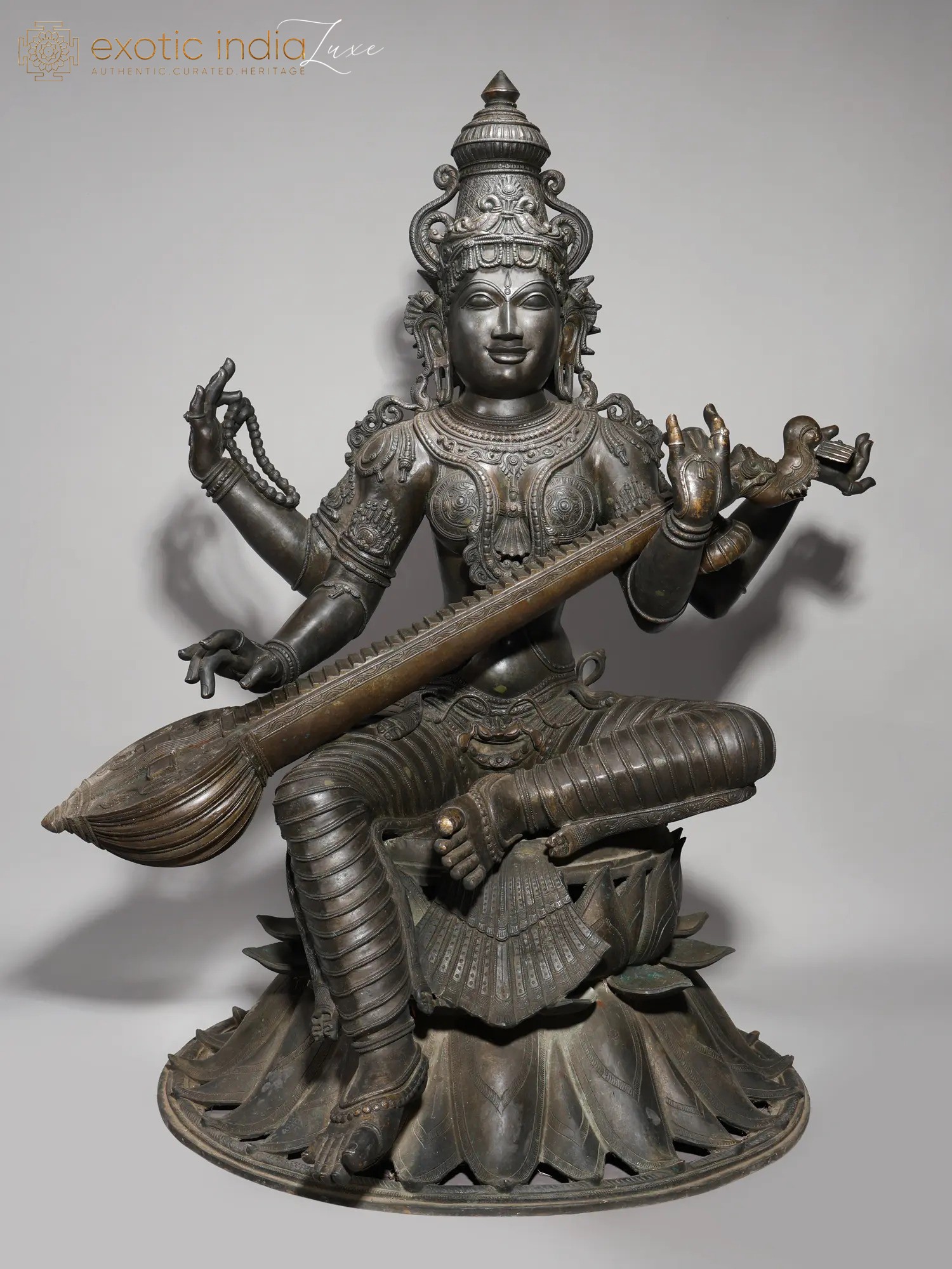 Behold the resplendent form of Goddess Saraswati, a supreme embodiment of wisdom, music, art, speech, and learning. This magnificent bronze sculpture captures her serene grace as she sits in lalitasana (a relaxed posture) upon a fully bloomed lotus, the symbol of purity, enlightenment, and spiritual awakening. Her divine presence brings forth the blessings of knowledge and creativity to all who seek her grace. This exceptional statue, cast in Panchaloha bronze, not only embodies the divine feminine but also encapsulates centuries of artistic tradition.