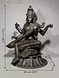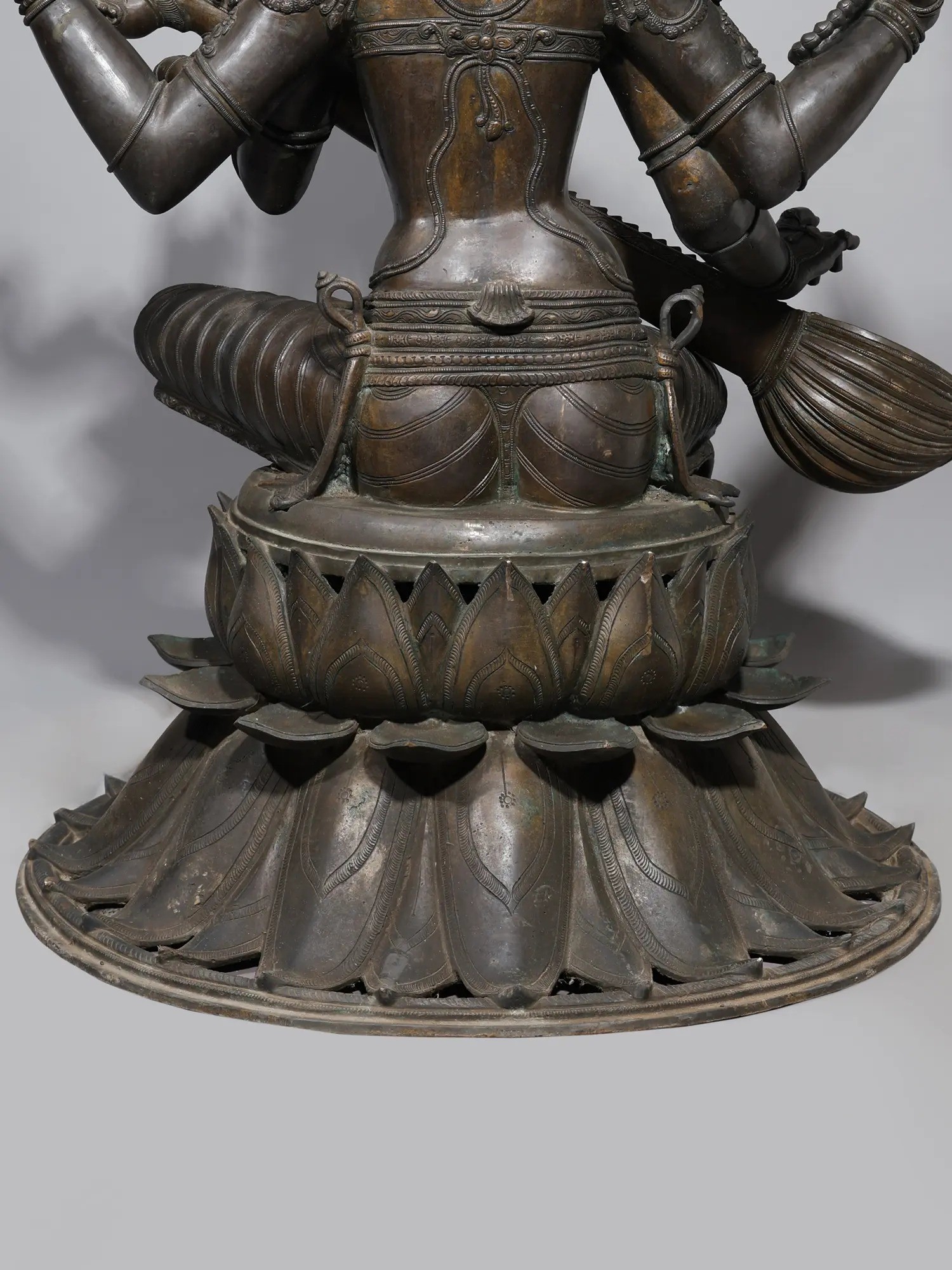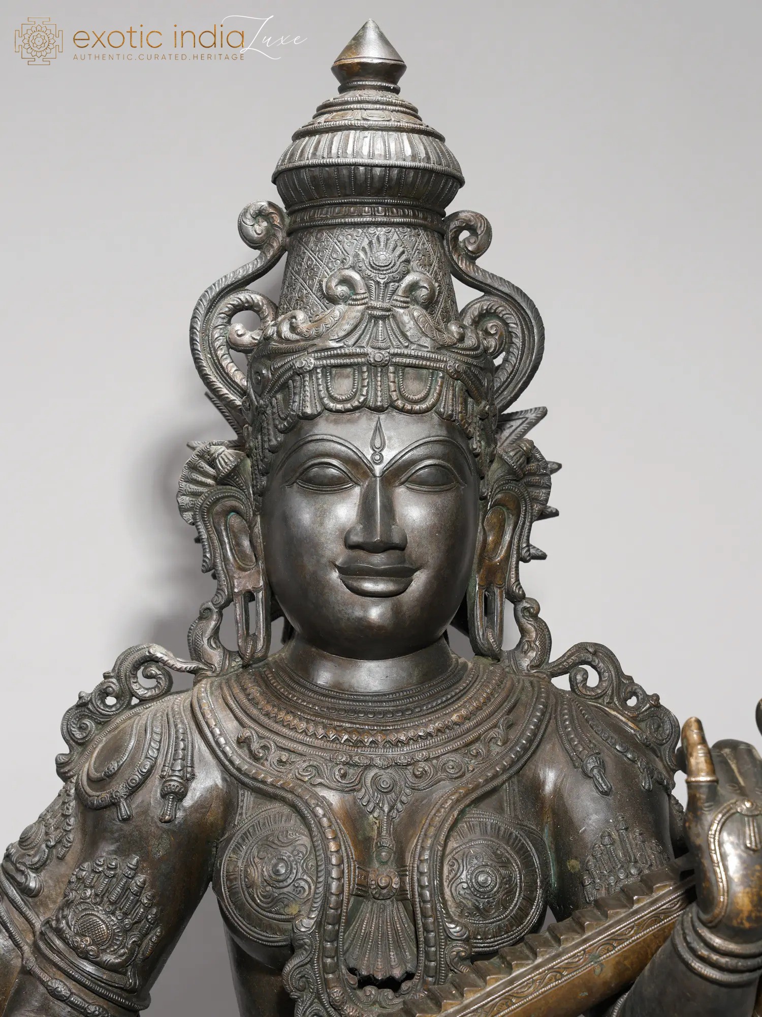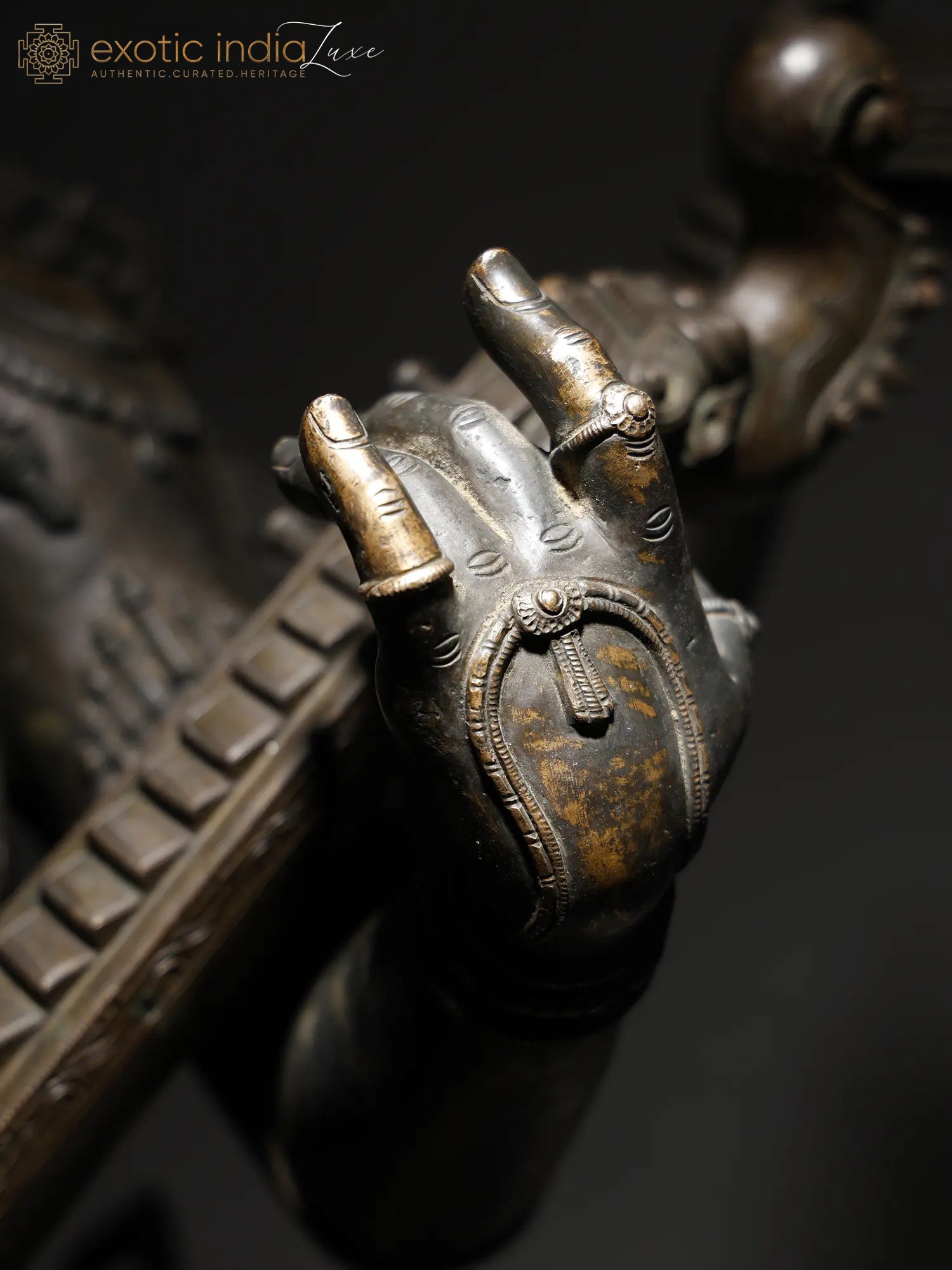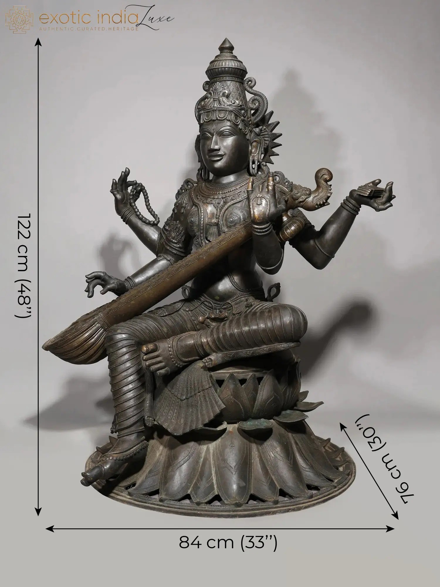 Behold the resplendent form of Goddess Saraswati, a supreme embodiment of wisdom, music, art, speech, and learning. This magnificent bronze sculpture captures her serene grace as she sits in lalitasana (a relaxed posture) upon a fully bloomed lotus, the symbol of purity, enlightenment, and spiritual awakening. Her divine presence brings forth the blessings of knowledge and creativity to all who seek her grace. This exceptional statue, cast in Panchaloha bronze, not only embodies the divine feminine but also encapsulates centuries of artistic tradition.