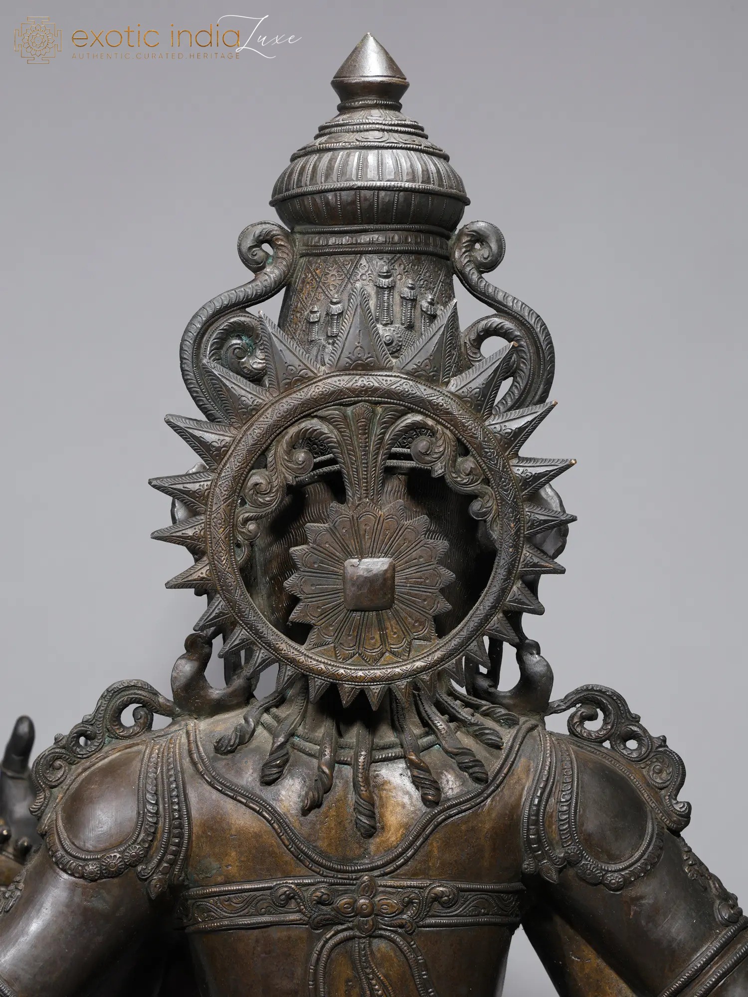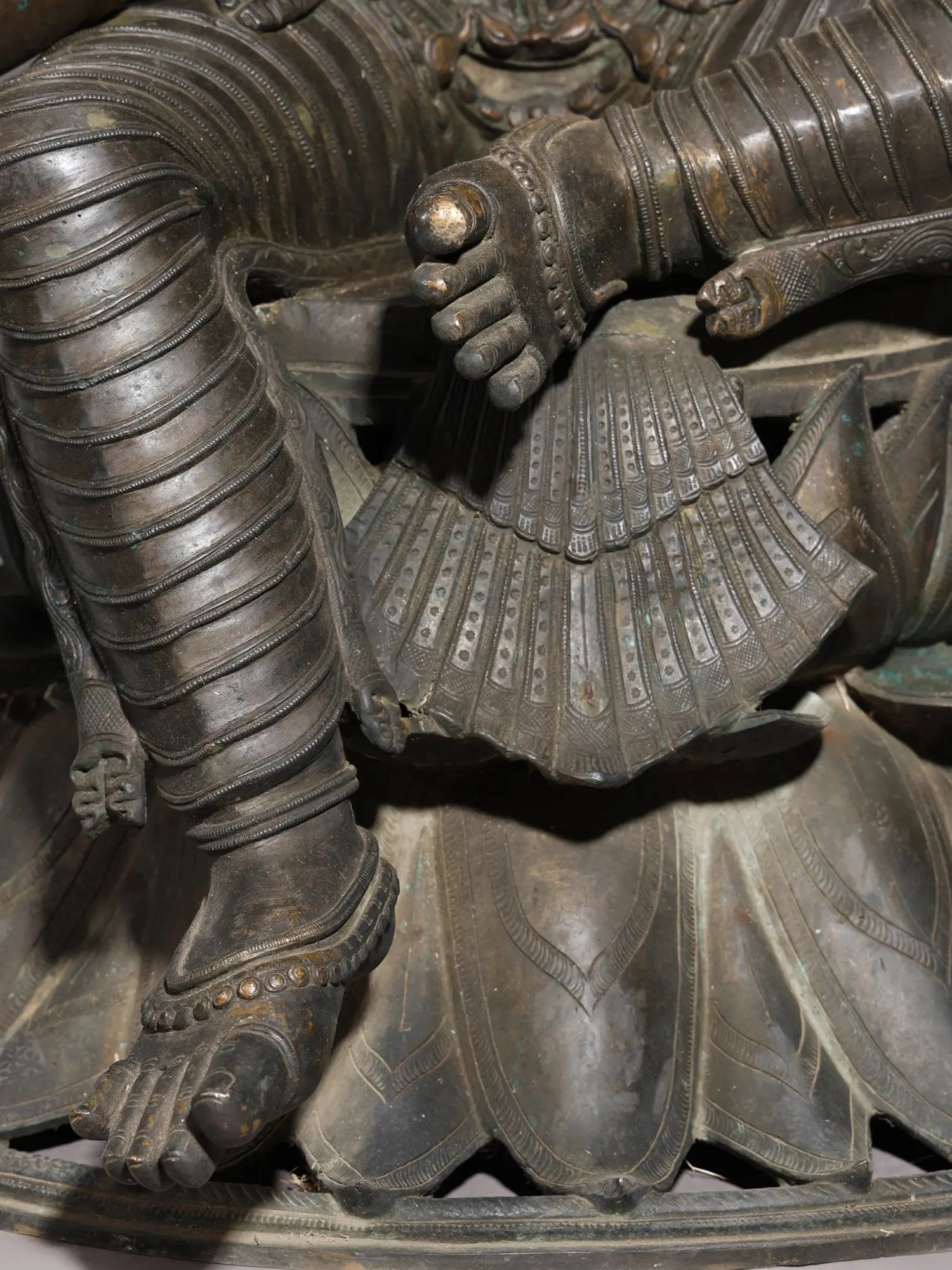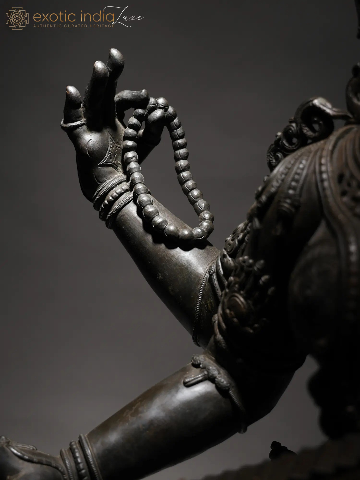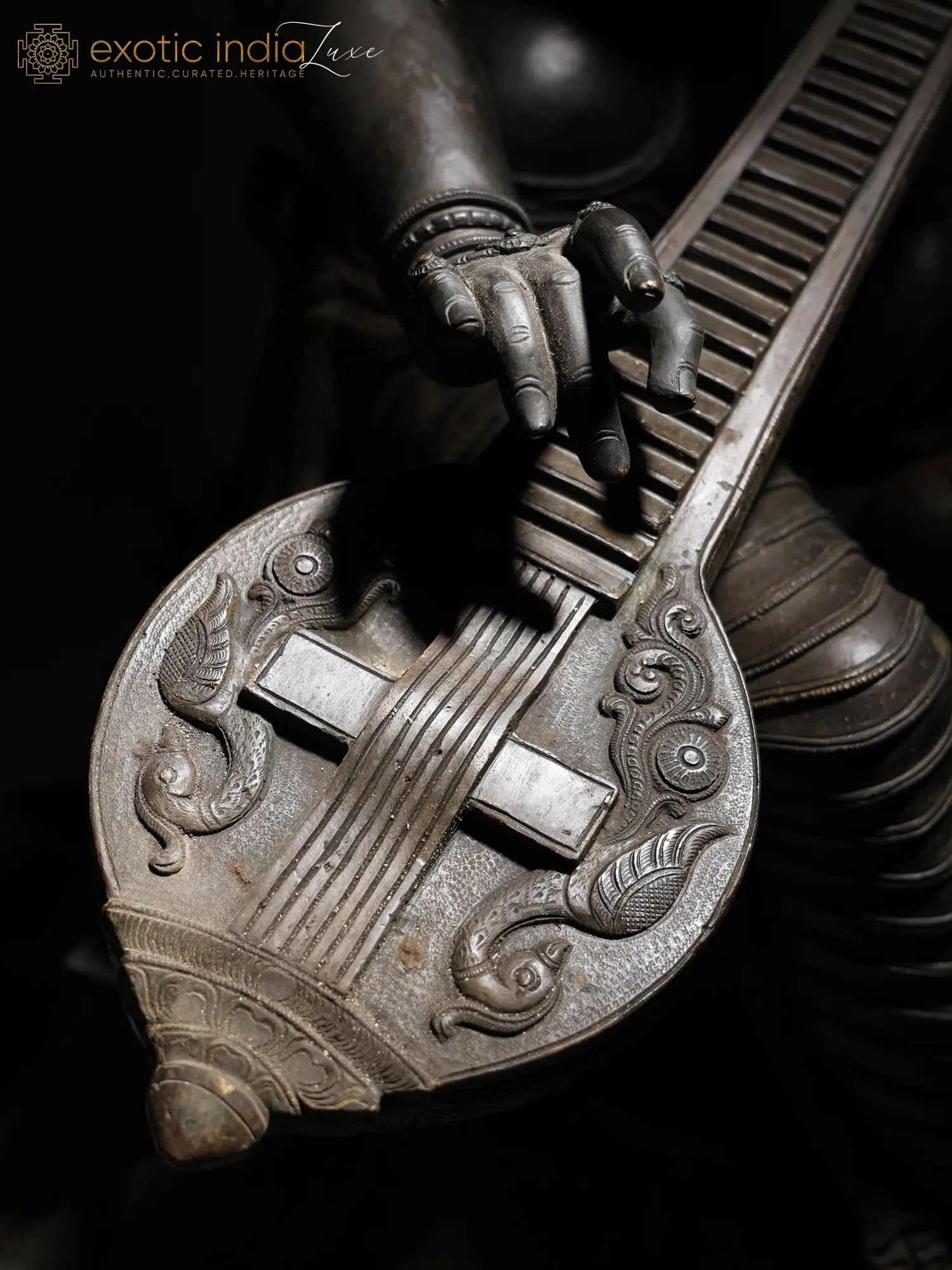Behold the resplendent form of Goddess Saraswati, a supreme embodiment of wisdom, music, art, speech, and learning. This magnificent bronze sculpture captures her serene grace as she sits in lalitasana (a relaxed posture) upon a fully bloomed lotus, the symbol of purity, enlightenment, and spiritual awakening. Her divine presence brings forth the blessings of knowledge and creativity to all who seek her grace. This exceptional statue, cast in Panchaloha bronze, not only embodies the divine feminine but also encapsulates centuries of artistic tradition.