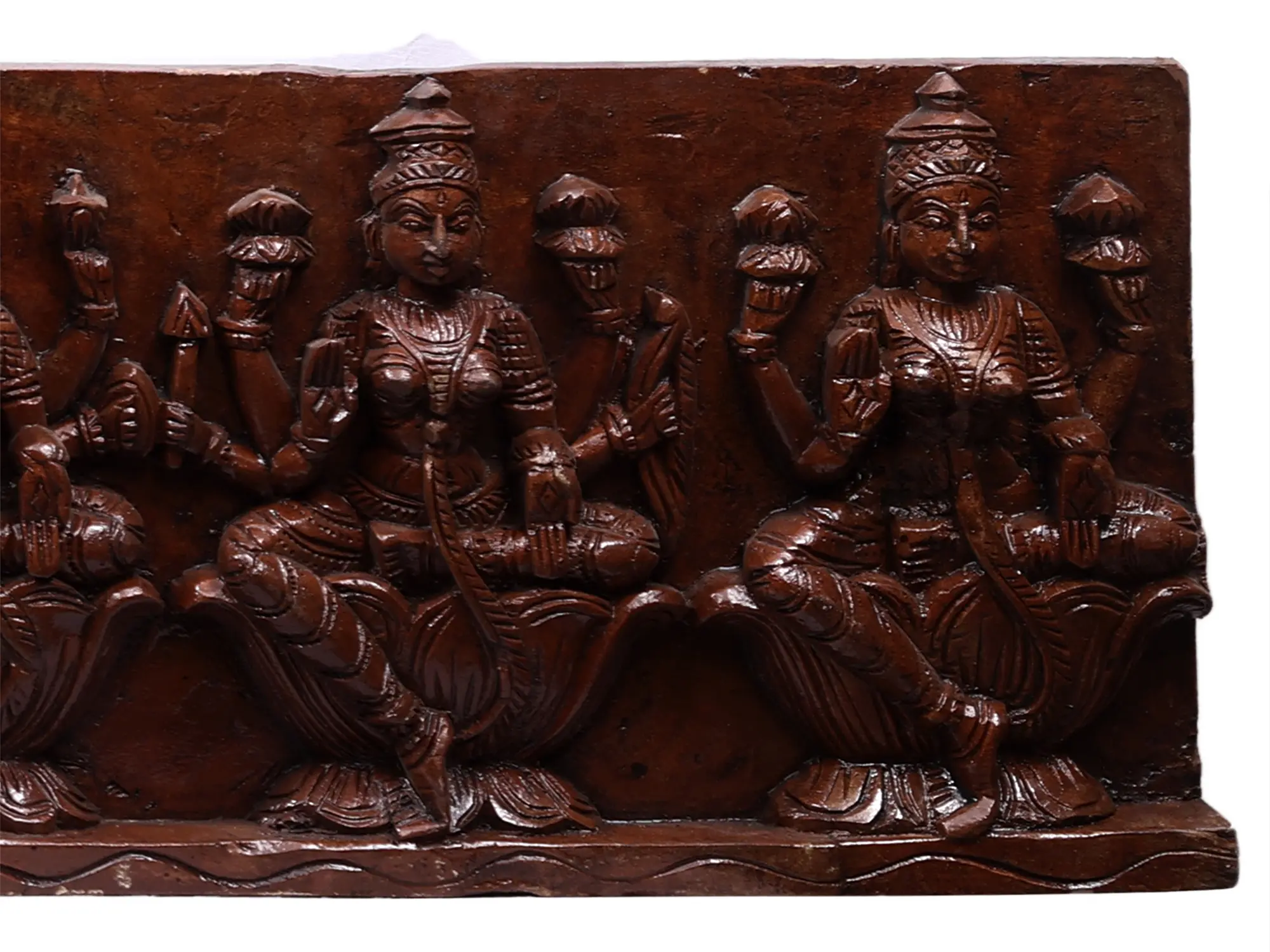 This magnificent wooden carving, a testament to the rich artistic heritage of India, depicts the revered Ashta Lakshmi, the eight divine forms of Goddess Lakshmi, the Hindu deity of wealth, prosperity, and good fortune. Each of the eight goddesses embodies a unique aspect of well-being, and their presence together signifies a holistic approach to abundance, encompassing not just material wealth but also spiritual fulfillment, courage, knowledge, success, progeny, and sustenance. This panel is more than just a decorative item; it is a conduit for blessings, designed to invite harmony and prosperity into any space it graces. The craftsmanship of this piece is truly extraordinary. Carved from high-quality wood, the panel showcases intricate details that bring each divine figure to life. From the serene expressions and elegant postures to the symbolic attributes held in their hands – such as lotuses, conch shells, and scriptures – every element has been meticulously rendered. The Ashta Lakshmi are depicted seated on blooming lotuses, a powerful symbol of purity, spiritual awakening, and self-creation, reflecting their cosmic origins. The depth and texture of the carving create a dynamic interplay of light and shadow, enhancing the divine aura of the figures and lending a sense of grandeur to the artwork.