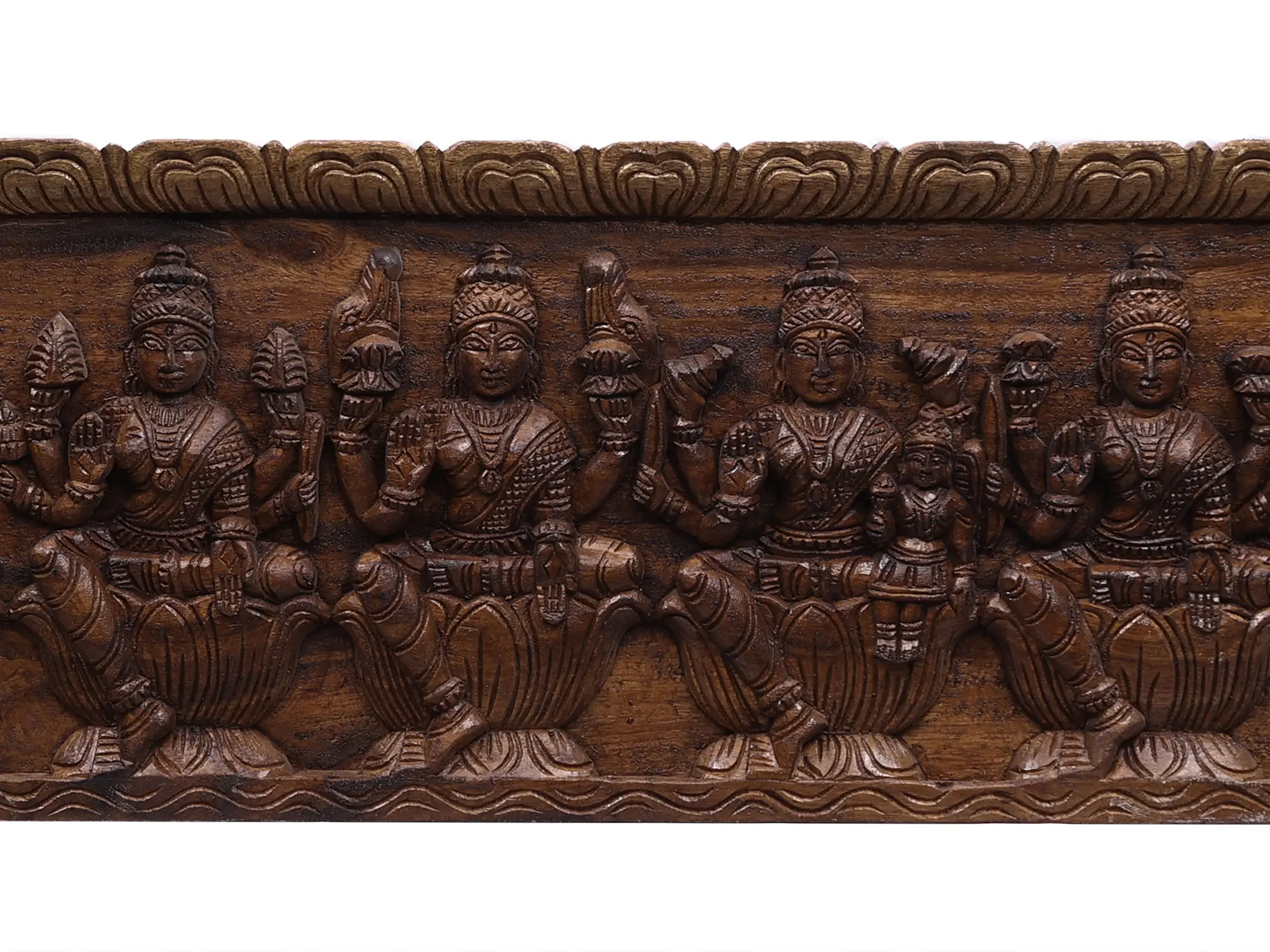 This imposing 48-inch wall panel is more than just a decorative item; it is a testament to the skill of traditional woodcarvers. The fine details in each goddess's attire, jewelry, and divine attributes are meticulously rendered, reflecting centuries of artistic heritage. The smooth finish of the wood invites touch, while the raised relief creates a sense of depth and presence. The decorative border surrounding the central motif adds a touch of elegance and frames the divine figures beautifully. This piece is designed to be a lasting treasure, imbued with spiritual significance and aesthetic appeal.