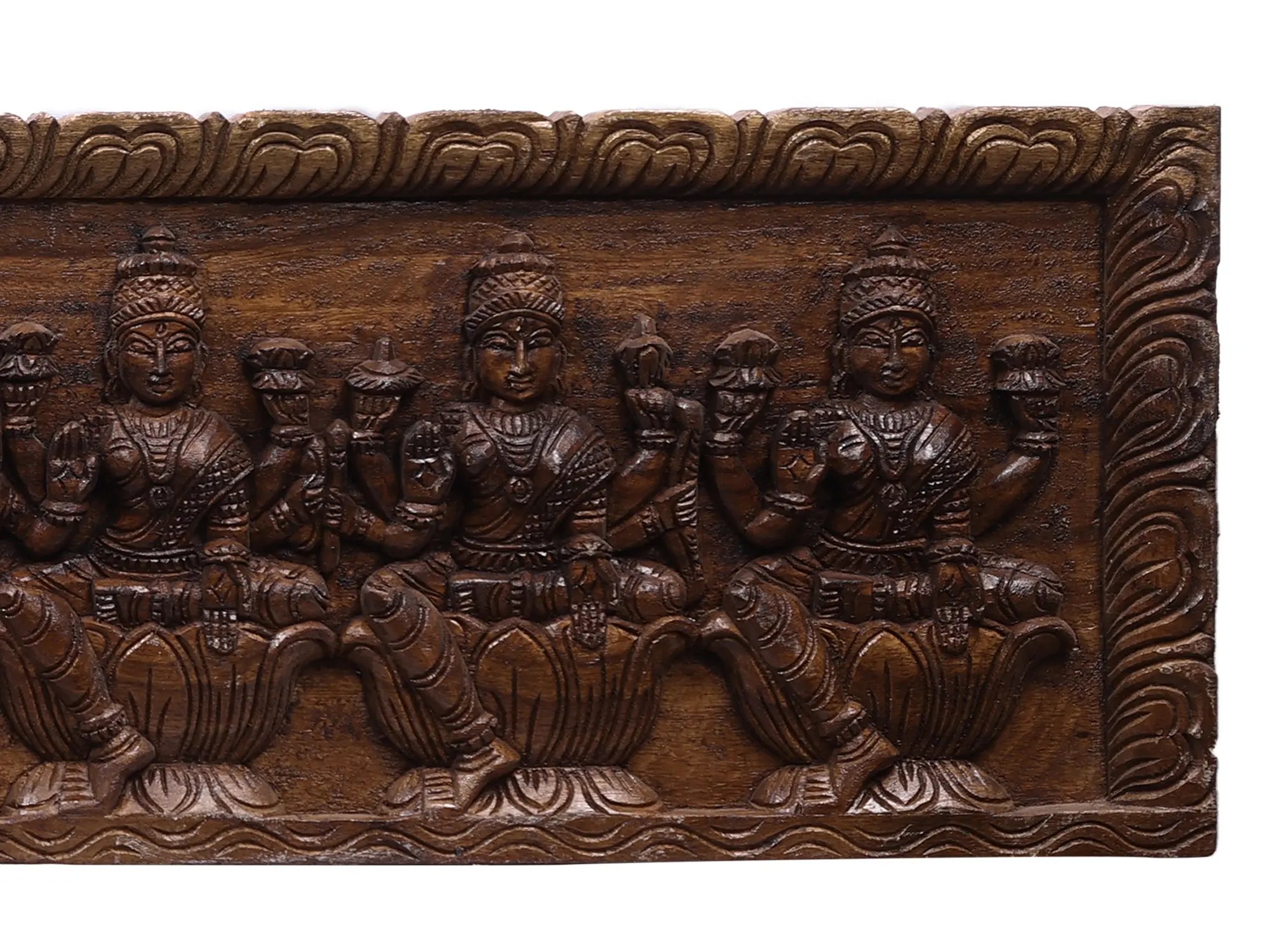 Invite the boundless blessings of prosperity, good fortune, and well-being into your home with this magnificent wooden wall panel depicting the revered Ashta Lakshmi. Each of the eight forms of Goddess Lakshmi, seated gracefully on individual lotus blossoms, is intricately carved, showcasing the artistry and devotion poured into this sacred piece. The rich, dark wood lends an air of ancient tradition and spiritual gravitas, making this panel a captivating focal point for any space. The Ashta Lakshmi represents the eight forms of wealth: Adi Lakshmi (divine power), Dhana Lakshmi (wealth), Dhanya Lakshmi (agricultural wealth), Gaja Lakshmi (royal wealth), Santana Lakshmi (progeny), Vijaya Lakshmi (victory), Vidya Lakshmi (knowledge), and Dhana Lakshmi (riches). Together, they embody a holistic approach to abundance, encompassing not only material prosperity but also spiritual growth, strength, knowledge, and harmonious family life. In Hindu mythology, Lakshmi is the goddess of wealth and prosperity, the consort of Lord Vishnu. It is said that she emerged from the churning of the cosmic ocean (Samudra Manthan), carrying a lotus in her hand, hence her association with this sacred flower. Her presence is believed to bring good luck, wealth, and auspiciousness.
