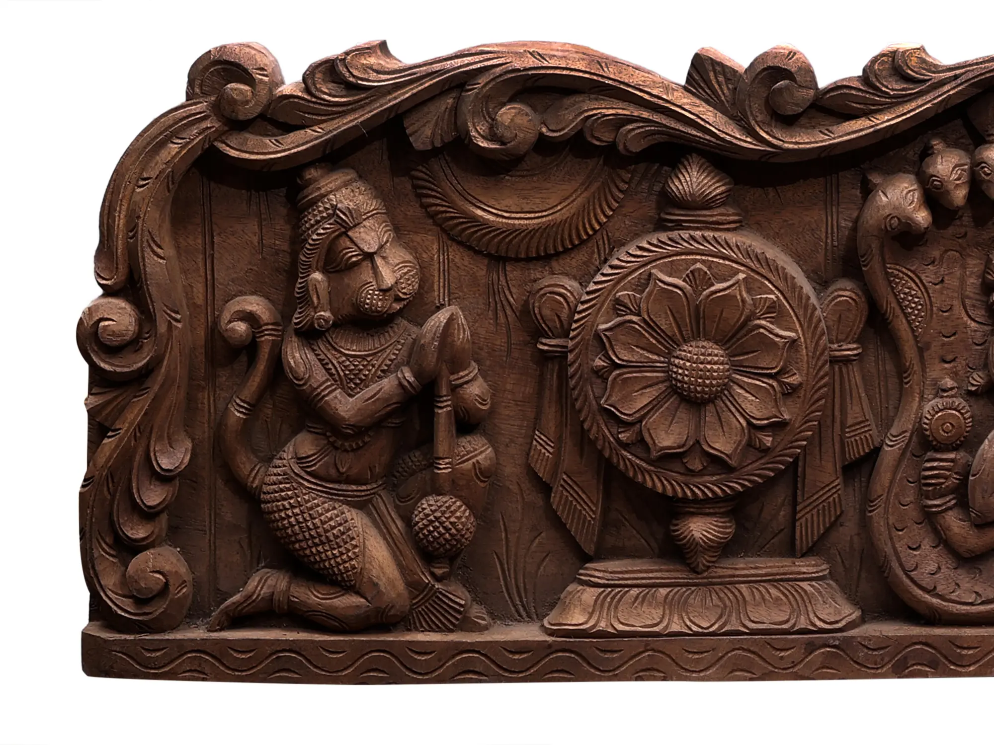 The craftsmanship of this panel is truly remarkable, with each figure and detail meticulously carved from wood, lending a warm, earthy texture to the artwork. The artist has skillfully brought to life the divine aura and the spiritual significance of the scene. The surrounding decorative motifs, including a prominent chakra (discus) on the left, a powerful symbol of Vishnu's weapon and the cyclical nature of time, and intricate floral patterns, add to the richness and artistic depth of the piece. This panel is not merely a decorative object but a sacred artifact, evoking a sense of peace, devotion, and the eternal grandeur of the divine. It serves as a powerful reminder of the cyclical nature of existence, the triumph of good over evil, and the divine protection offered by Lord Vishnu and his devoted retinue.