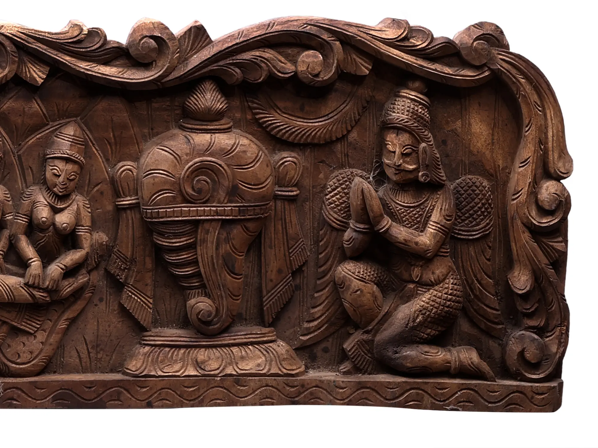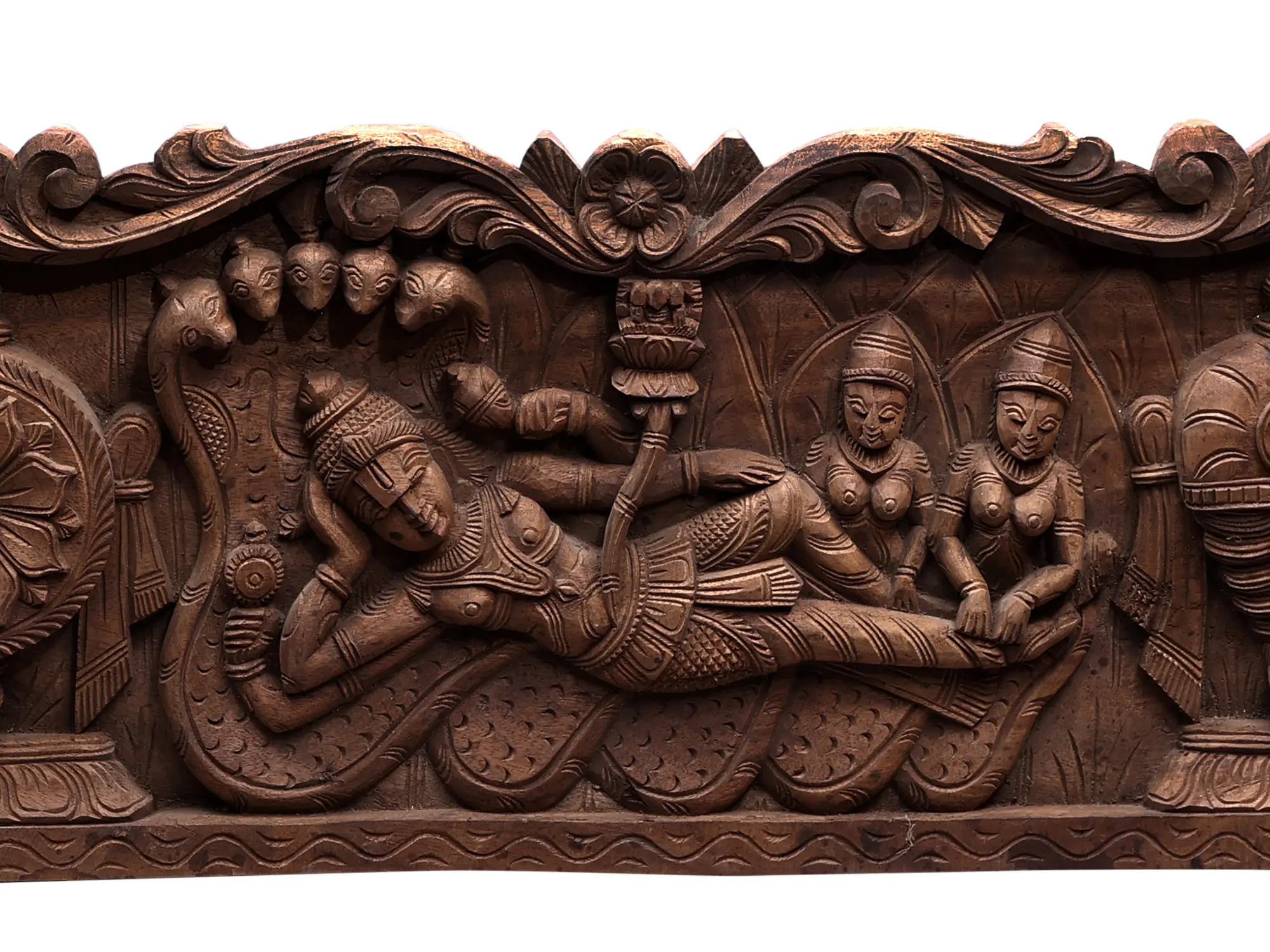 This magnificent wooden panel depicts a profound moment in Hindu cosmology: Lord Vishnu in his cosmic repose, known as Shesha-Shayi. Resting upon the coils of the primordial serpent, Shesha Naga, whose hoods form a protective canopy, Lord Vishnu embodies the eternal calm that precedes creation. This divine posture symbolizes transcendence, infinite consciousness, and the sustenance of the universe. The intricate carving captures the serene countenance of the preserver of the cosmos, a central deity in Hinduism, who appears in various avatars to restore dharma and cosmic order.