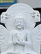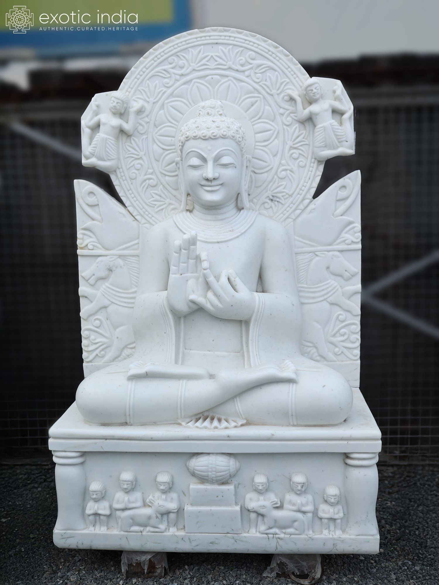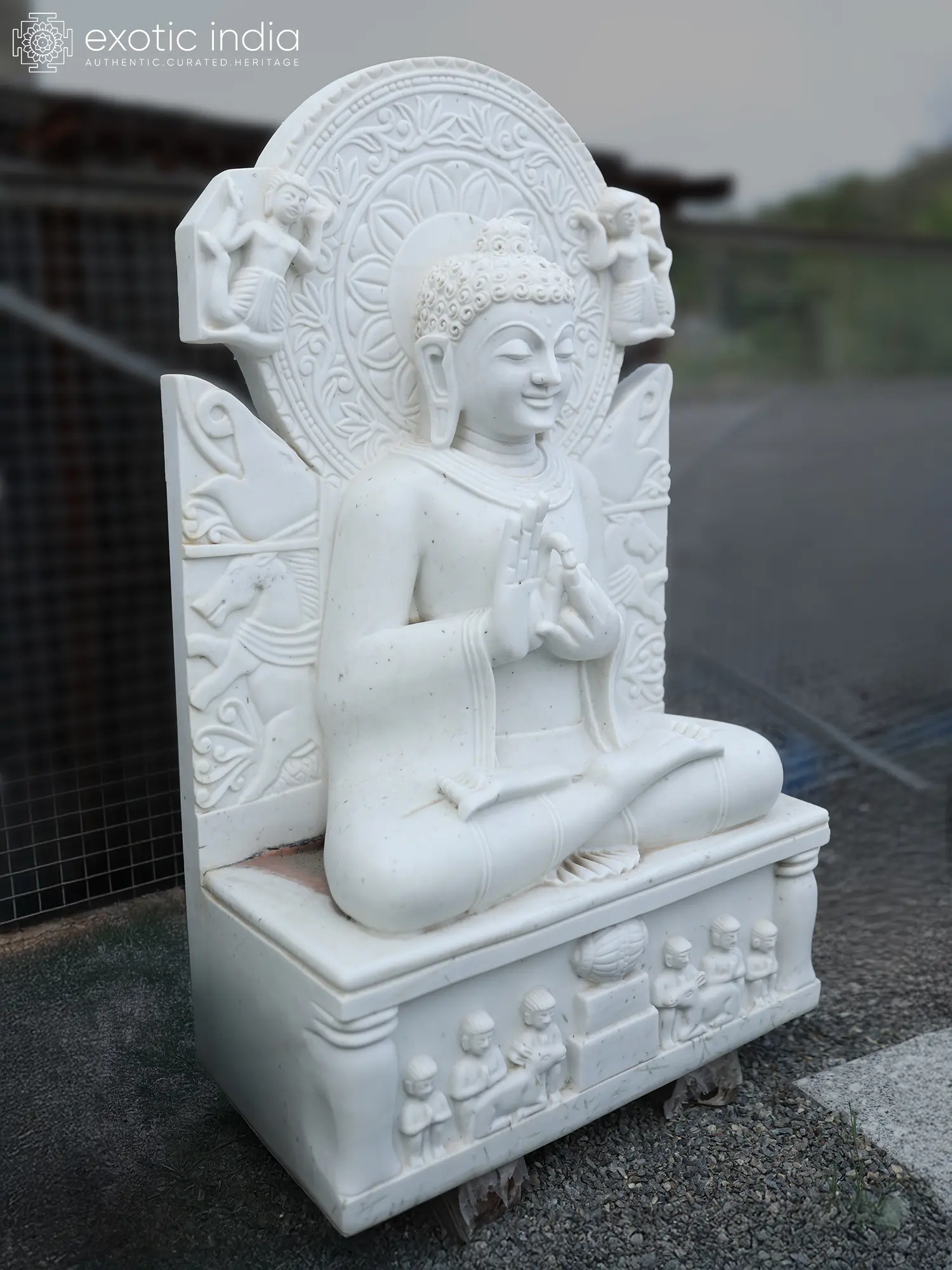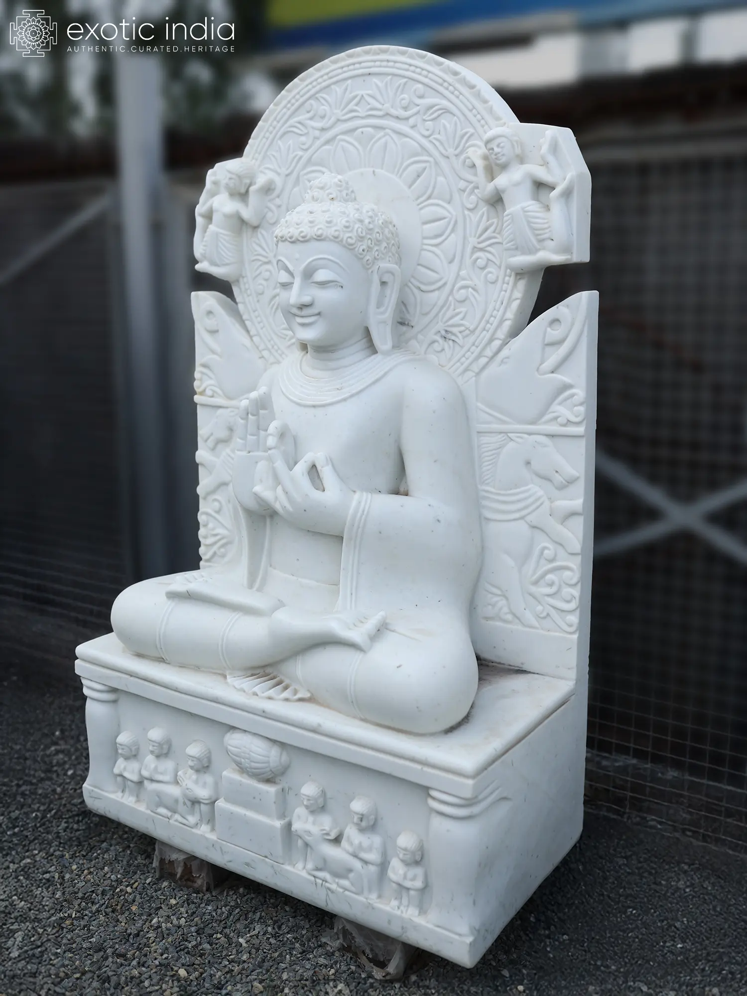 The Dharmachakra Mudra, with hands pressed together in a gesture symbolizing the turning of the Wheel of Dharma, is rendered with exquisite detail, conveying a powerful message of teaching and spiritual awakening. Observe the delicate folds of the robe, the gentle smile gracing the lips, and the intricate circular motif of the aureole, all enhanced by the lustrous quality of the marble. These elements contribute to an overall impression of grace and divine presence, promising a captivating visual experience.
