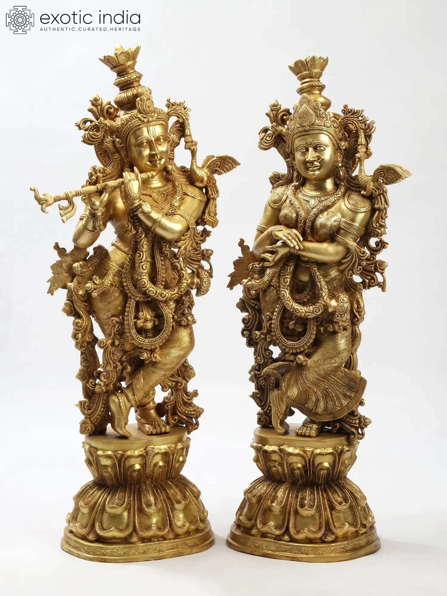 The lovers of Vrindavan have stood the test of time and adharma. Here stand Vishnuavatara Krishna and His best beloved Radha. They are on discrete, identical pedestals, each resembling a pair of elongated lotus blooms joined together at the pistil. Petals engraved in a layered fashion.