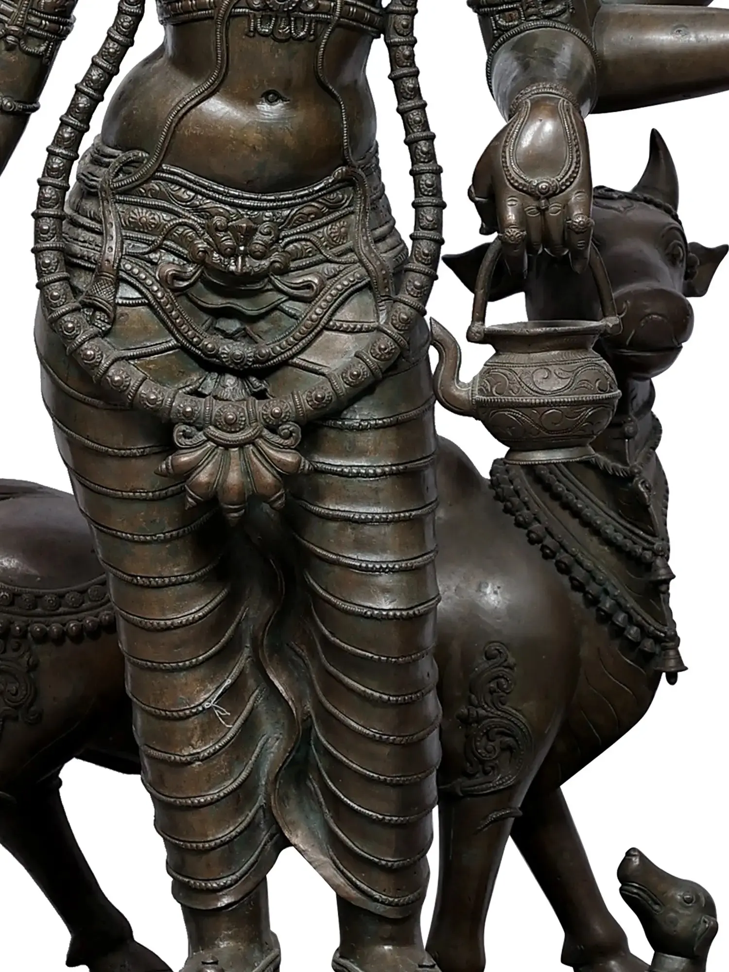 The intricacies of the jewelry and the attire are so projecting that the statue transcends the material world, enabling the devotee to experience the real presence of the deity. There are other elements around the main image of Dattatreya that require inspection. The presence of Kamdhenu signifies abundance. The little dogs that sit about Dattatreya's feet attest to his status as a form of Lord Bhairava. The mix of artistic skill, spirituality, and cultural history revealed in this masterwork illustrates the timeless desire for comprehending the depths of existence and the eternal pursuit of truth.