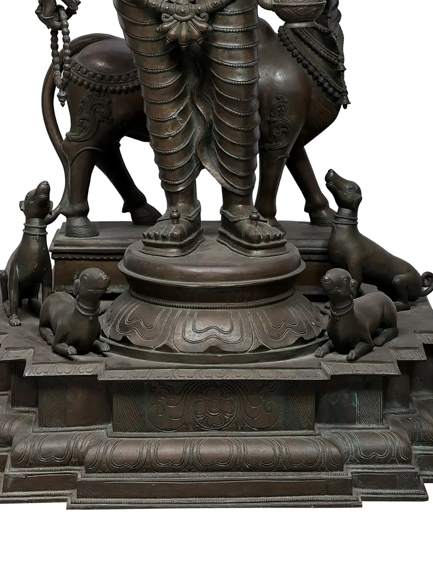 Central to the iconography of Dattatreya are his divine companions, the cow and the dogs. The cow, often identified with Kamadhenu, the celestial wish-fulfilling cow, symbolizes abundance, nourishment, and the fulfillment of desires. It also represents dharma, the cosmic law and righteous conduct. The four dogs flanking Dattatreya represent the four Vedas – Rigveda, Yajurveda, Samaveda, and Atharvaveda – the foundational scriptures of Hinduism. Their presence signifies Dattatreya's embodiment of all divine knowledge and wisdom. This statue masterfully portrays these companions, their forms rendered with lifelike detail and dignified presence, underscoring their integral role in the deity's narrative. ––––––––––––––––––––