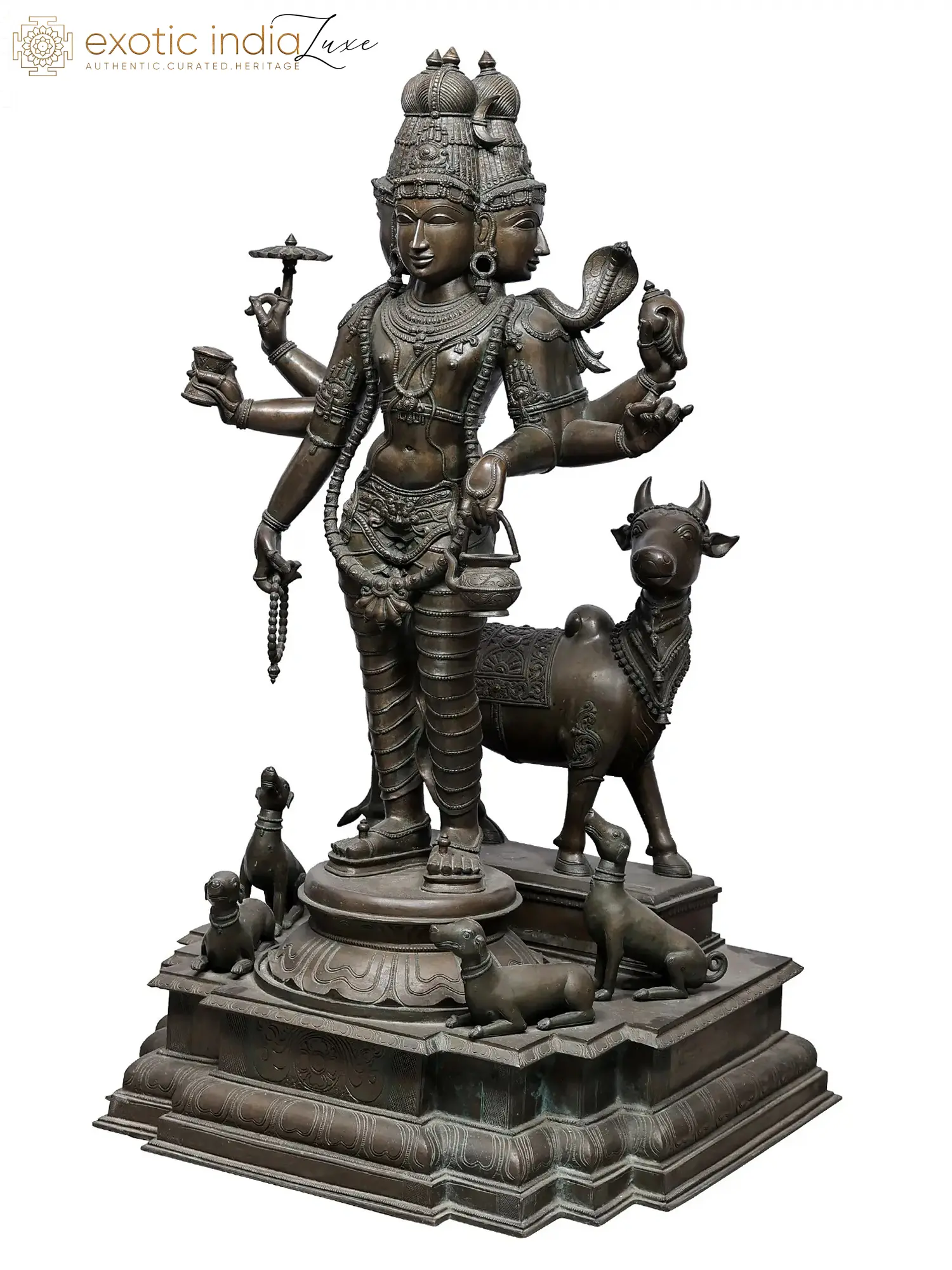 This magnificent statue captures the profound spiritual essence of Lord Dattatreya, a revered deity in Hinduism. As a synthesis of the Trimurti – Brahma, Vishnu, and Shiva – Dattatreya embodies creation, preservation, and destruction, representing the ultimate unity of the divine. His iconography is rich with symbolism, and this exceptional Panchaloha bronze rendition brings that symbolism to life with unparalleled artistry and detail. The statue stands as a testament to the skilled craftsmanship of Swamimalai artisans, renowned for their mastery of traditional South Indian bronze casting techniques. The use of Panchaloha, a sacred alloy of five metals (gold, silver, copper, zinc, and iron), imbues the sculpture with a unique luster and enduring quality, believed to possess spiritual potency.
