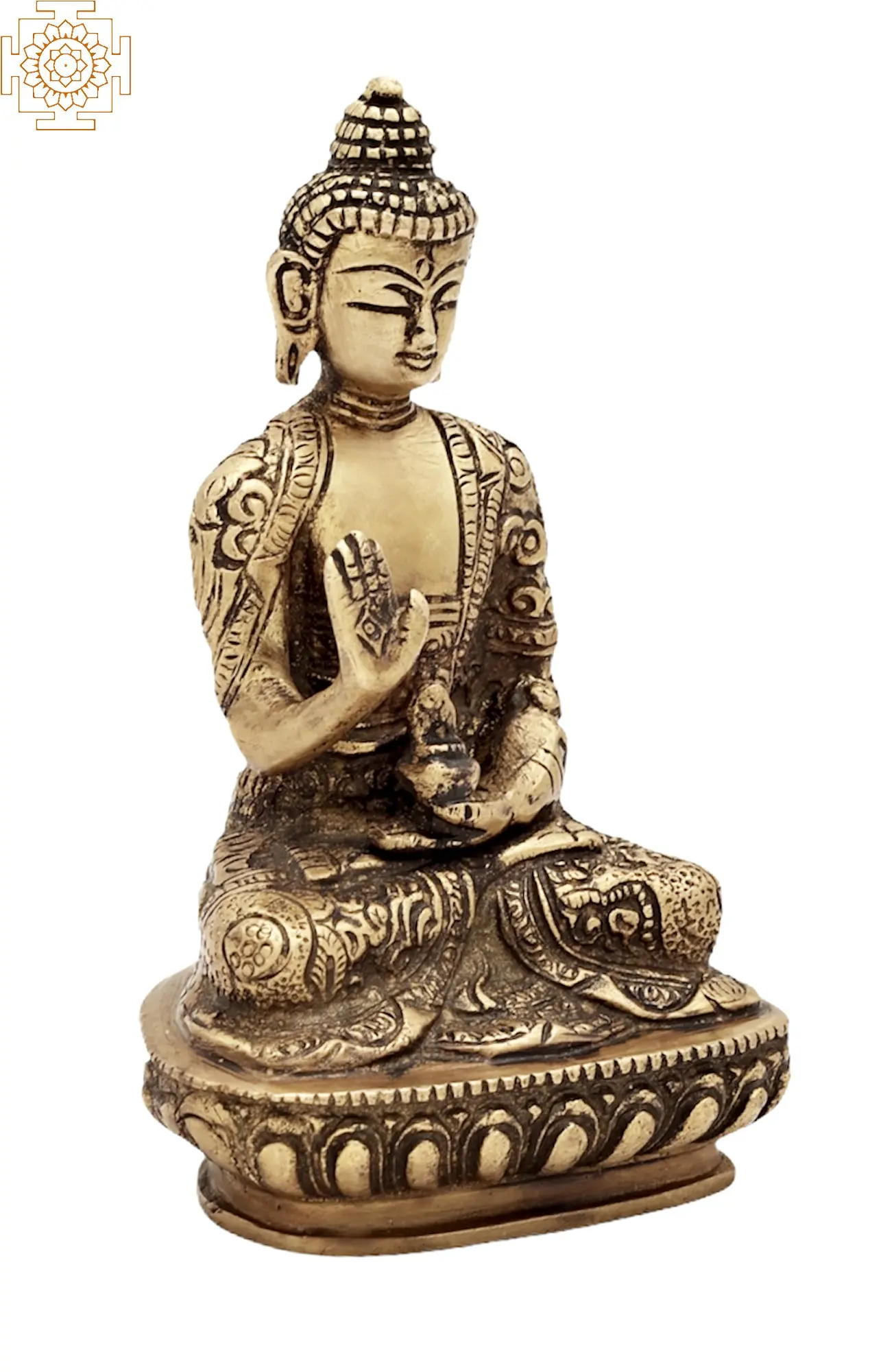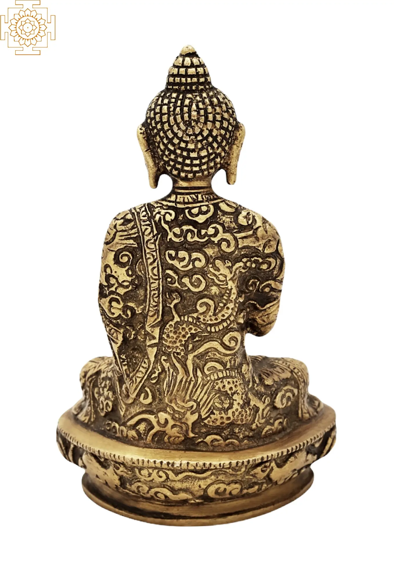 Gautam Buddha sits in a robe carved with simplicity, a profound contrast to his transformative teachings. His teachings, encompassed in the “Four Noble Truths” and “Eightfold Path”, echoed “Compassion” and “Enlightenment”. With gentle authority, Lord Buddha conveys the essence of his “Dharma”– the liberation from suffering through self-awareness and detachment. Crafted in brass with meticulous attention, this artwork invites you to embrace his wisdom, find solace in impermanence, and journey towards inner liberation on the path he illuminates.