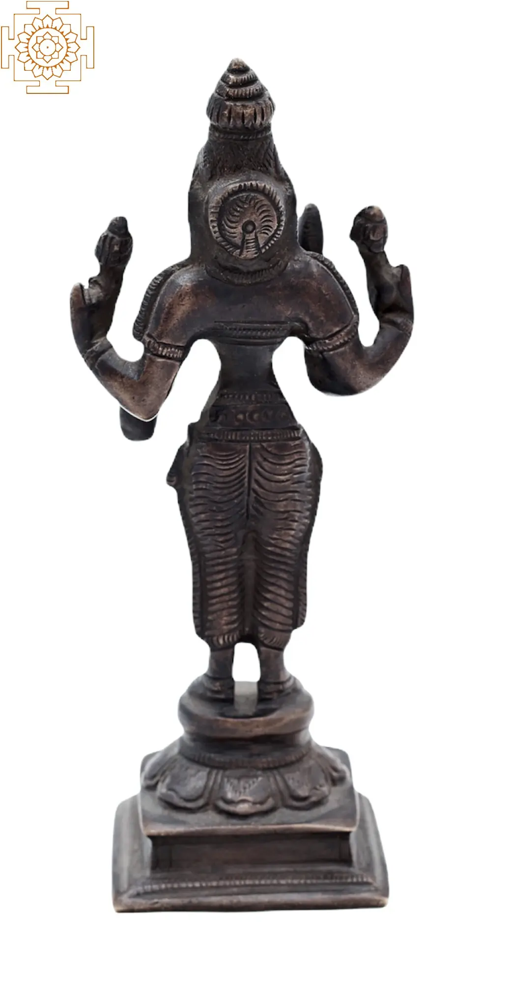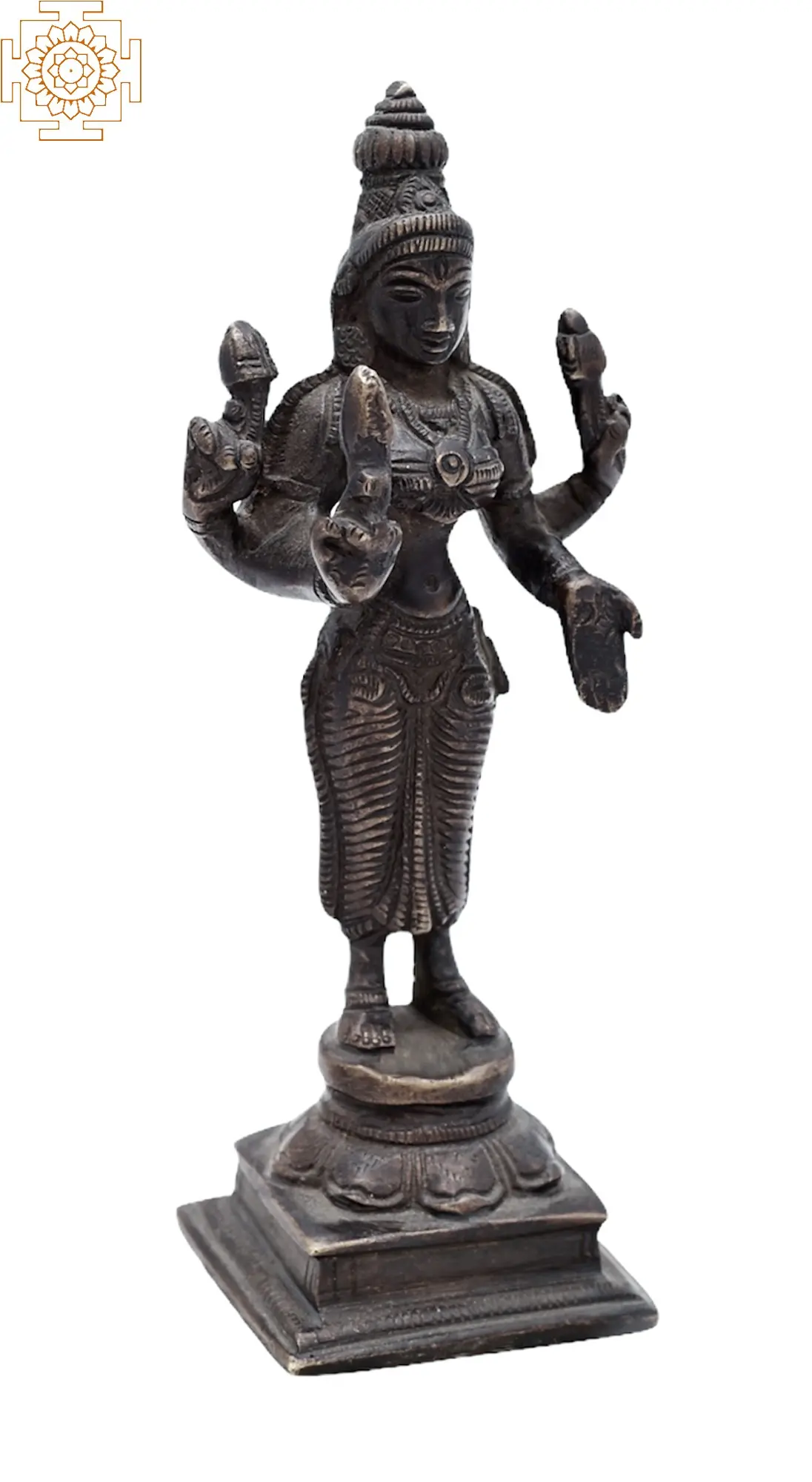 Emanating the glory of her divine roopa, embodying the zenith of feminine auspiciousness in her form, Devi Lakshmi enlivens this brass statue with her presence. Standing upright in a majestic posture, goddess Lakshmi in this small statue is Chaturbhuja, placed on a double-tiered lotus pedestal and has her primary hands in the gesture of giving boons and dispelling fear.
