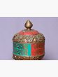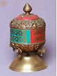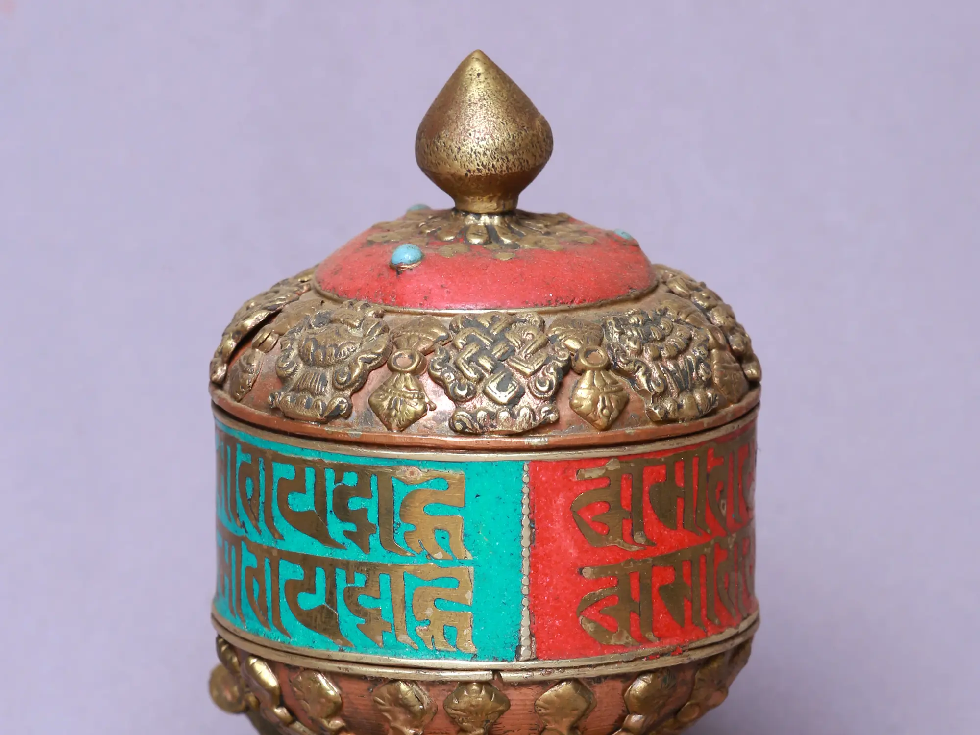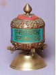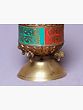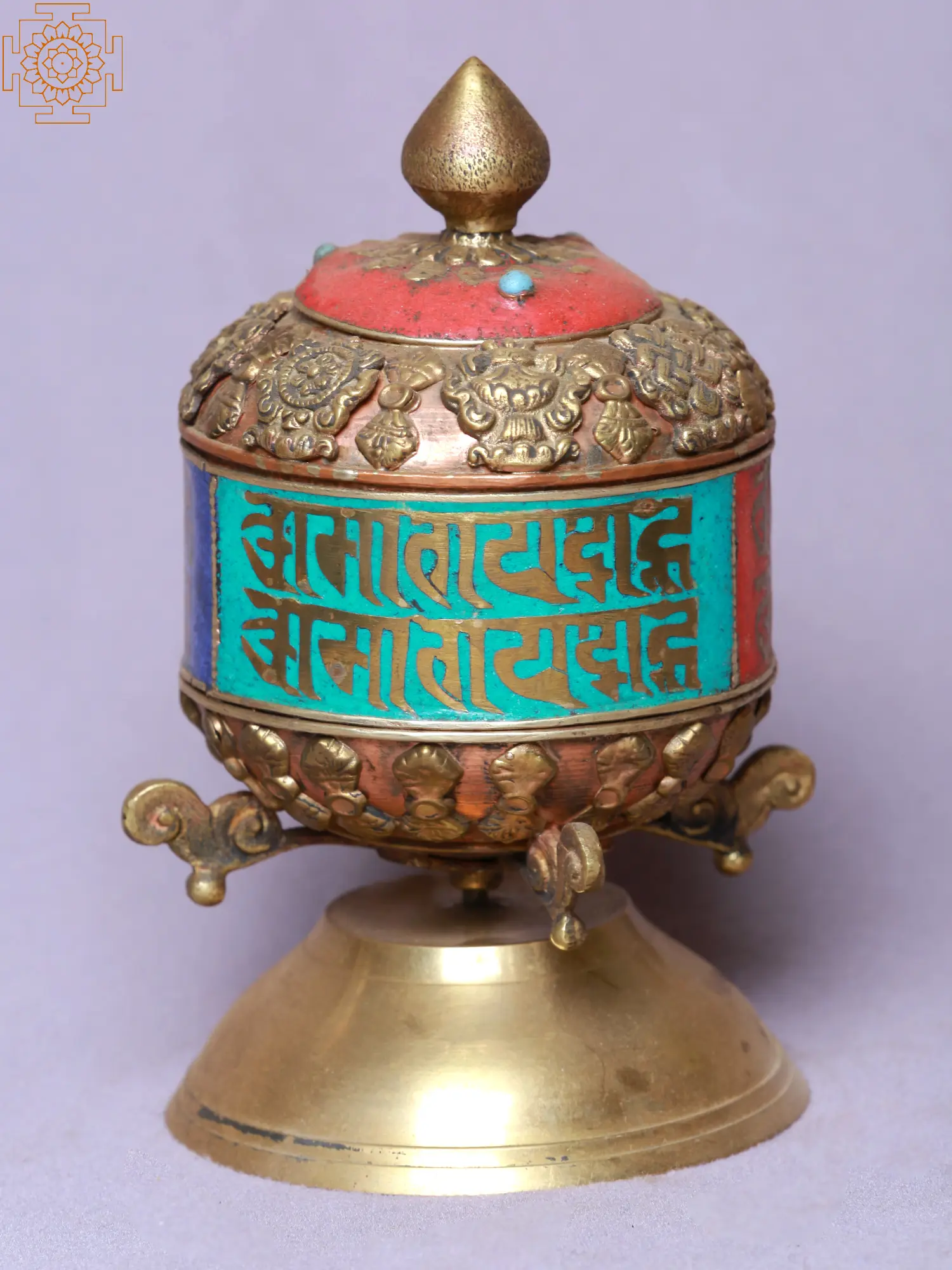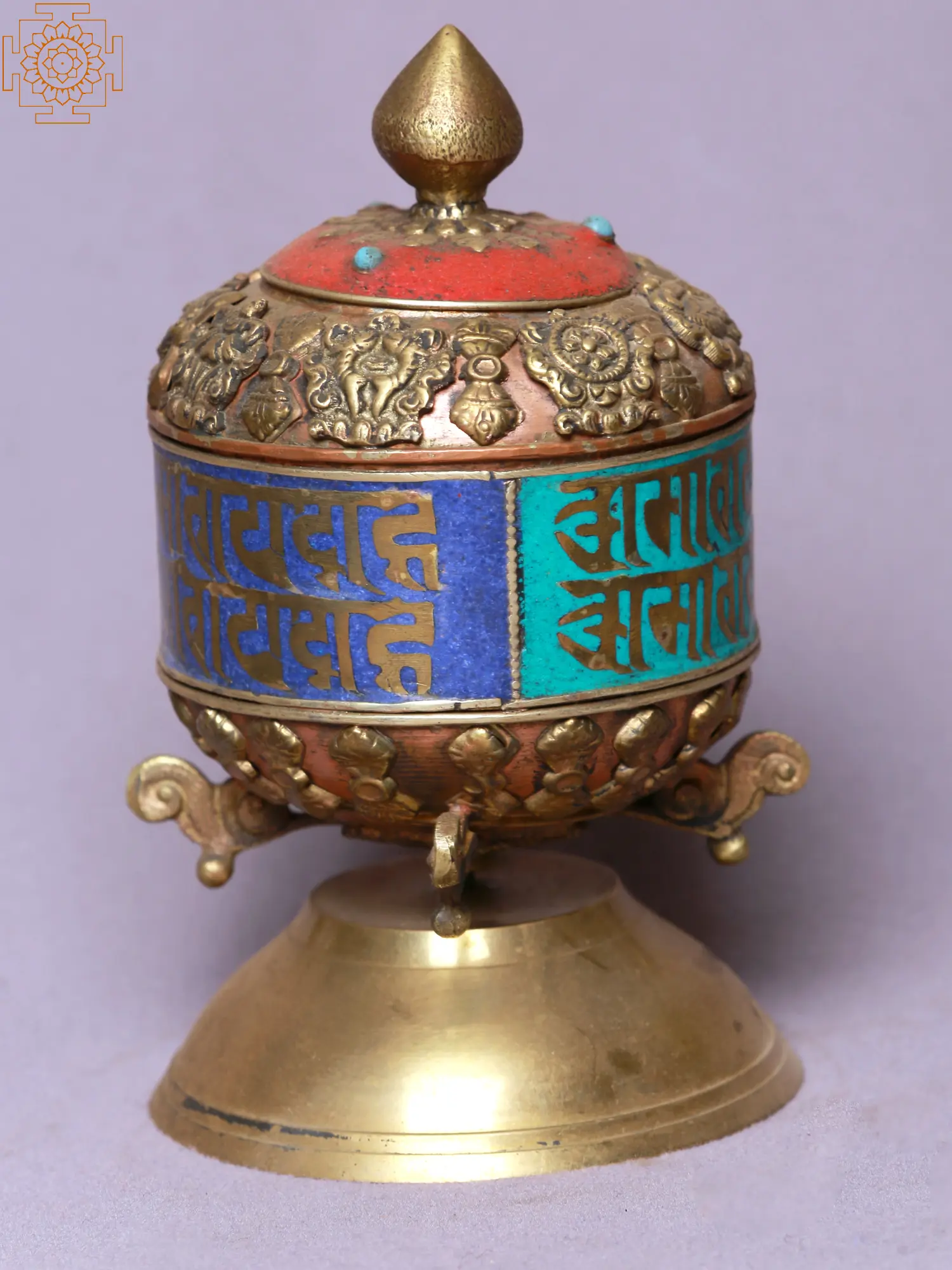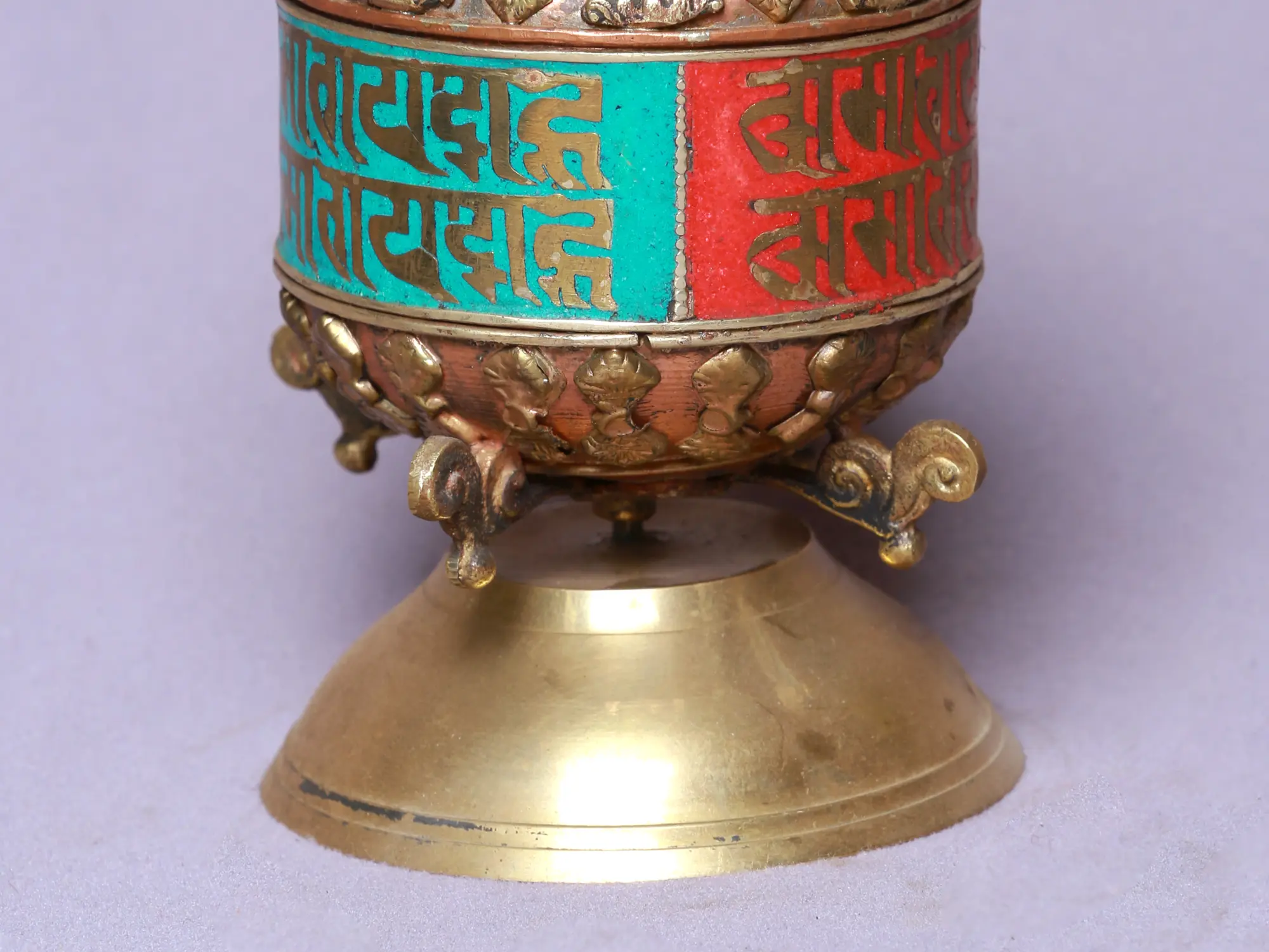 This Ashtamangala prayer wheel, which is made of copper and has beautiful stonework on it, exudes beauty and spiritual energy. It has a fascinating visual appeal because of the magnificent stones that embellish the ball-shaped design. The holy mantras and prayers that are housed within the wheel, according to believers, are released as it is rotated, creating blessings and good energy. This amazing work of art, which represents devotion and communion with the divine, inspires a spiritual journey of inner transformation and enlightenment. It is a cherished artefact in temples, monasteries, homes, and any sacred space because of its exquisite craftsmanship and spiritual significance.