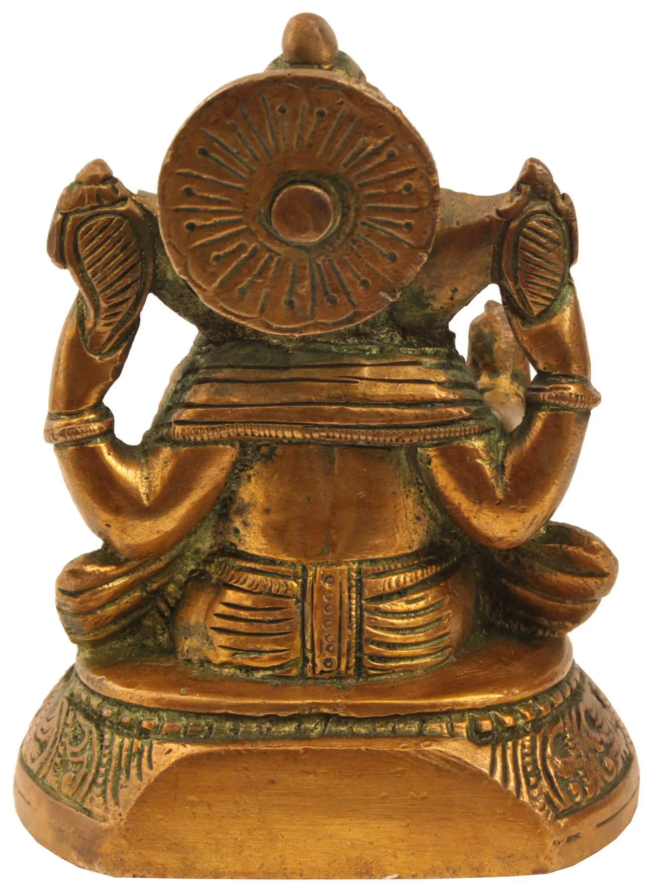 Upon an ornate podium, Lord Ganesha, also known as “Vinayaka”, reigns, a divine vision of childlike innocence and regal splendour. Seated in the enchanting Utkutakasana posture, his aura radiates tranquility. A trident (Trishul) mark adorns his noble brow, symbolising his cosmic might. With a benevolent right hand in “Ashirwad Mudra”, Ganesha bestows blessings upon all who behold him. Draped in opulent attire fit for a deity, He embodies majesty and grace. He indulges in Modak, the sweet delicacy symbolic of his affectionate nature. His generous form, with a cherished, rotund belly, embodies abundance and fertility. Crafted from lustrous brass, this masterpiece captures Ganesha’s divine essence, captivating hearts and souls with his presence.
