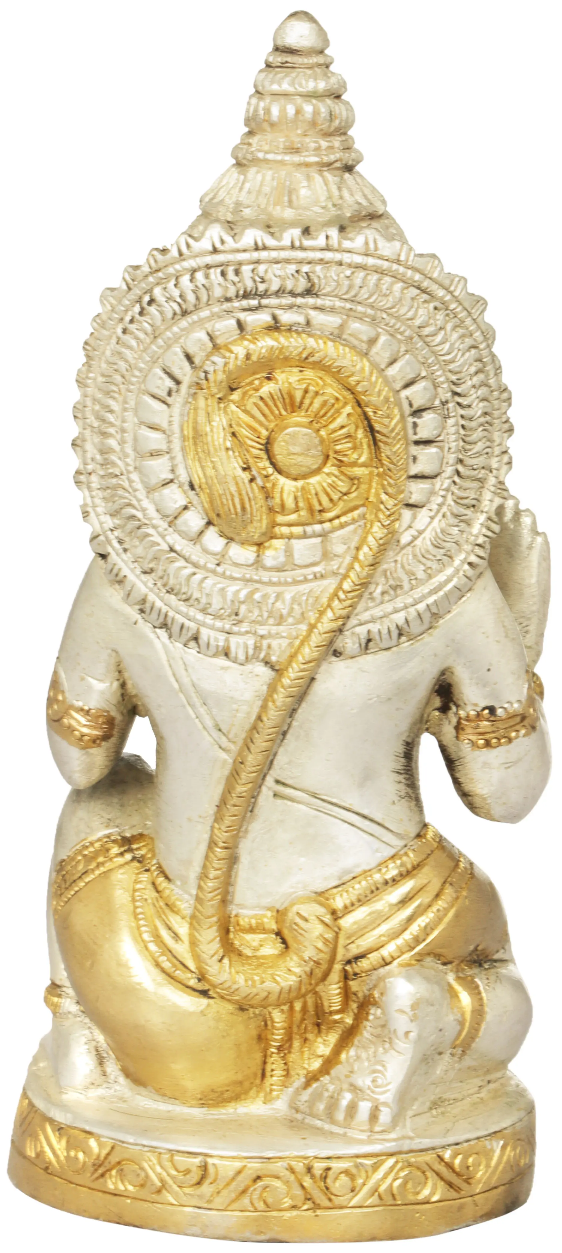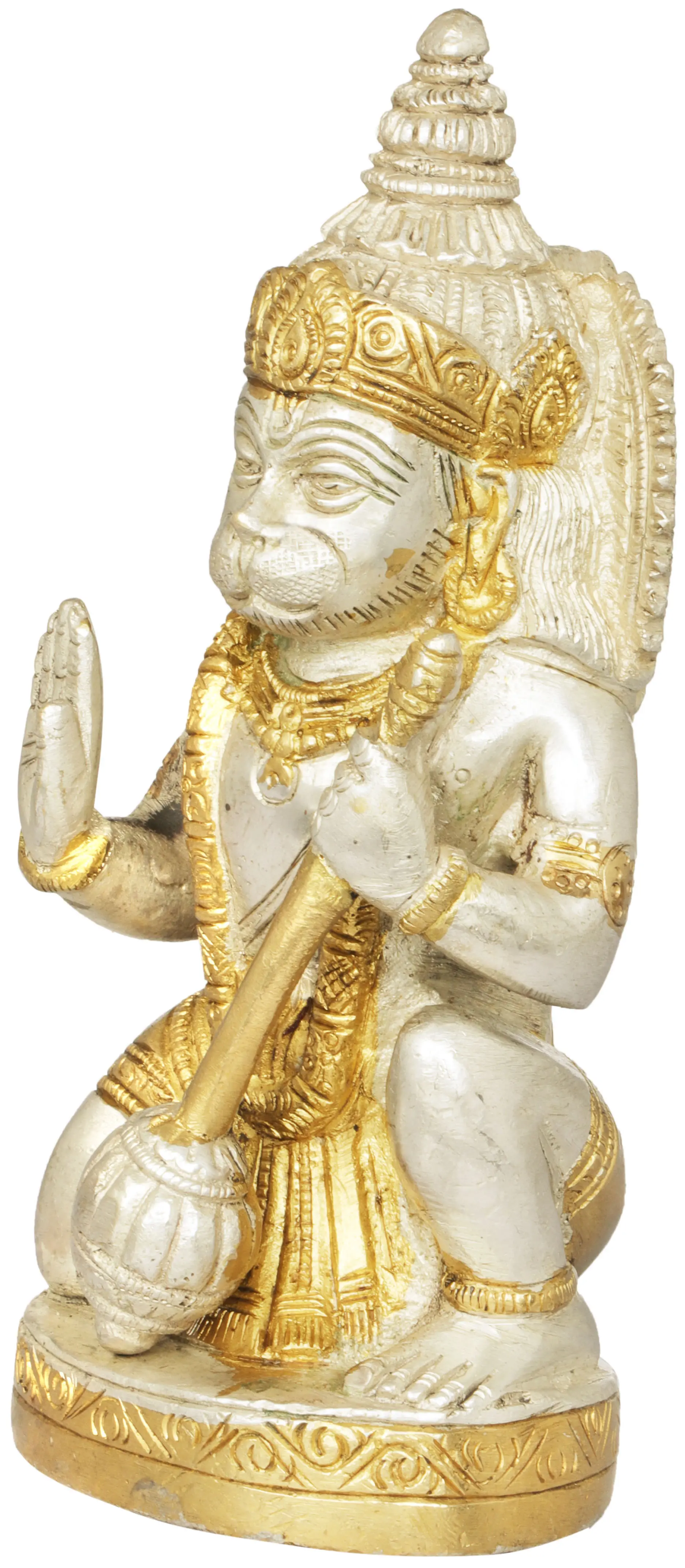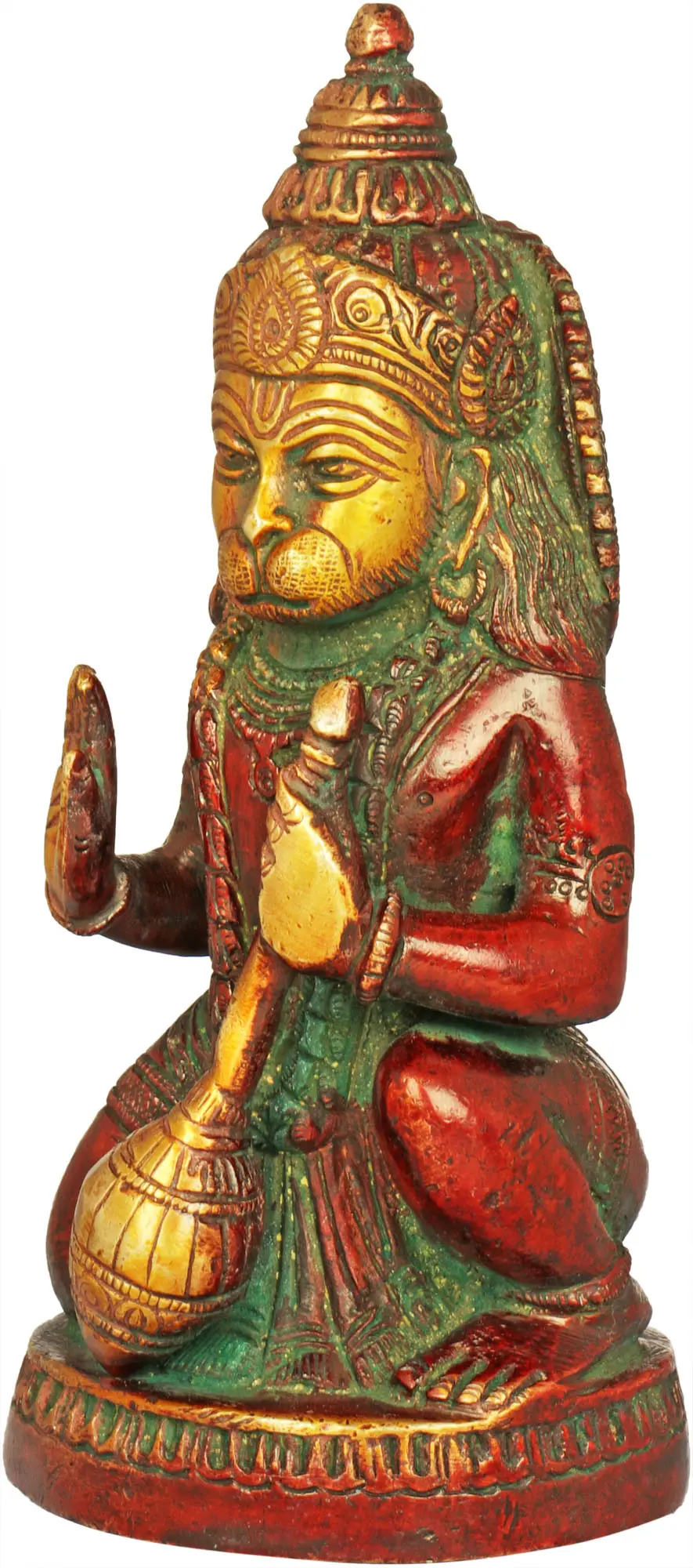 This Lord Hanuman statue, handcrafted with passion, is a beautiful representation of power and devotion. This masterpiece, handcrafted in India, depicts the courageous Hanuman in great detail, highlighting his steadfast commitment and indomitable spirit. The brass sculpture reflects the essence of the epic Ramayana, radiating heroism and divinity. This artwork pays attention to traditional artistry while embracing the eternal story of Hanuman's heroism, with every curve and shape carefully created. The brown and green patina on the statue gives it a dramatic look. The Siras chakra behind Lord Hanuman's head symbolizes the divine aura that the deity exudes. This sculpture transcends artistry as a symbol of triumph over hardship, as a reminder of heroic values and the strength of faith.
