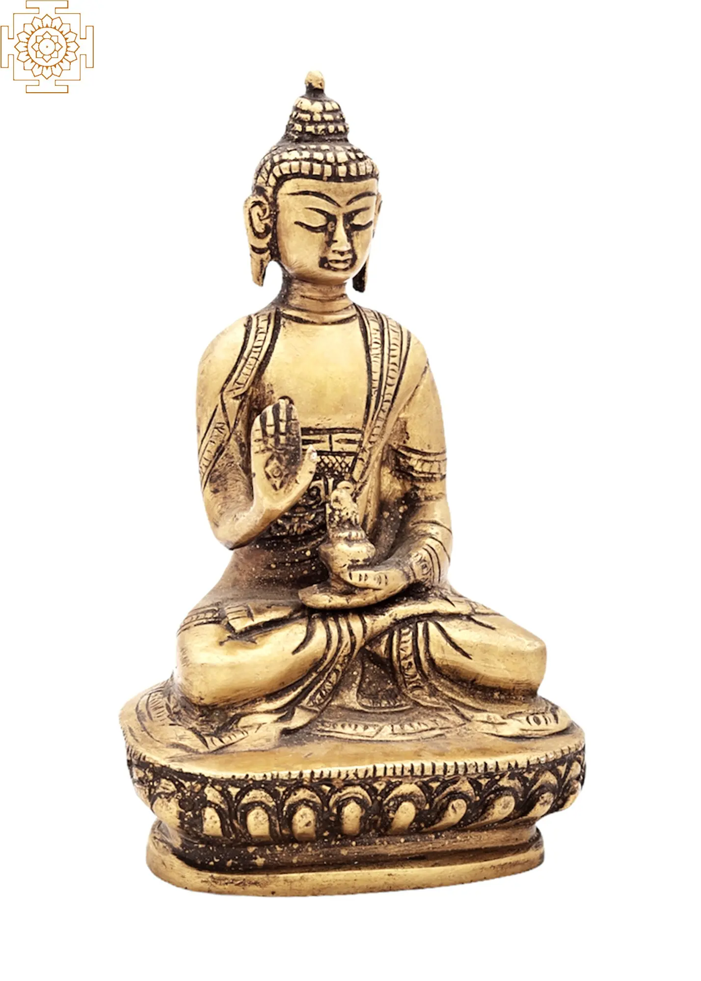 "Thousands of candles can be lit from a single candle, and the life of the candle will not be shortened." This aligns with the Blessing Buddha brass sculpture. Handcrafted with reverence, it captures the essence of Tibetan Buddhism. Seated in the Dhyana Mudra, his right-hand touches the earth, a gesture of enlightenment. On his left, he holds a bowl, symbolizing generosity. His eyes closed in meditation, Buddha radiates serenity. This sculpture reminds us to share the light of compassion and wisdom, for in doing so, our inner flame only grows brighter.
