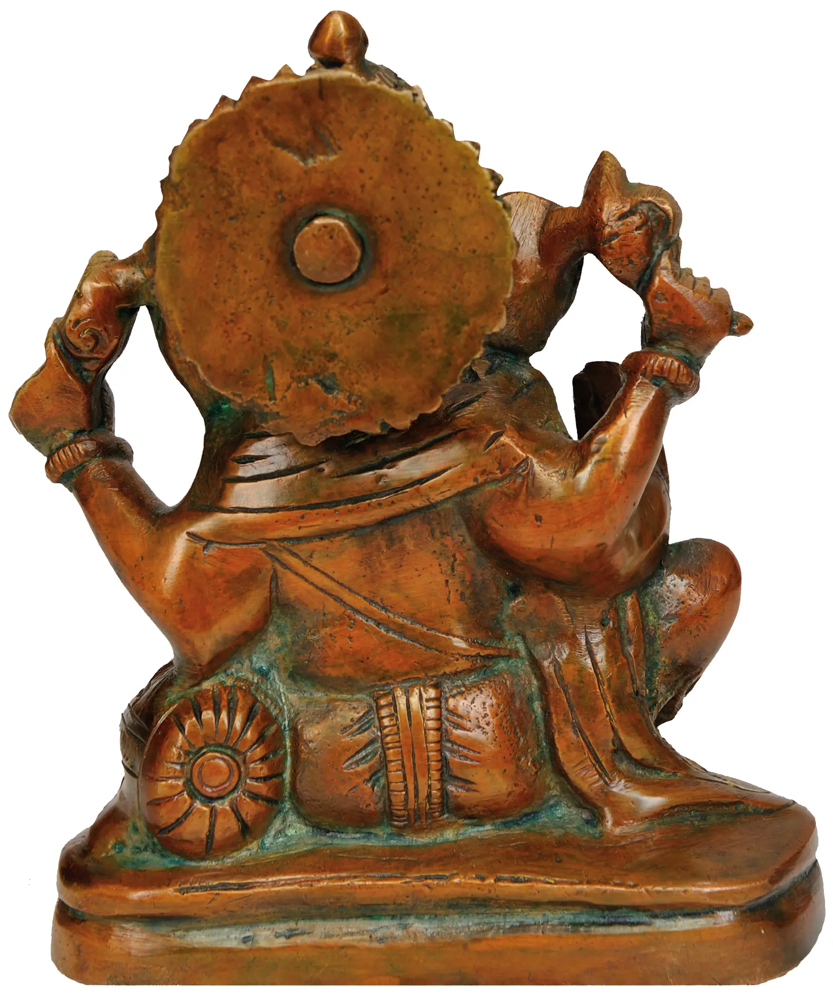 In the tranquil presence of “Lord Ganesha”, a masterpiece of art emerges. The divine form is a symphony of serenity and majesty, as He sits upon an adorned Asana, draped in regal attire that gleams with the brilliance of brass. His large ears, akin to the mighty fan of a lotus, attune to the whispers of the cosmos. Upon his all-encompassing trunk, the sacred “OM (Aum)” symbol glistens, a profound blessing in itself, granting spiritual serenity. In his upper hands, he wields the noose and goad, symbols of control over life’s challenges, while his right-hand gestures “Abhaya Mudra”, assuring protection. Adorned in jewels and a majestic crown, He is the epitome of divine grace, indulging in the sweet nectar of “Modak”, his chosen delicacy. This ethereal masterpiece invokes a sense of profound awe, reverence, and the unmistakable presence of a benevolent deity.