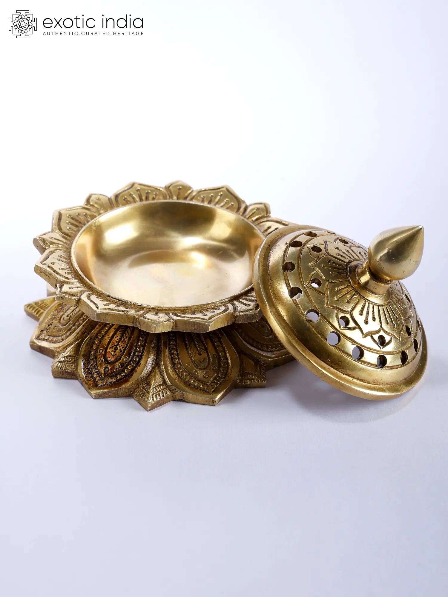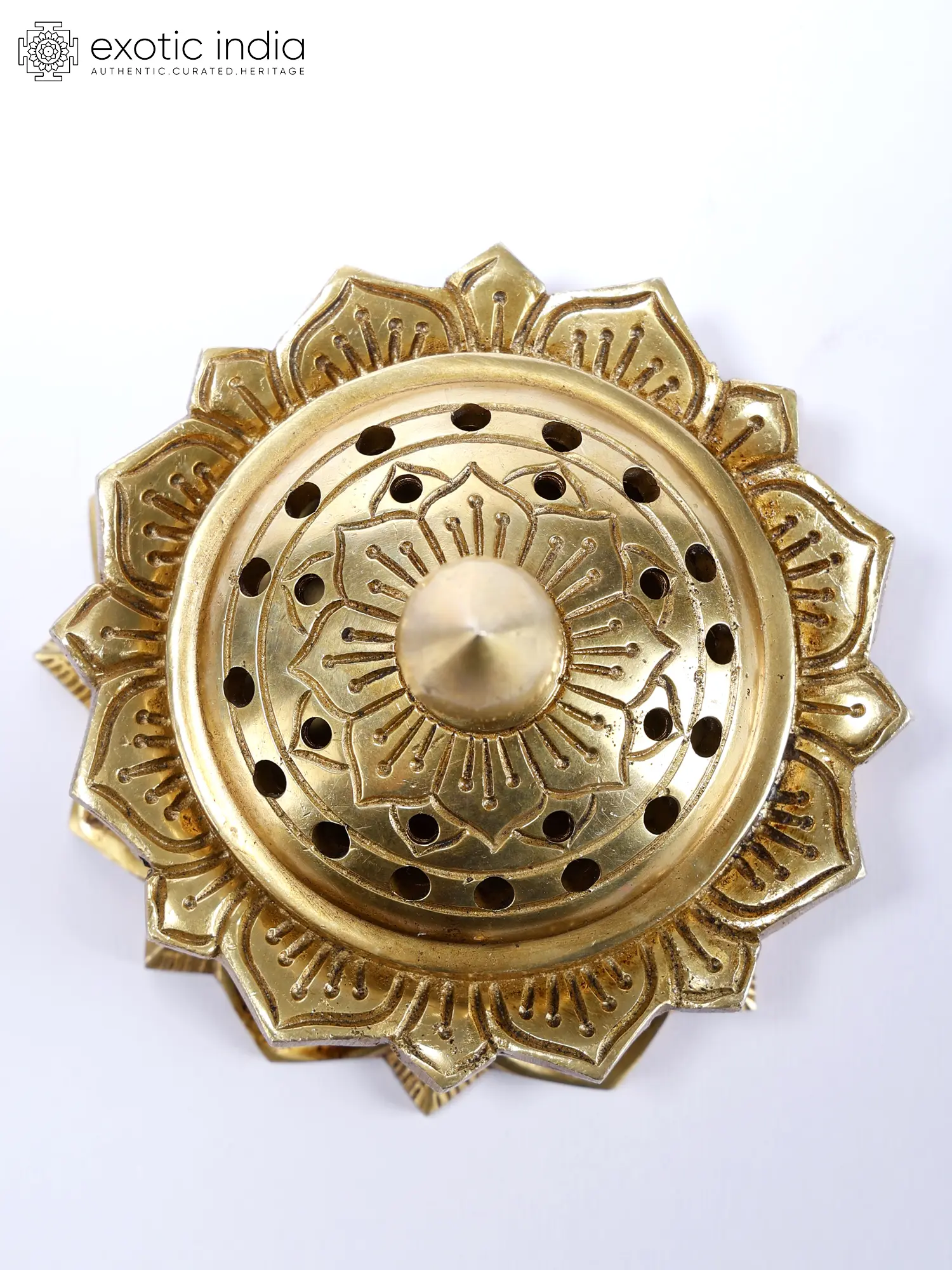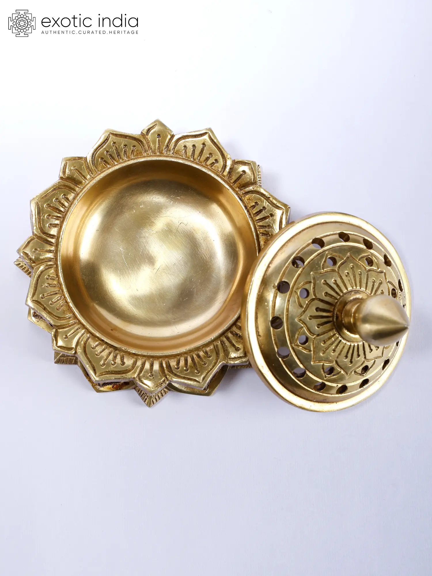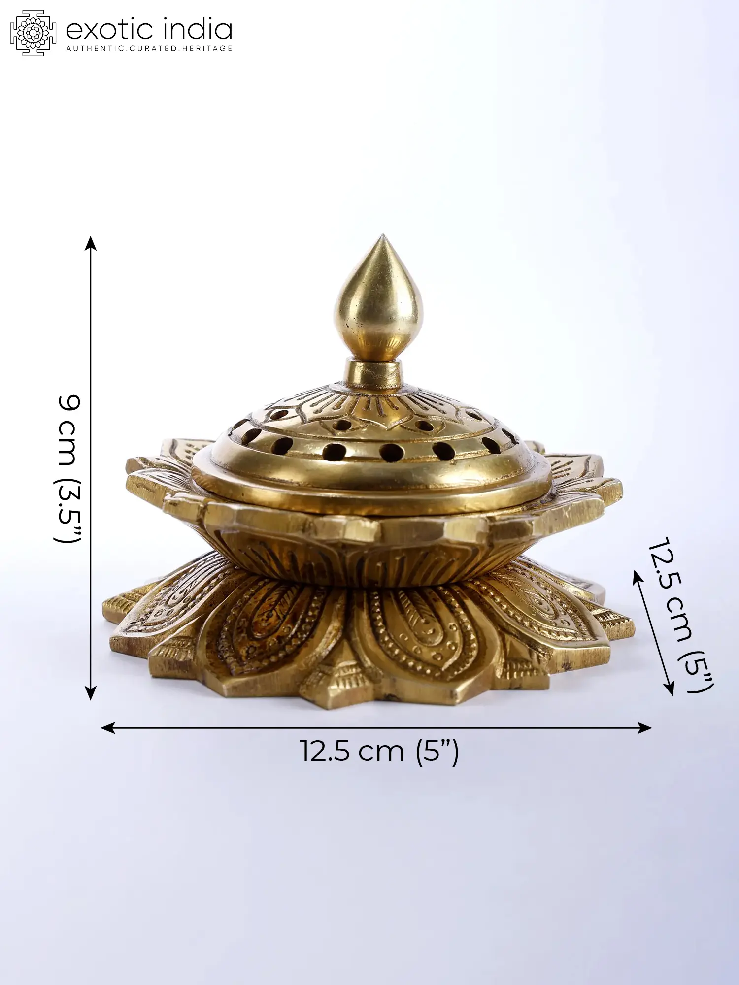 This Brass Dhoop Dani carries the sacred shape of a fully bloomed lotus flower, embodying the purity and divinity associated with the lotus. The lid of the Dhoop Dani has holes that assist in the delicate spreading of smoke, reminiscent of the gentle and serene nature of the lotus, enhancing the spiritual ambiance.