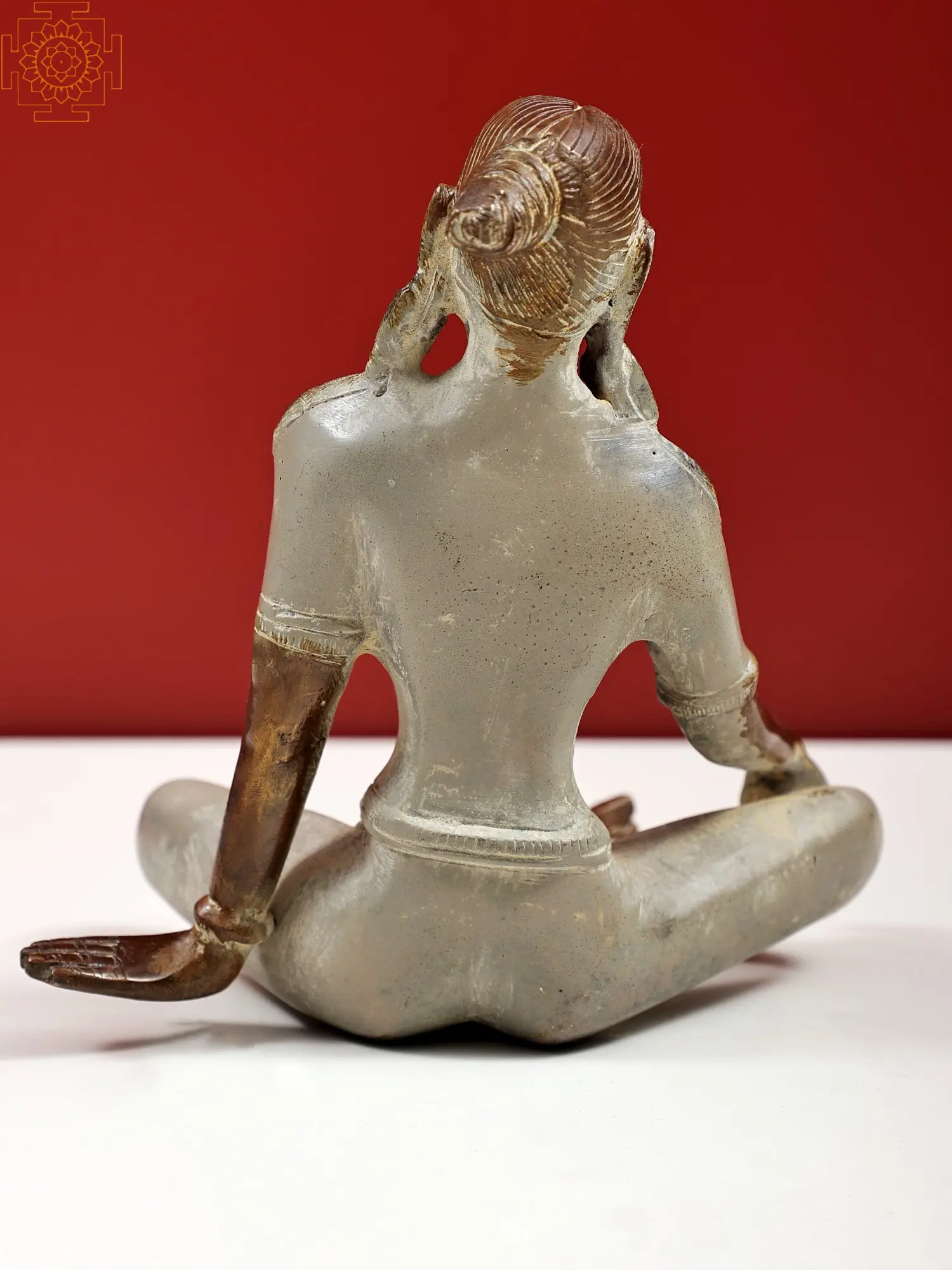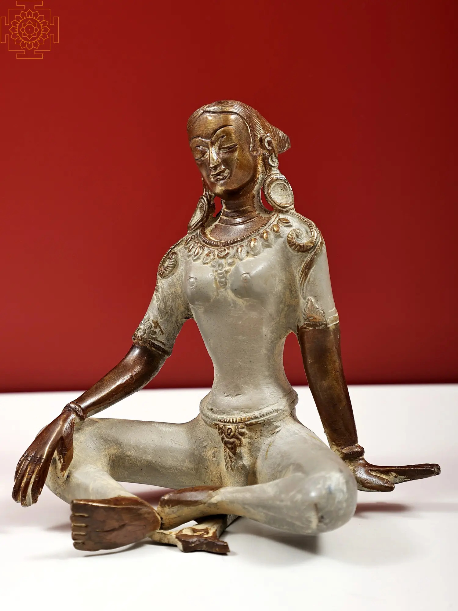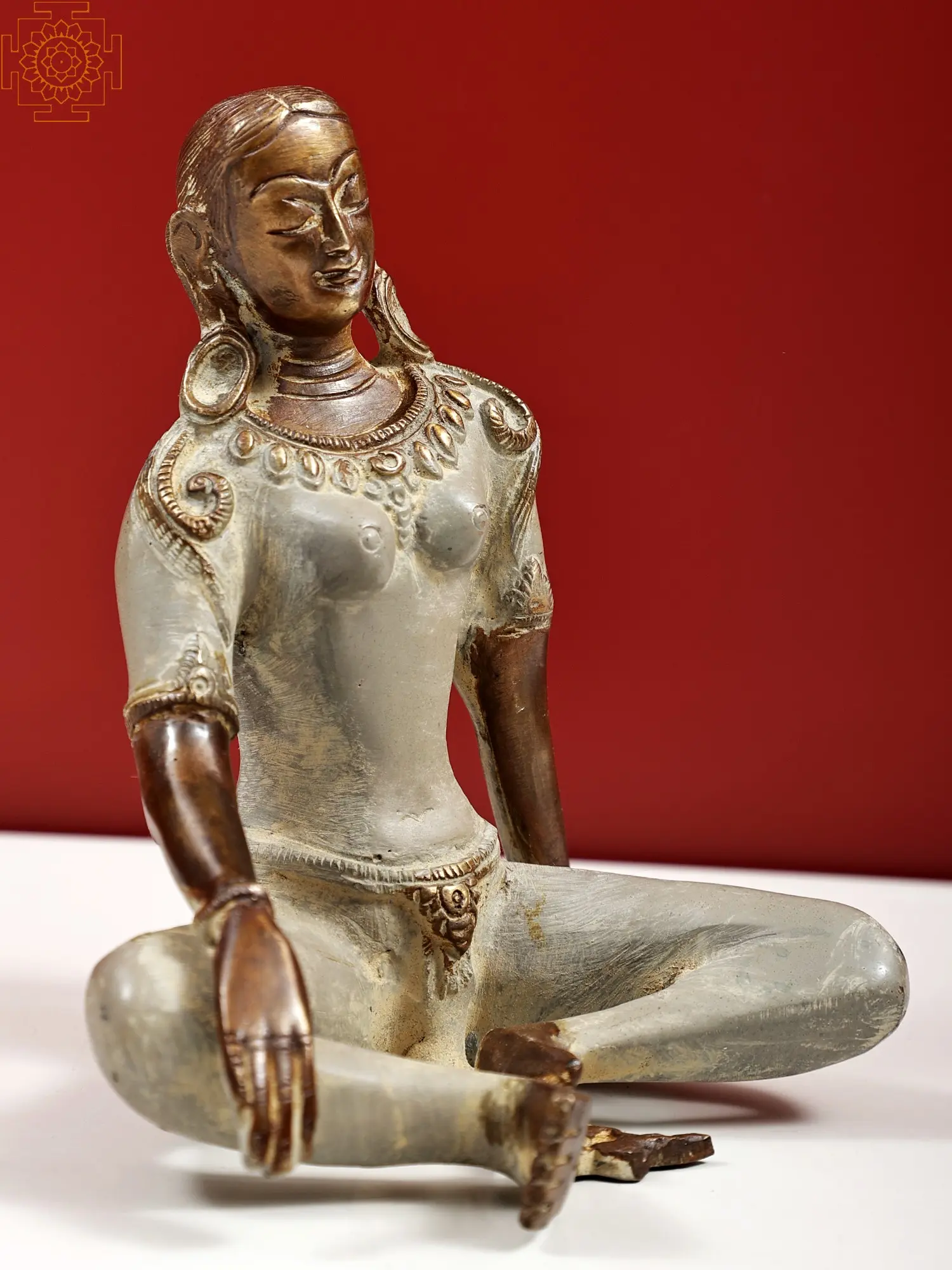 This is a unique representation of the popular Buddhist divinity, Green Tara, who is depicted seated in a relaxed posture, wrapped in a beautiful attire that clings to her youthful form, and adorned with simple ornaments, that complement her celestial beauty. Green Tara has her hair tied in an unassuming hairdo which frames her heavenly countenance mesmerically. Smiling gently, Mother Tara fills the heart with a celestial tranquillity.