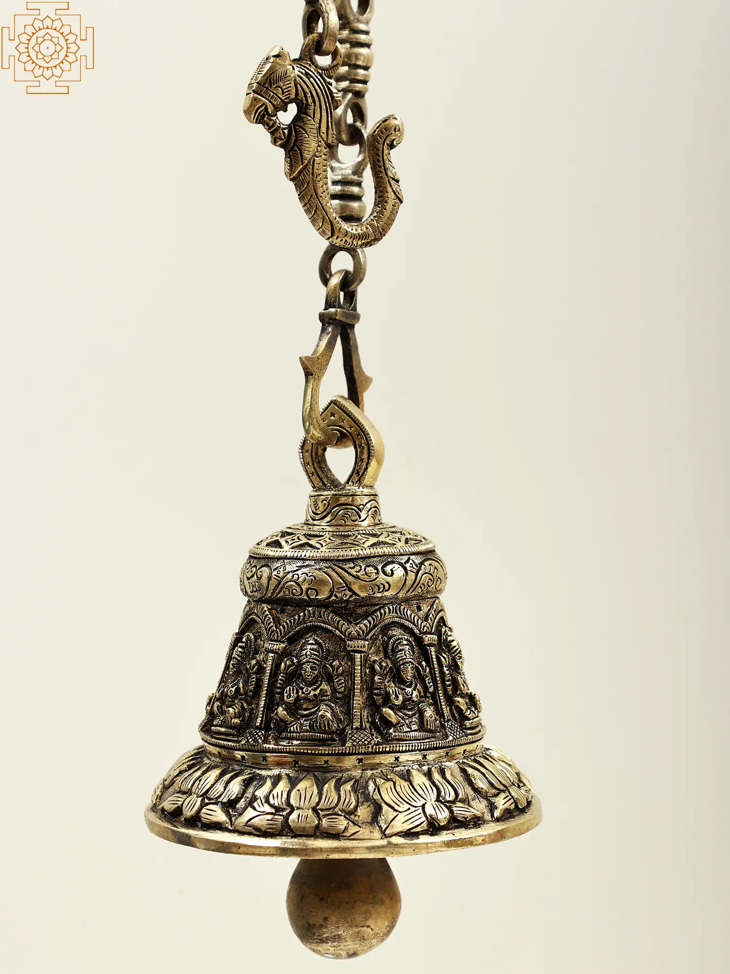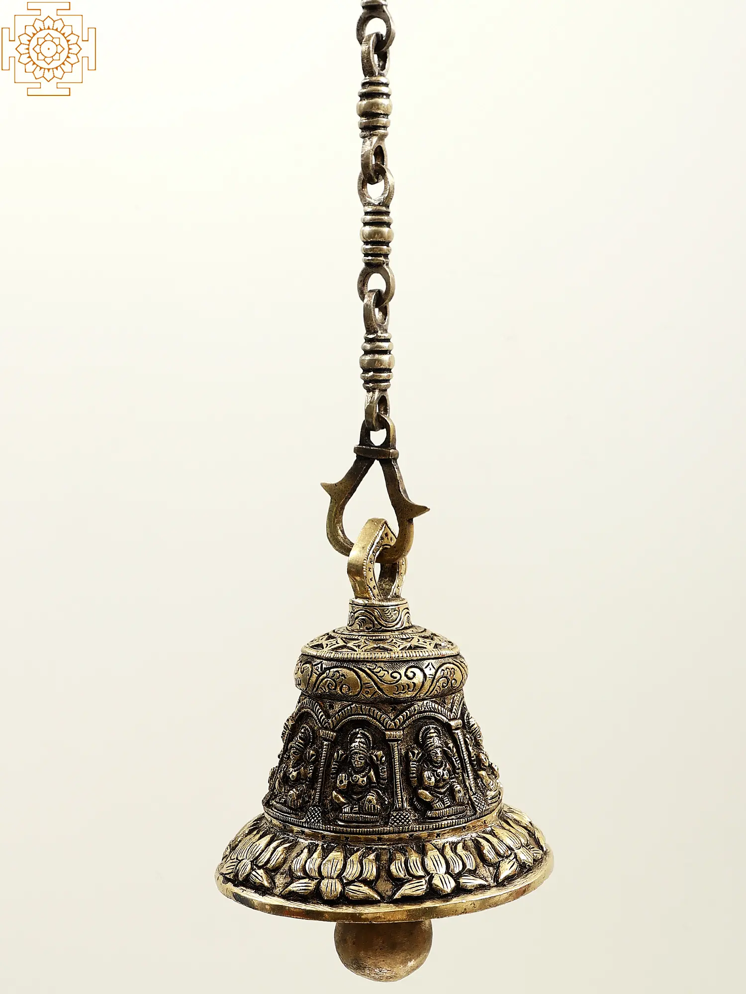 Brass bells have traditionally been regarded sacred, and their ringing contributes to the creation of a spiritual atmosphere in places of worship. This handcrafted brass bell with Goddess Lakshmi designs on the middle ring and a series of lotuses on the last ring is ideal for a modest temple or house. The bell becomes a conduit between the physical and spiritual realms as it is hanging from the temple roof. The angelic tones reverberate throughout the temple, inviting prosperity, harmony, and Goddess Lakshmi's blessings.