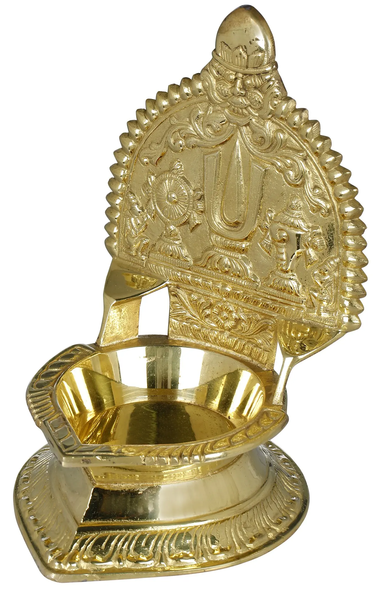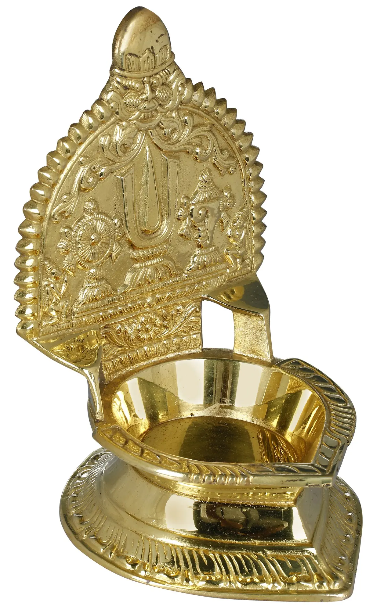 Bask in the radiant glow of spirituality with our Handmade Large Lamp adorned with Vaishnava Symbols from South India, meticulously crafted in brass. This majestic piece is a visual symphony of devotion, featuring symbols that hold deep significance in Vaishnavism, a sect of Hinduism. The lamp's elaborate design not only illuminates your space but also tells the story of ancient traditions and beliefs. Every detail reflects the artistry of skilled artisans from the southern regions of India, infusing your home with the warmth of their heartfelt dedication. Light this lamp, and you'll not only brighten your surroundings but also kindle a connection with the profound spiritual heritage of the land it hails from.