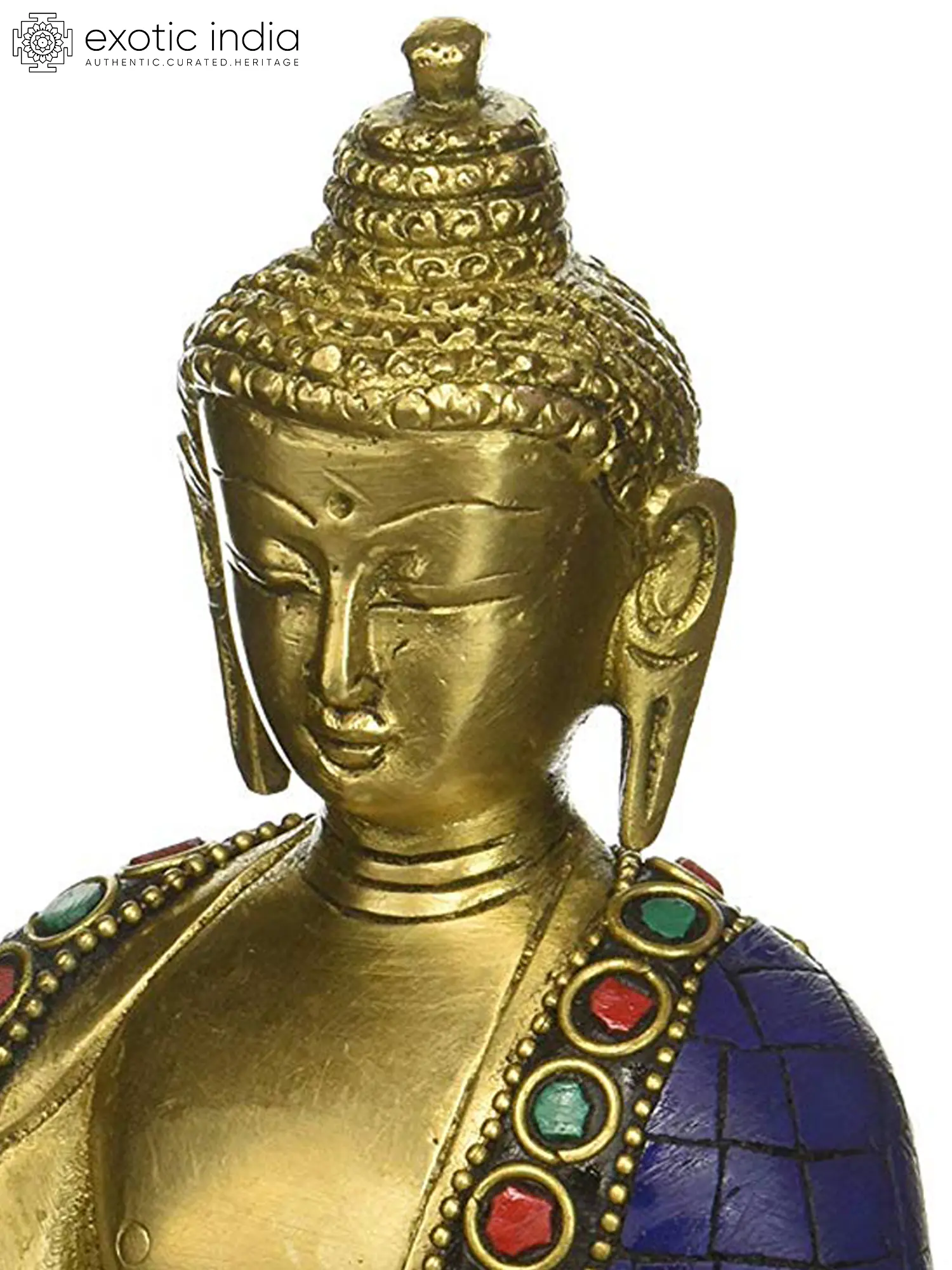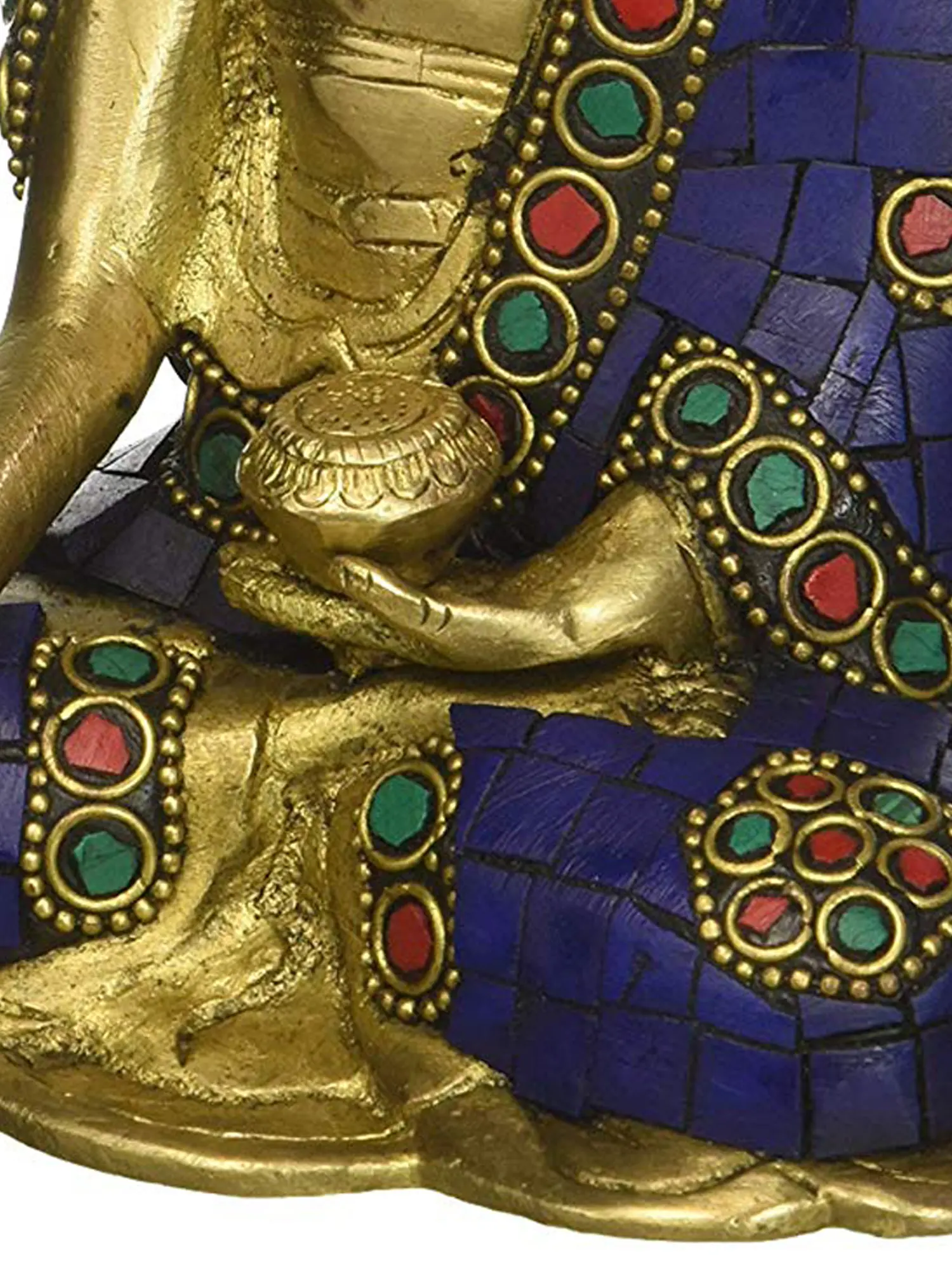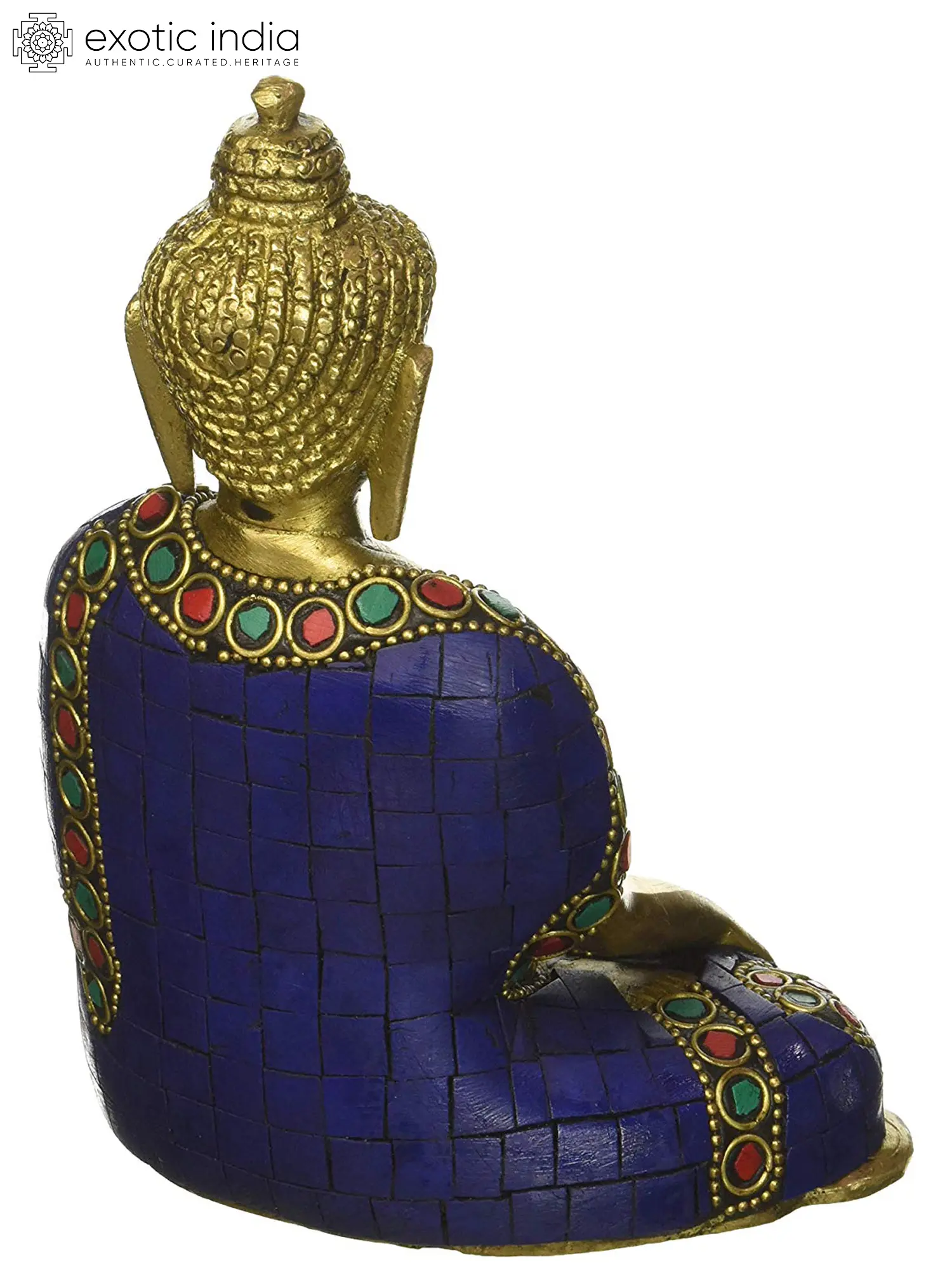 Discover the enlightenment and serenity of Lord Buddha in the Bhumisparsha Mudra, adorned in a lapis-hued robe, through this handcrafted brass sculpture from India. Lord Buddha's teachings are celebrated for their profound impact on philosophy and spirituality. The Bhumisparsha Mudra symbolises the moment of his enlightenment, invoking the earth as his witness. This sculpture captures the essence of this transformative moment, reflecting the calming presence of Buddha. Invite the wisdom and inner peace of Lord Buddha into your home, fostering mindfulness and serenity.