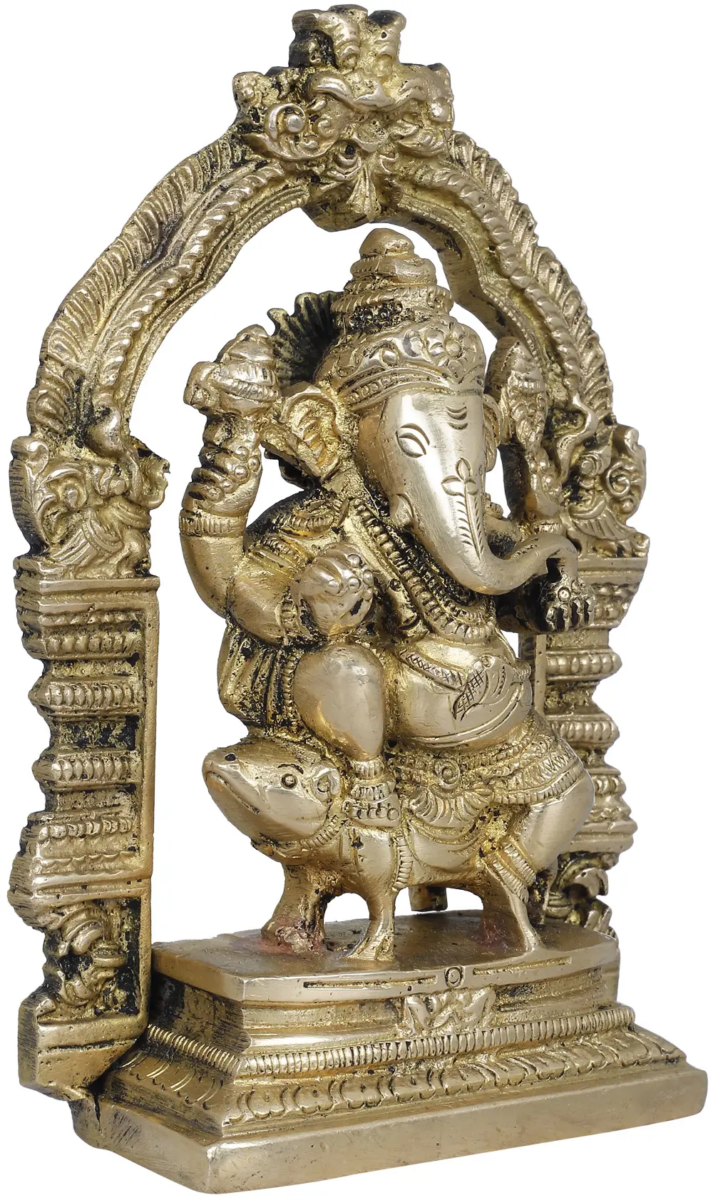 Lord Ganesha, revered as “the remover of obstacles” and “the patron of wisdom”, is depicted seated gracefully upon a mouse (Mooshika), his trusted vehicle, symbolizing his mastery over desire and ego. Adorned in divine splendor, Ganesha’s form is further elevated when seated on a “Kirtimukha throne”, which embodies the power to vanquish evil and guard followers. Cast in brass with meticulous attention, this spectacular creation reminds you of the deity’s guidance in overcoming challenges and embracing virtues on the path to enlightenment.