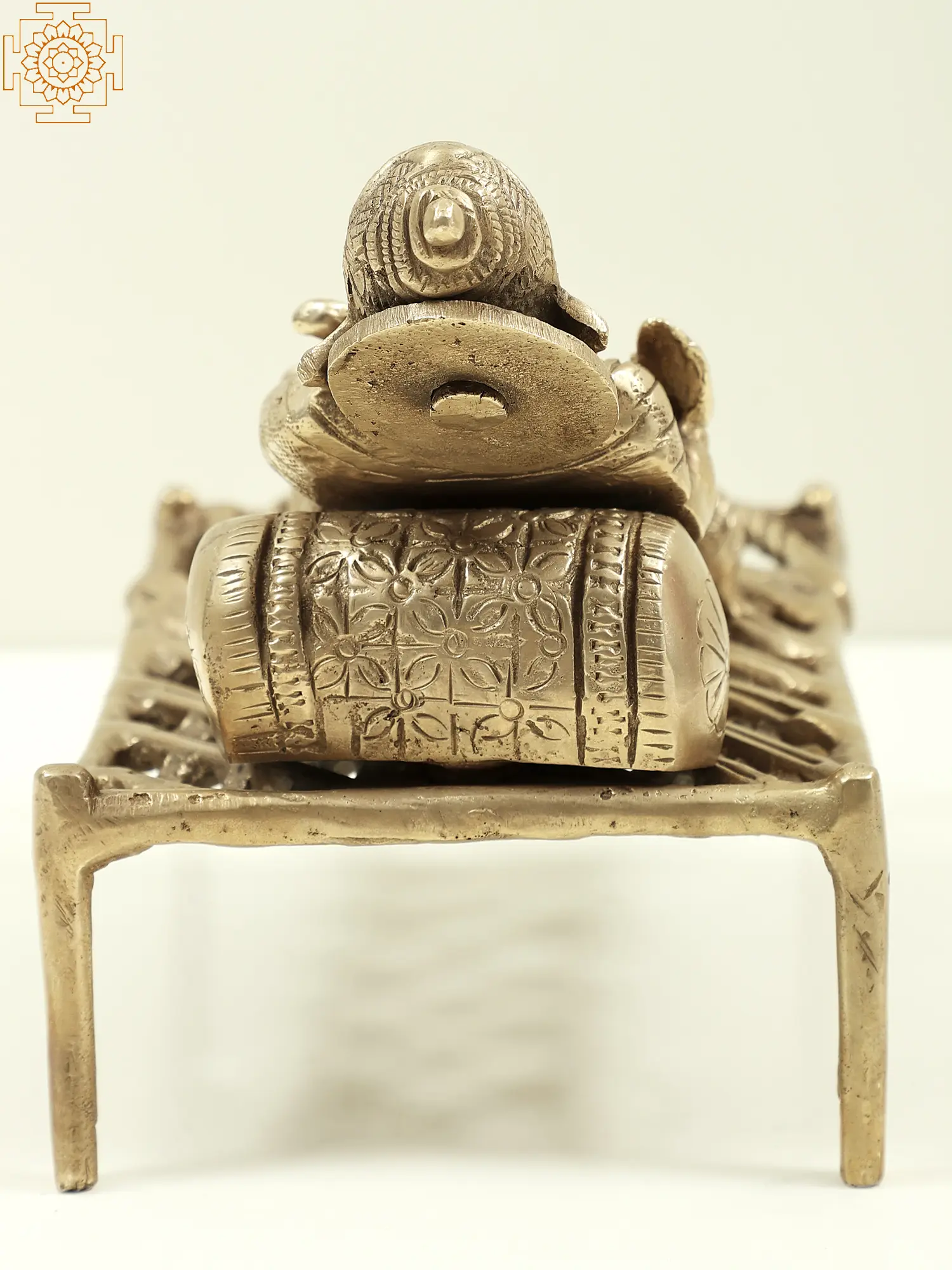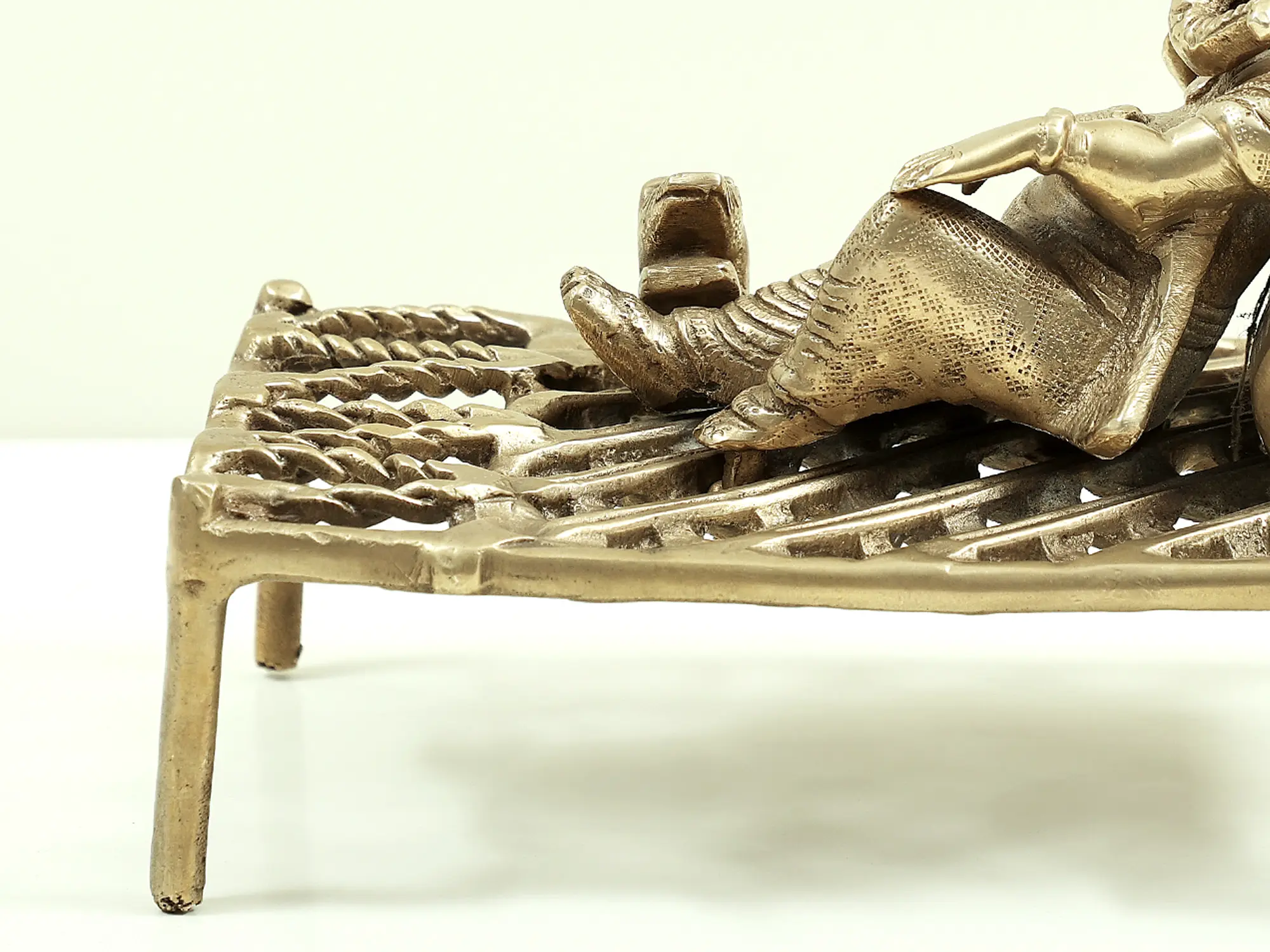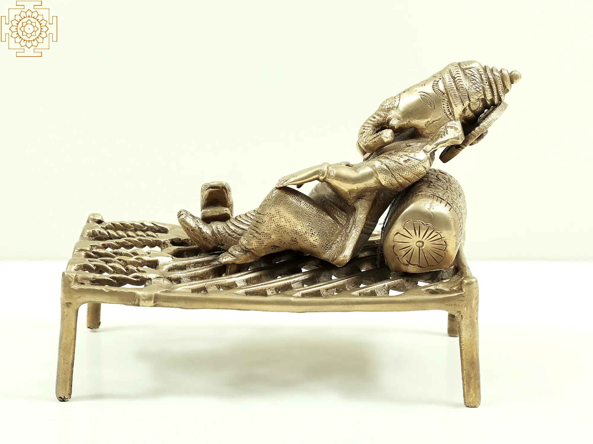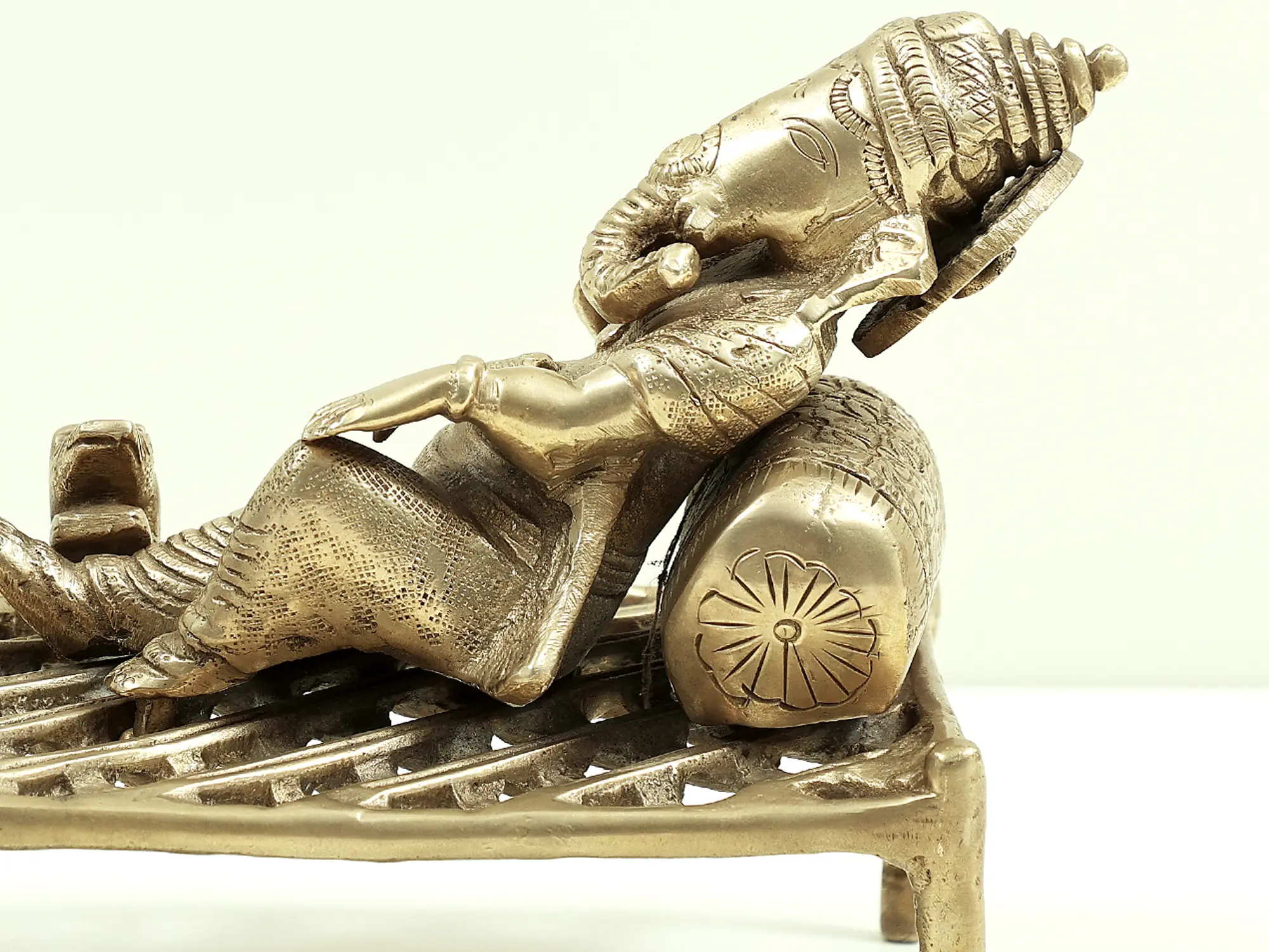 This brass statue of Lord Ganesha reclining and resting on a brass is an investigation of philosophy, art, and poetry. In a tradition where statues of Lord Ganesha are regarded auspicious, this statue adds another dimension of holiness. Lord Ganesha, a symbol of protection and knowledge, is pictured relaxing on a Khatiya or Khat and blessing his devotees, making this item a work of art and holiness. This amazing artwork flawlessly blends the celestial presence of Lord Ganesha and the attraction of the brass metal in a truly engaging work of art.