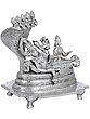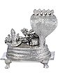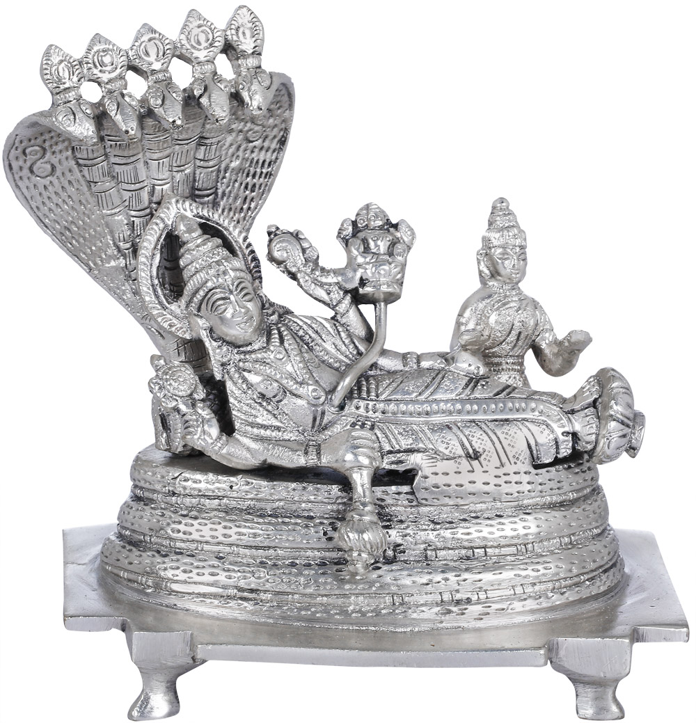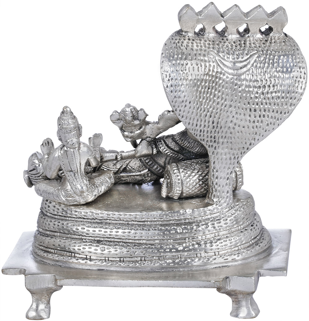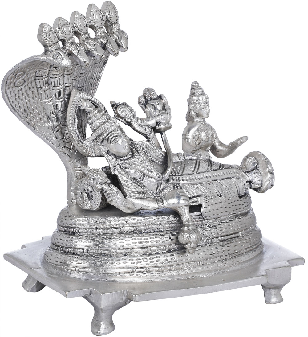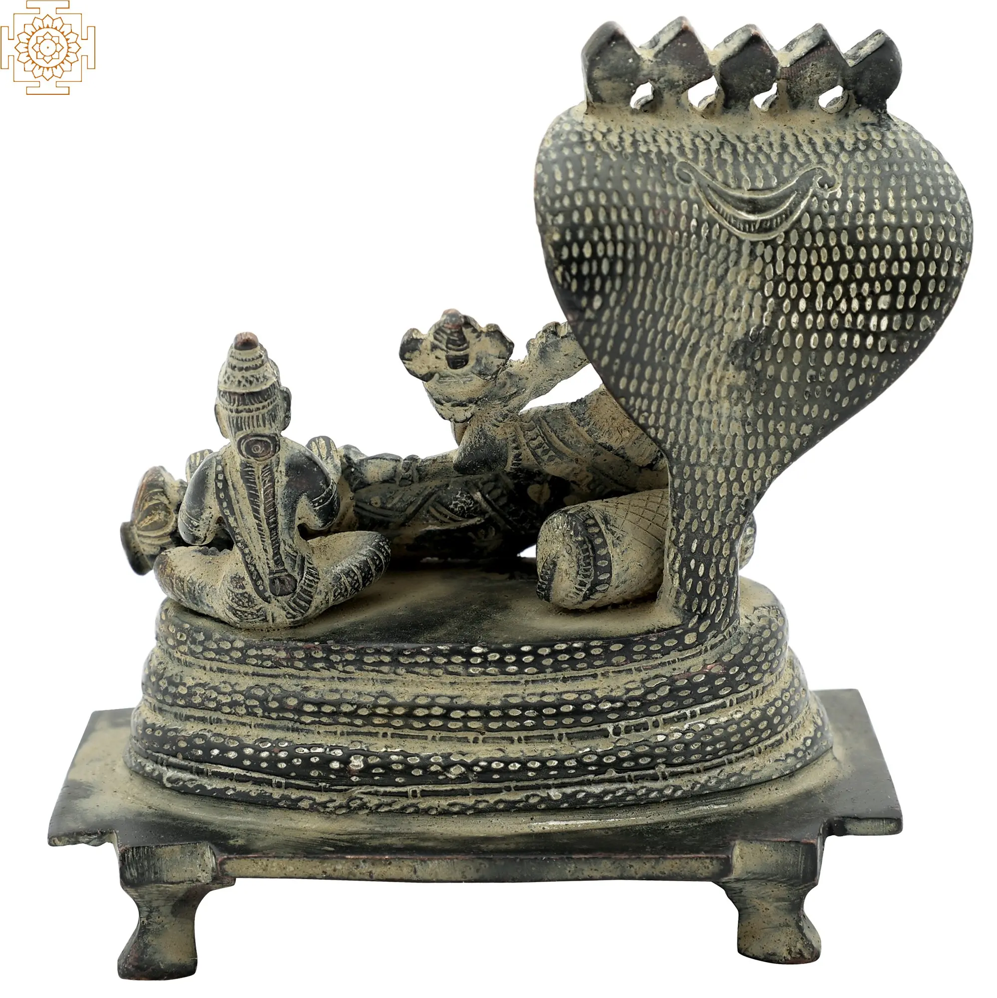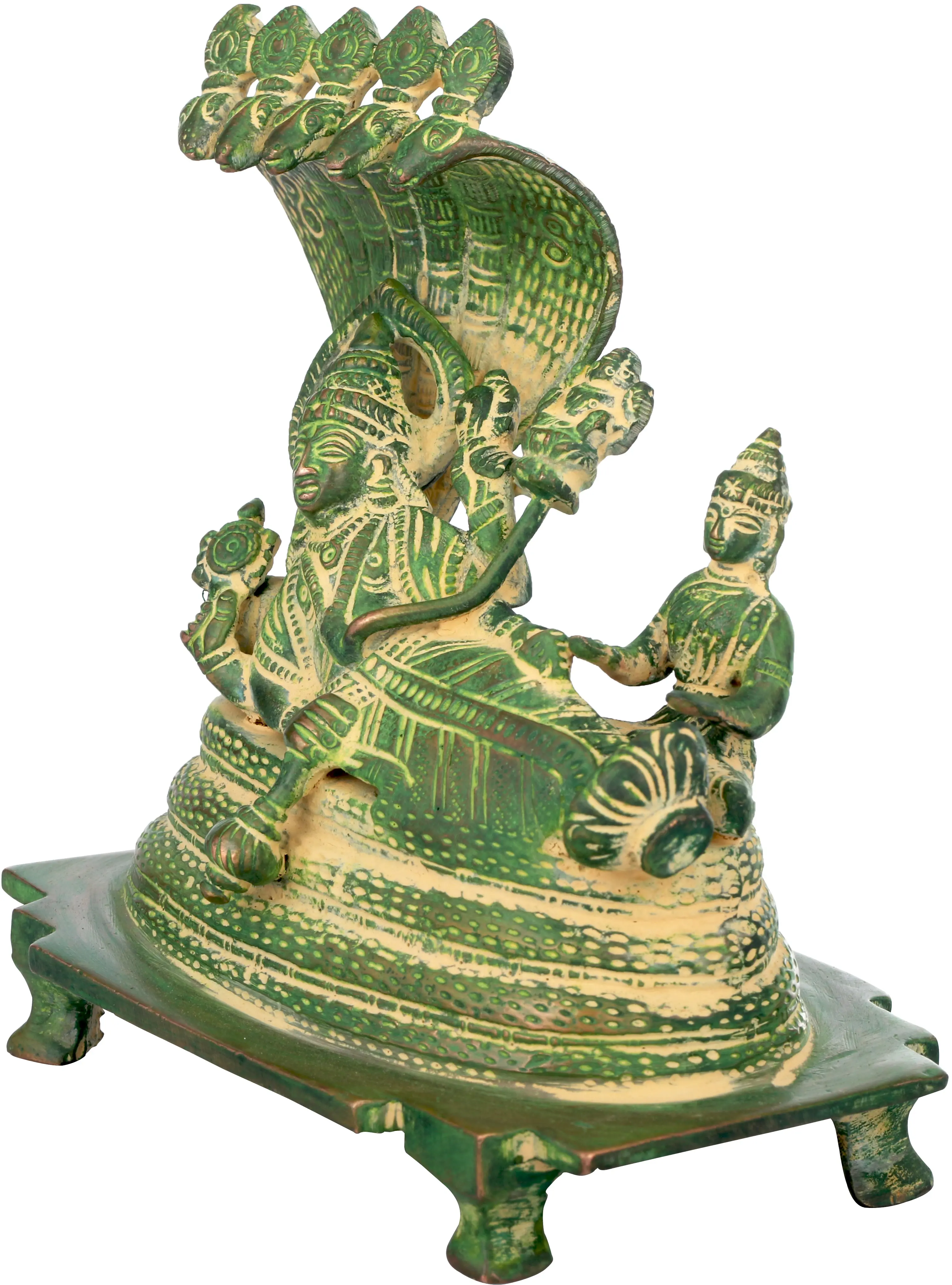 In the heart of cosmic eternity, a mesmerising tableau unfolds – Sheshasayi Vishnu, reclining upon the coils of the great serpent Ananta Shesha, emerges as the cosmic dreamer, enveloped by the embrace of his beloved consort Devi Padma. From his divine navel emerges Lord Brahma, the creator, ready to weave the tapestry of existence. This brass portrayal encapsulates the profound interplay of creation, preservation, and dissolution, inviting you to witness the dance of the universe's eternal rhythm.