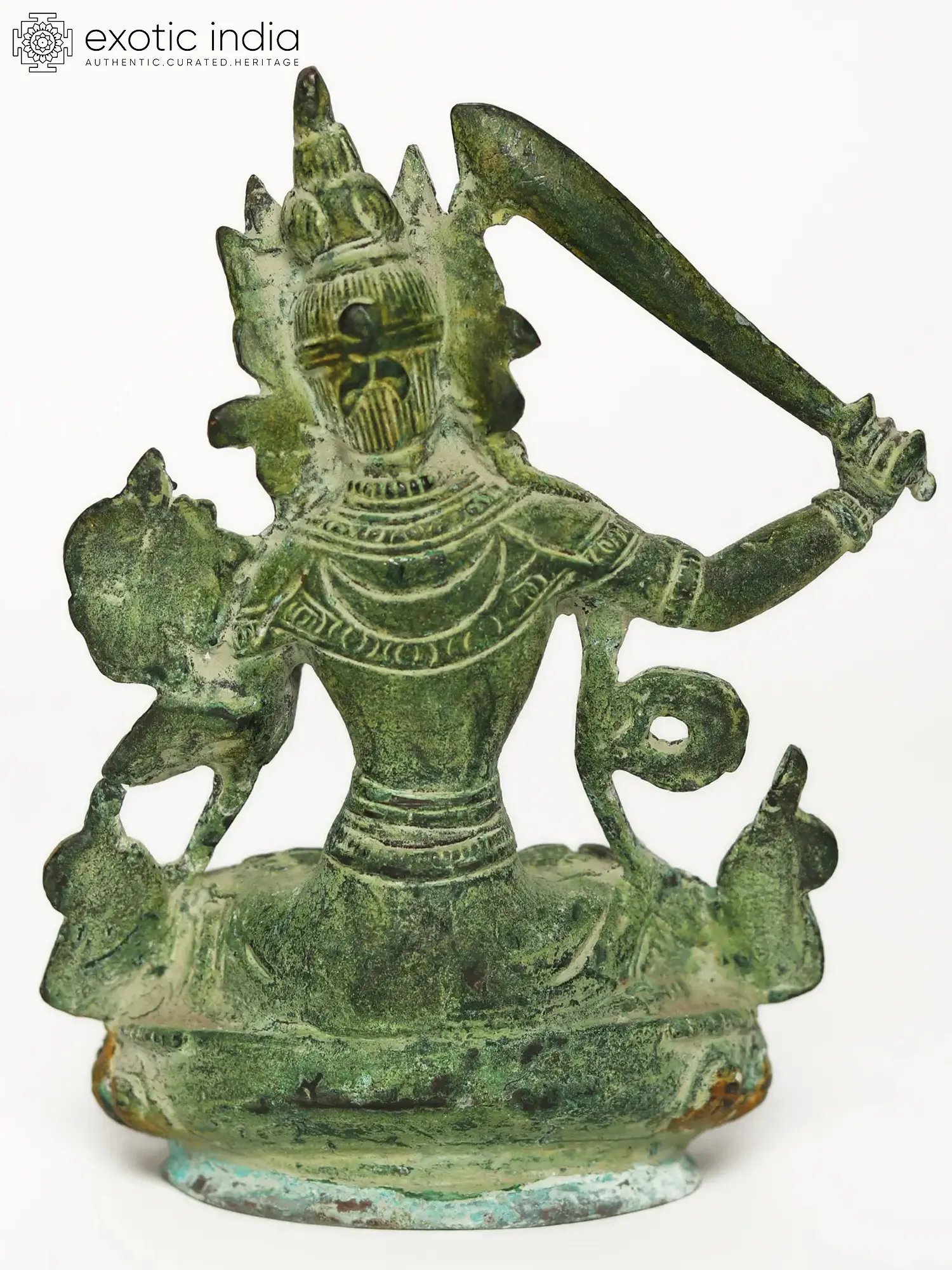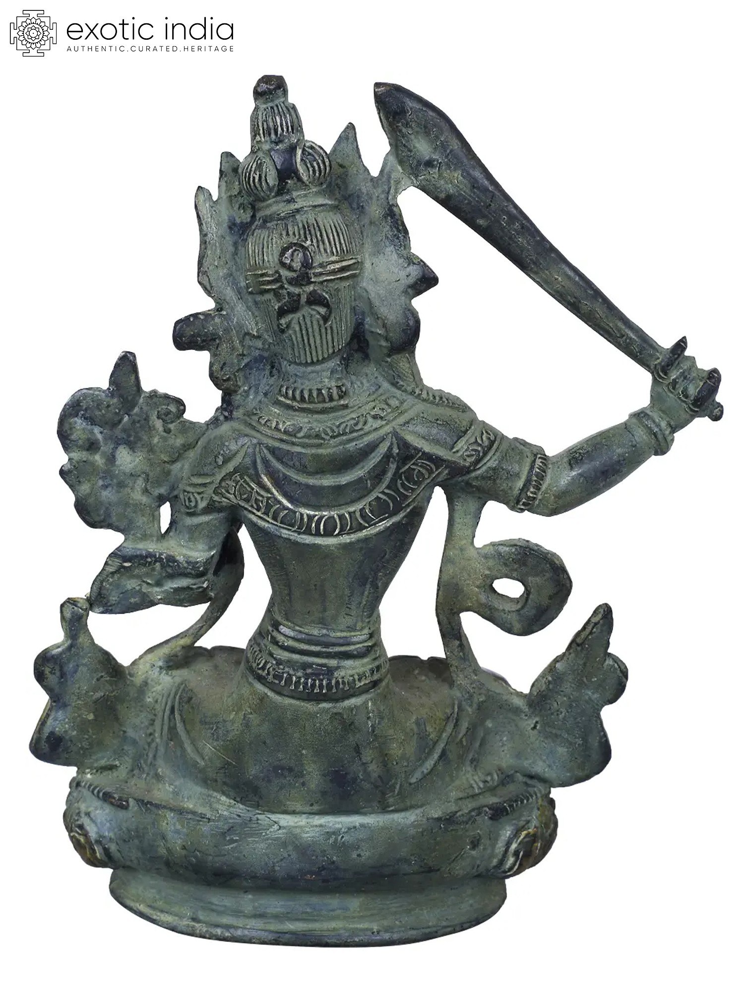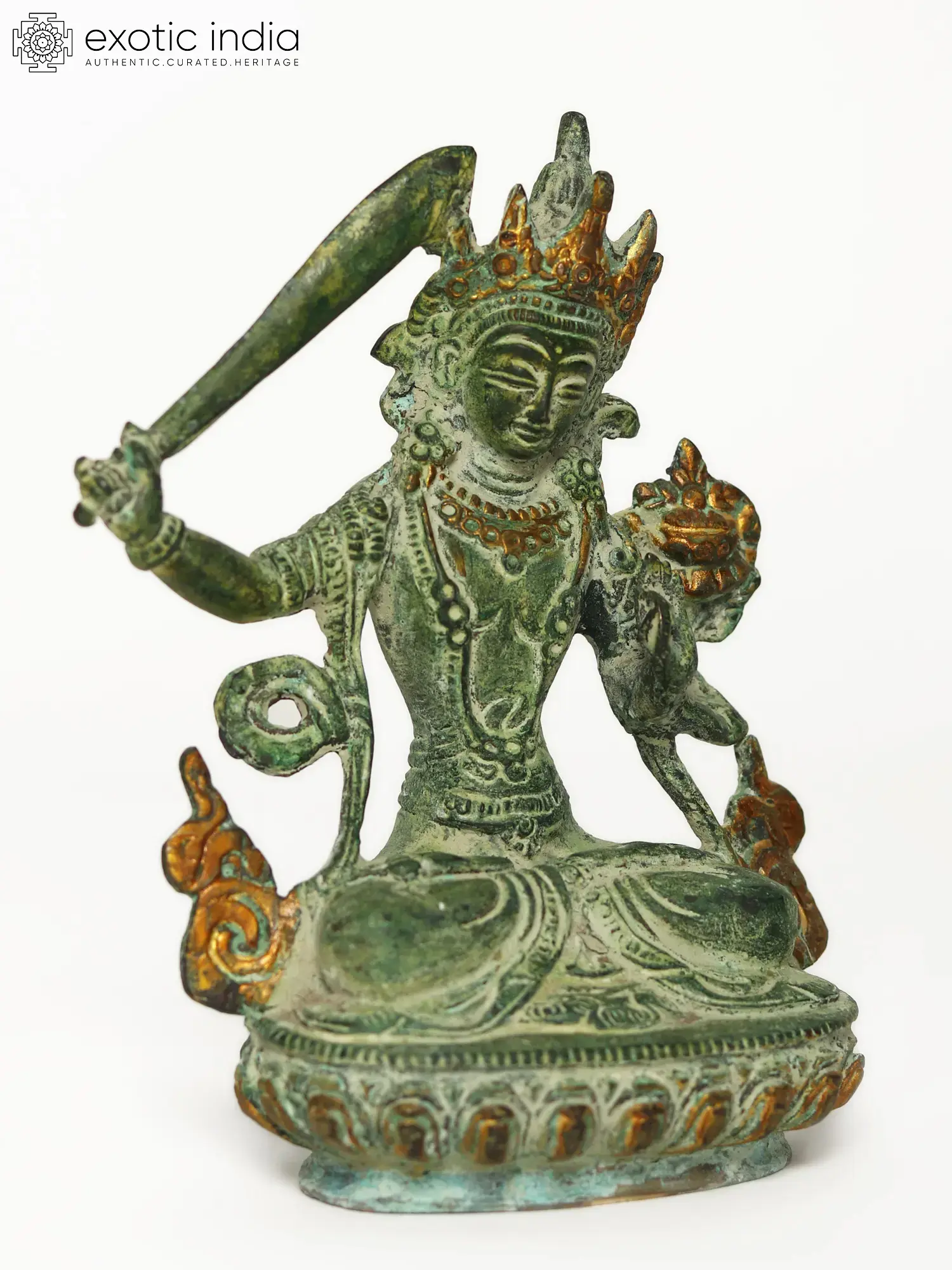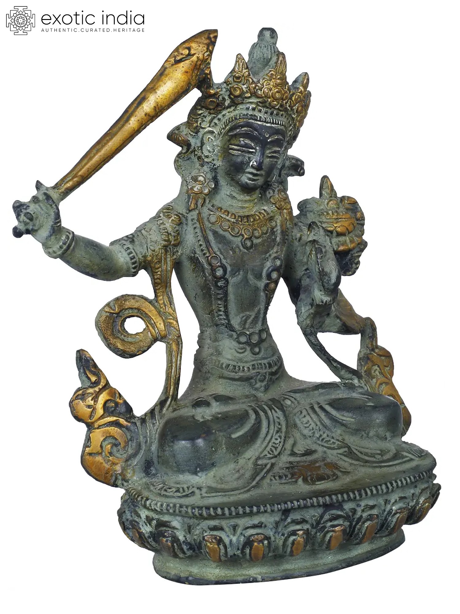 This brass statue of Manjushri is a testament to the skilled craftsmanship of artisans. Manjushri, with his flaming sword of wisdom, represents the transcendence of ignorance and the illumination of knowledge. His presence signifies the relentless pursuit of wisdom and the capacity to cut through the veils of delusion, revealing the true nature of reality. The fine detailing, from the intricate patterns of his attire to the flowing lines of his lotus seat, reflects the dedication and artistry that went into its creation.