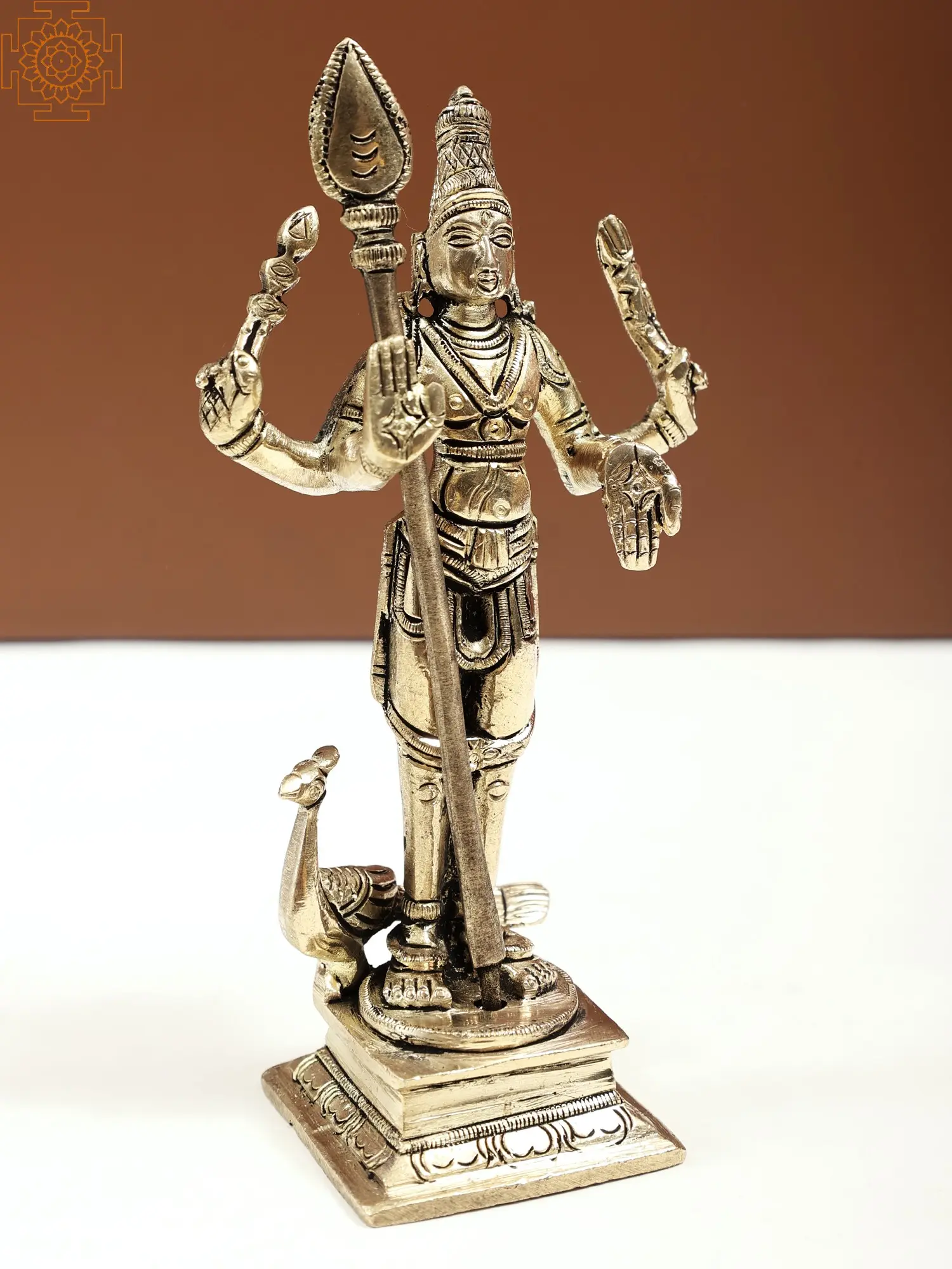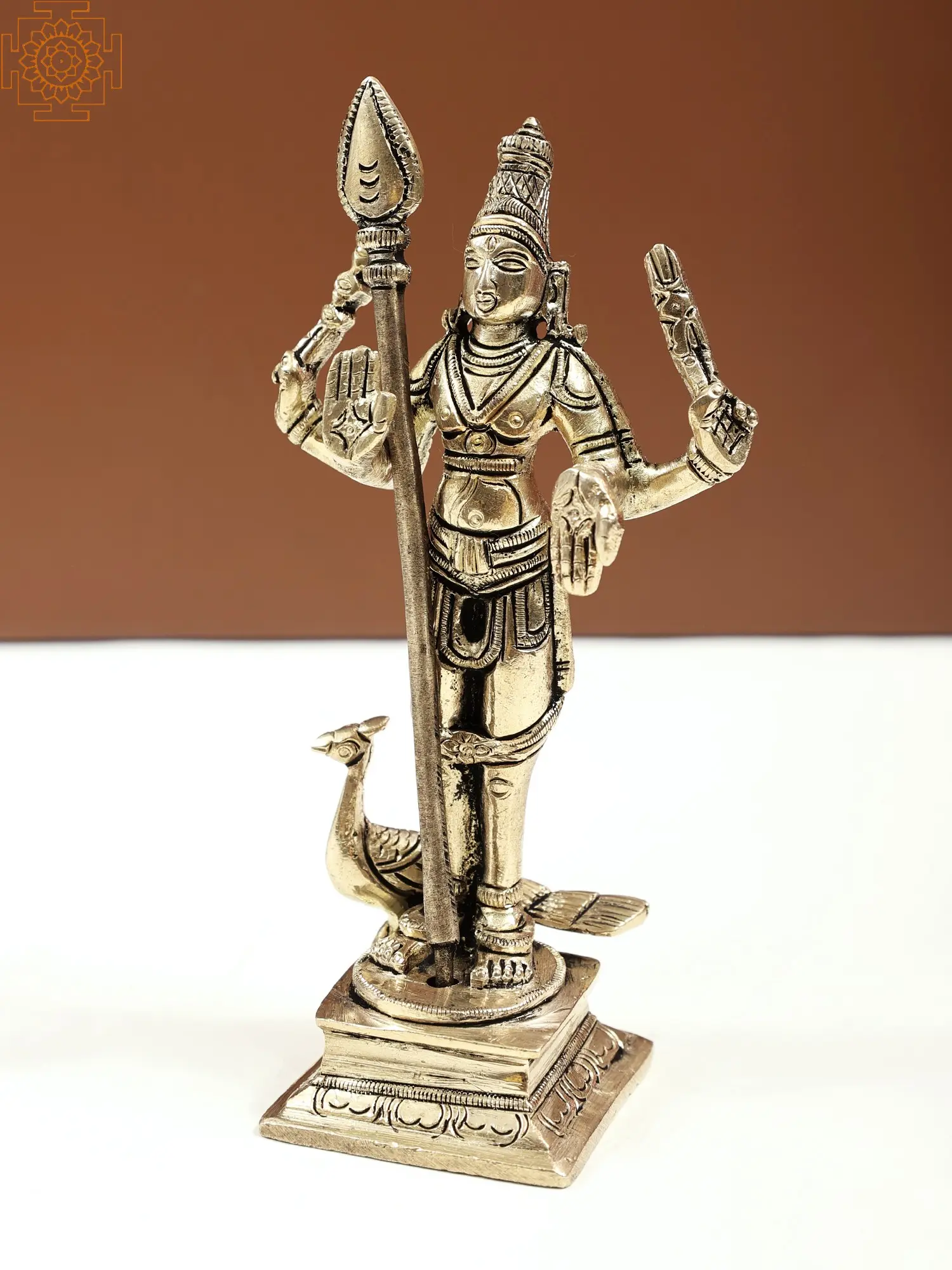 Handmade with devotion, the brass Standing Lord Karttikeya sculpture reveals the deity atop his Vahana, the peacock. Karttikeya, the god of war and valor, signifies courage and determination. With six heads representing the six seasons, he mirrors cosmic presence. His spear signifies power, and the peacock's regal feathers embody beauty. Karttikeya's journey against the demon Soorapadman symbolizes the triumph of good over evil. This artwork invites us to embrace Karttikeya's indomitable spirit, inspiring us to rise above limitations and conquer adversities.
