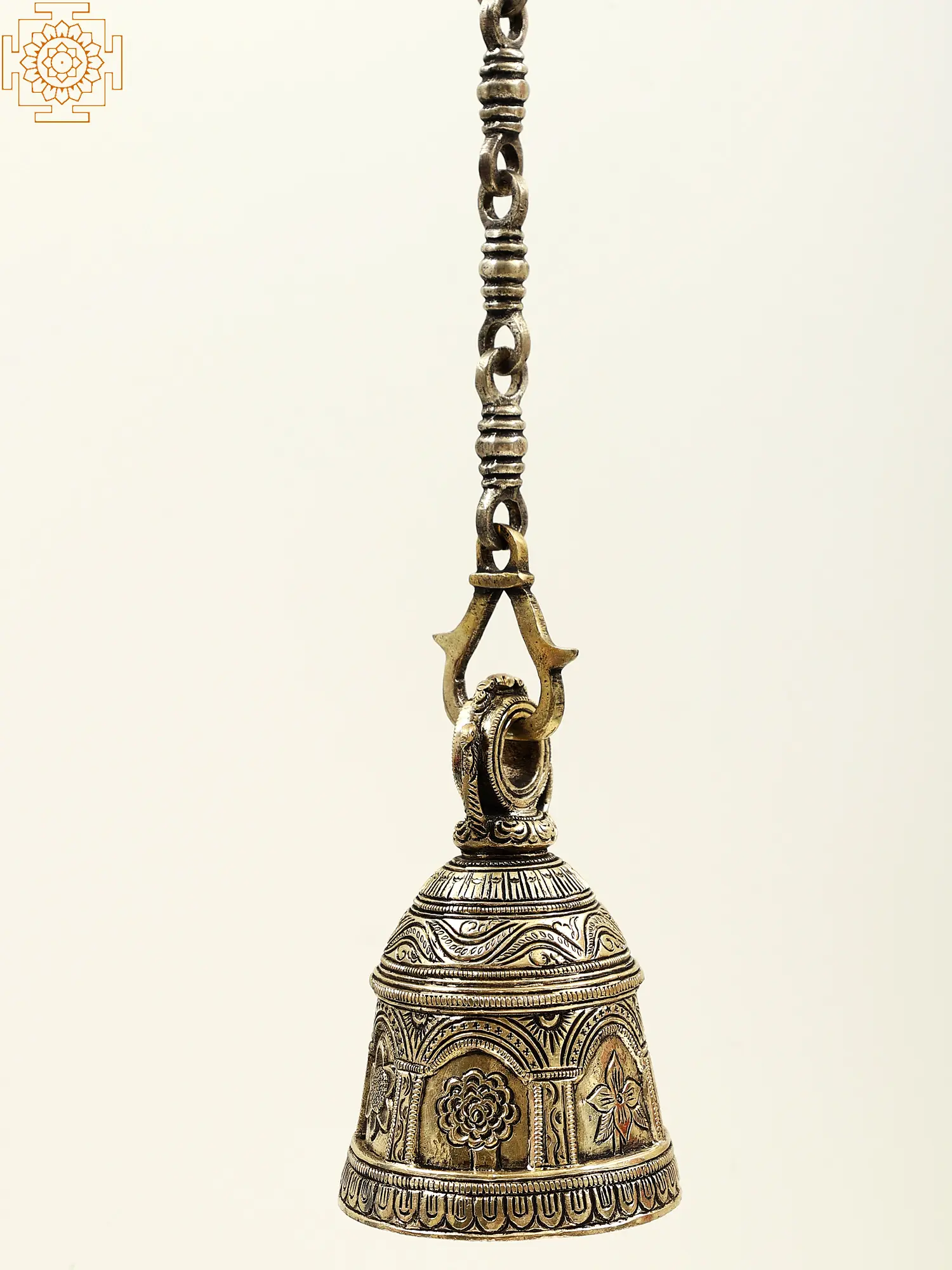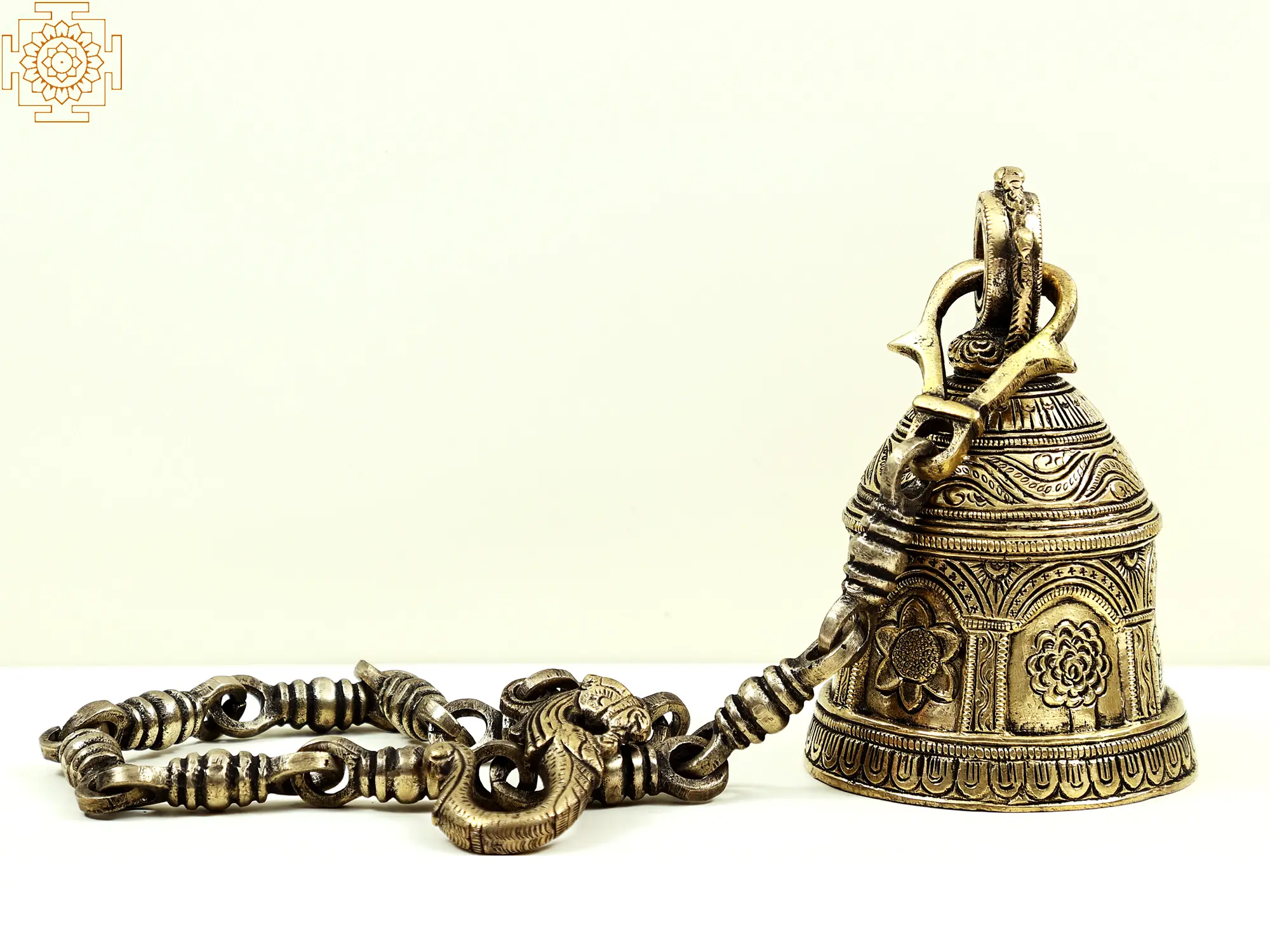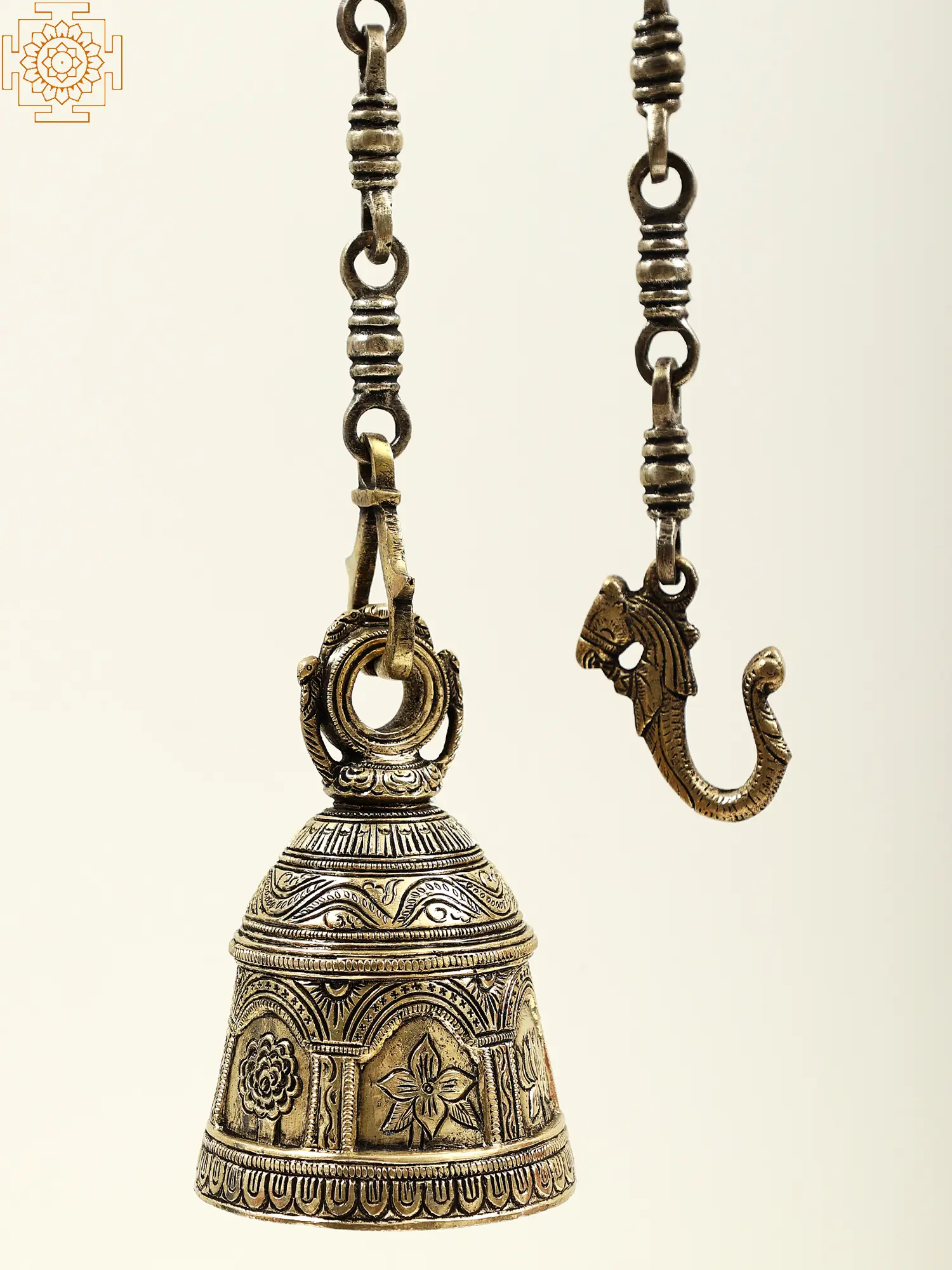 Since time immemorial, the sound of a brass bell has been a source of quiet. This handmade brass bell with gorgeous flower motifs on the main bell and miniature peacock motifs on the hanging ring is a magnificent work of art that represents the spirituality of flowers. The bell hook is shaped like an elephant's trunk, adding another layer of auspiciousness to the piece. This bell functions as a bridge between the physical and spiritual realms, increasing the holy aura and inviting a deep connection with the divine whether set in a temple or hung in a personal sacred location.