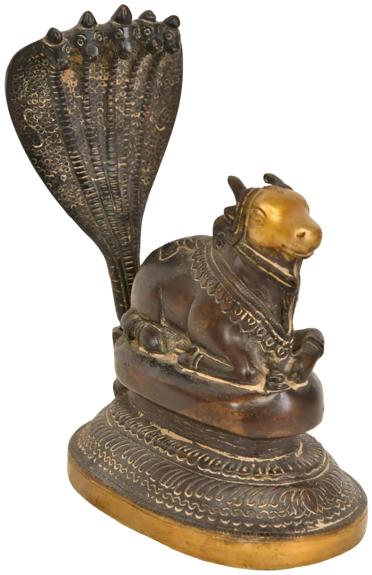This sculpture of Nandi Seated in the Coil of Panchmukhi Vasuki invites you to meditate on the profound symbolism of devotion and cosmic protection. It serves as a tangible reminder of the harmonious dance between the earthly and the divine, encouraging you to seek the protection and guidance of these powerful presences. Whether adorning your personal sanctuary, enhancing a sacred altar, or being offered as a meaningful gift, the sculpture resonates with the essence of devotion and cosmic harmony.