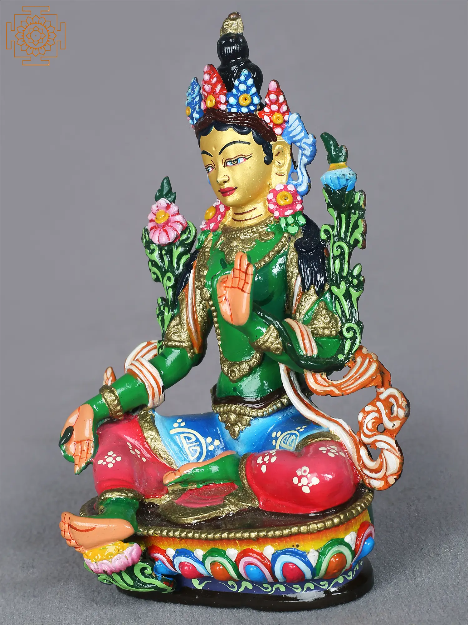 Green Tara, is portrayed with her right hand extended in the gesture of supreme generosity (varada mudra), signifying her willingness to bestow blessings and aid. In her left hand, she holds the gesture of protection (abhaya mudra), embodying fearlessness. A blue lotus, symbolizing purity, may gracefully rest in her left hand.