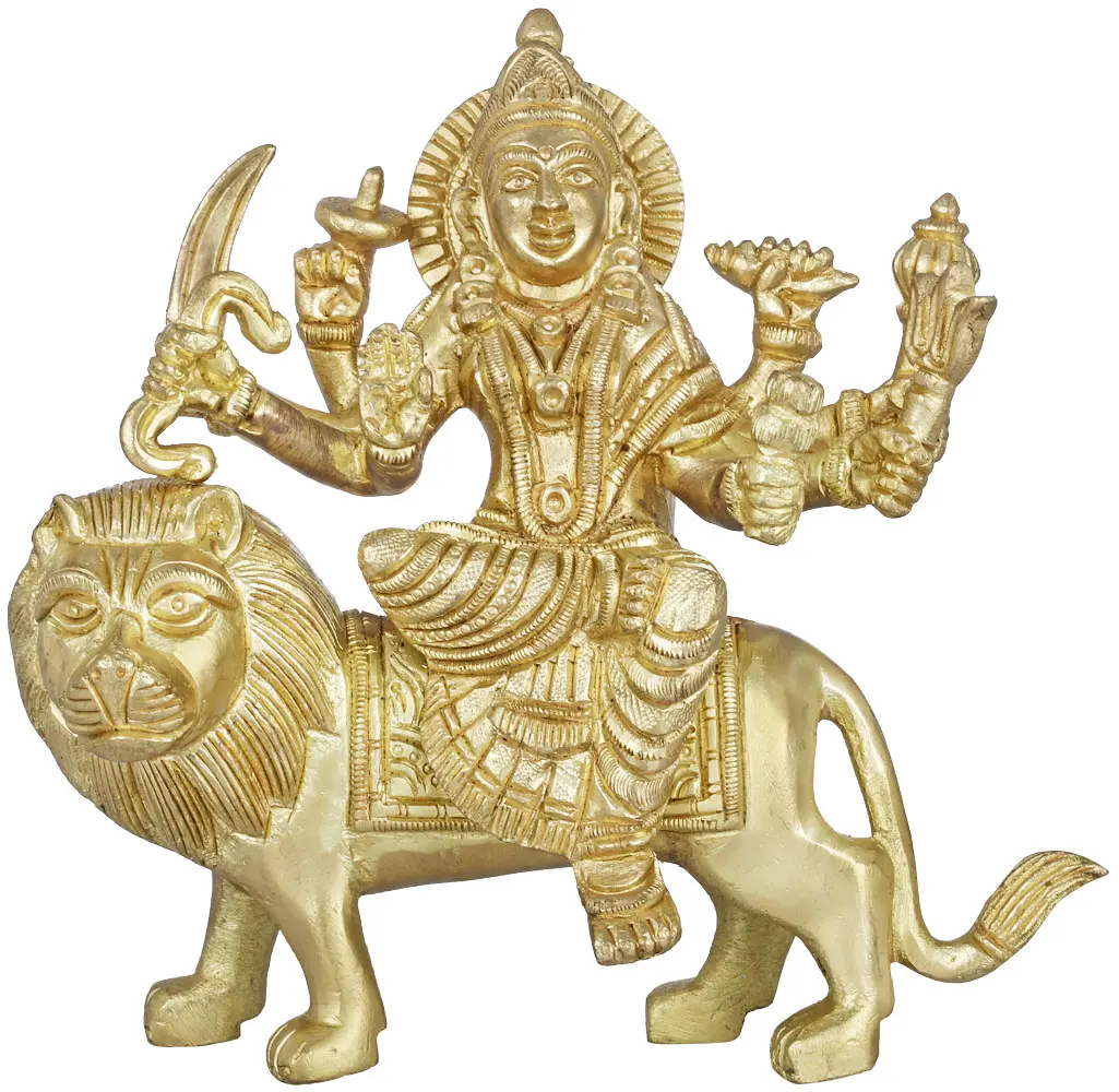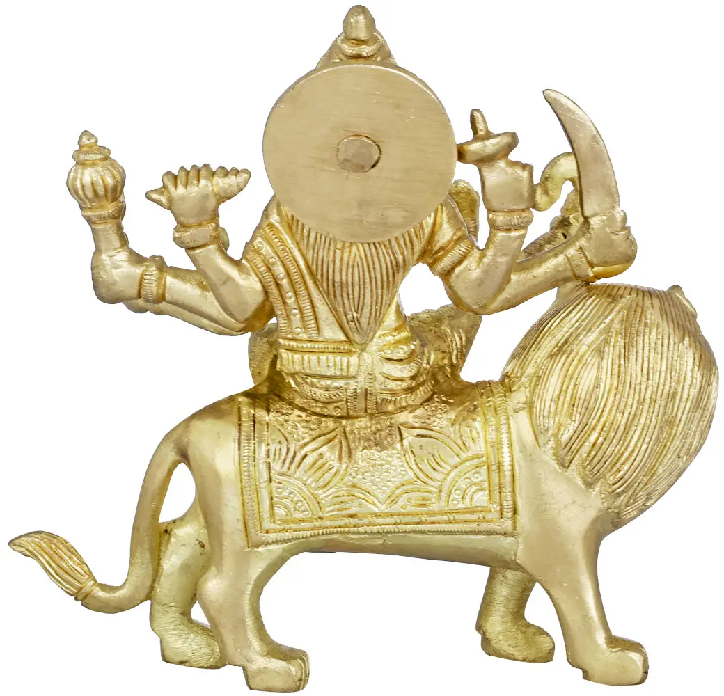 Riding a majestic lion, “Devi Durga” epitomises fearlessness and righteousness. As the embodiment of the fierce yet nurturing aspect of the feminine, Goddess Durga represents the triumph of Good over Evil. Devi Durga is seen holding various weapons such as discus (Chakra), Trident (Trishul), Sword, symbolising her ability to vanquish evil and protect devotees in times of challenges. Her right hand is raised in a gesture of protection, signifying the dispelling of fear and granting blessings to her devotees. Her enchanting aura illuminates with grace, strength, and compassion. The brass statue is a cherished centrepiece to any sacred space, inviting devotion and blessings of courage, prosperity, and spiritual strength.