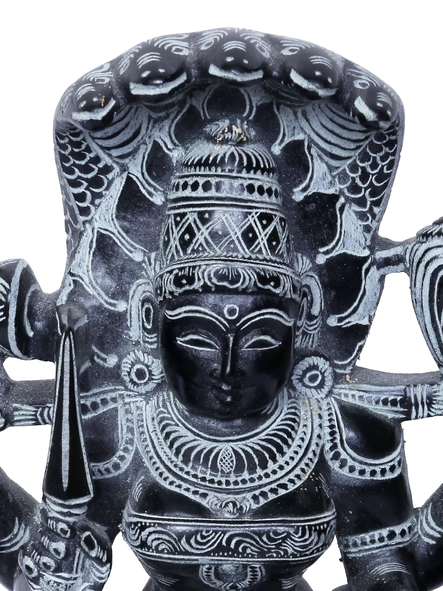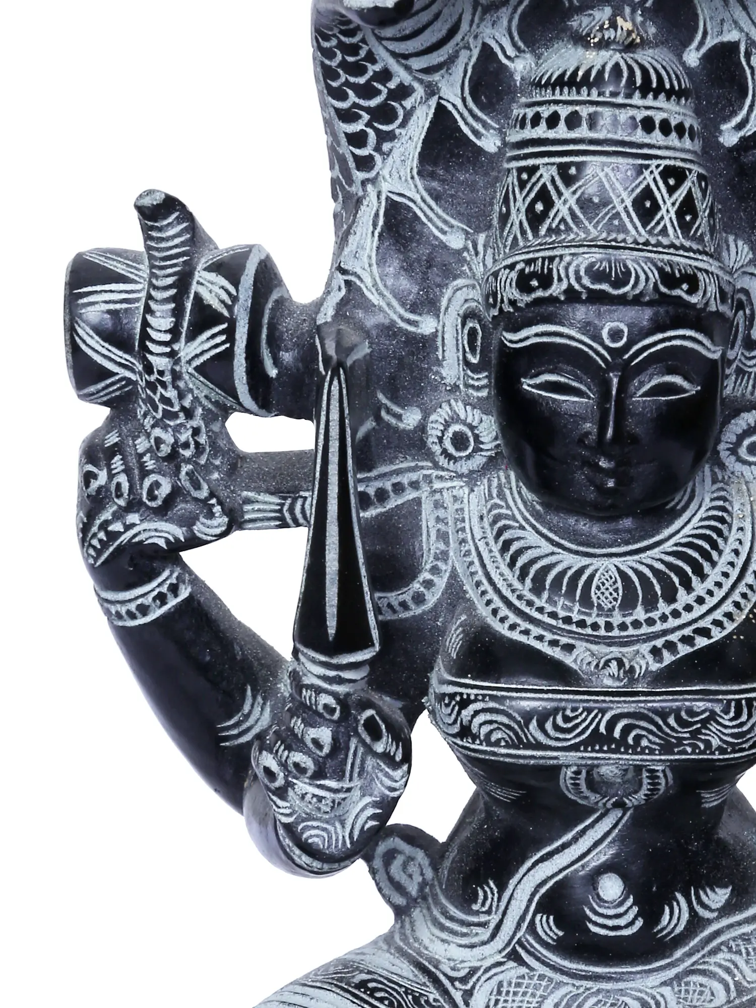 Originating from Mahabalipuram, a UNESCO World Heritage site renowned for its ancient rock-cut temples and sculptures, this statue is a testament to centuries of evolving artistic skill. The stone, chosen for its resilience and ability to hold intricate details, has been expertly shaped by artisans who carry forward a legacy of craftsmanship. The contrasting polish that highlights the carved motifs adds a dramatic flair, making the figure stand out and allowing the viewer to appreciate the depth and precision of the work. Owning this statue is like bringing a piece of ancient India's spiritual and artistic heritage into your home, a tangible connection to divine stories and masterful creation.