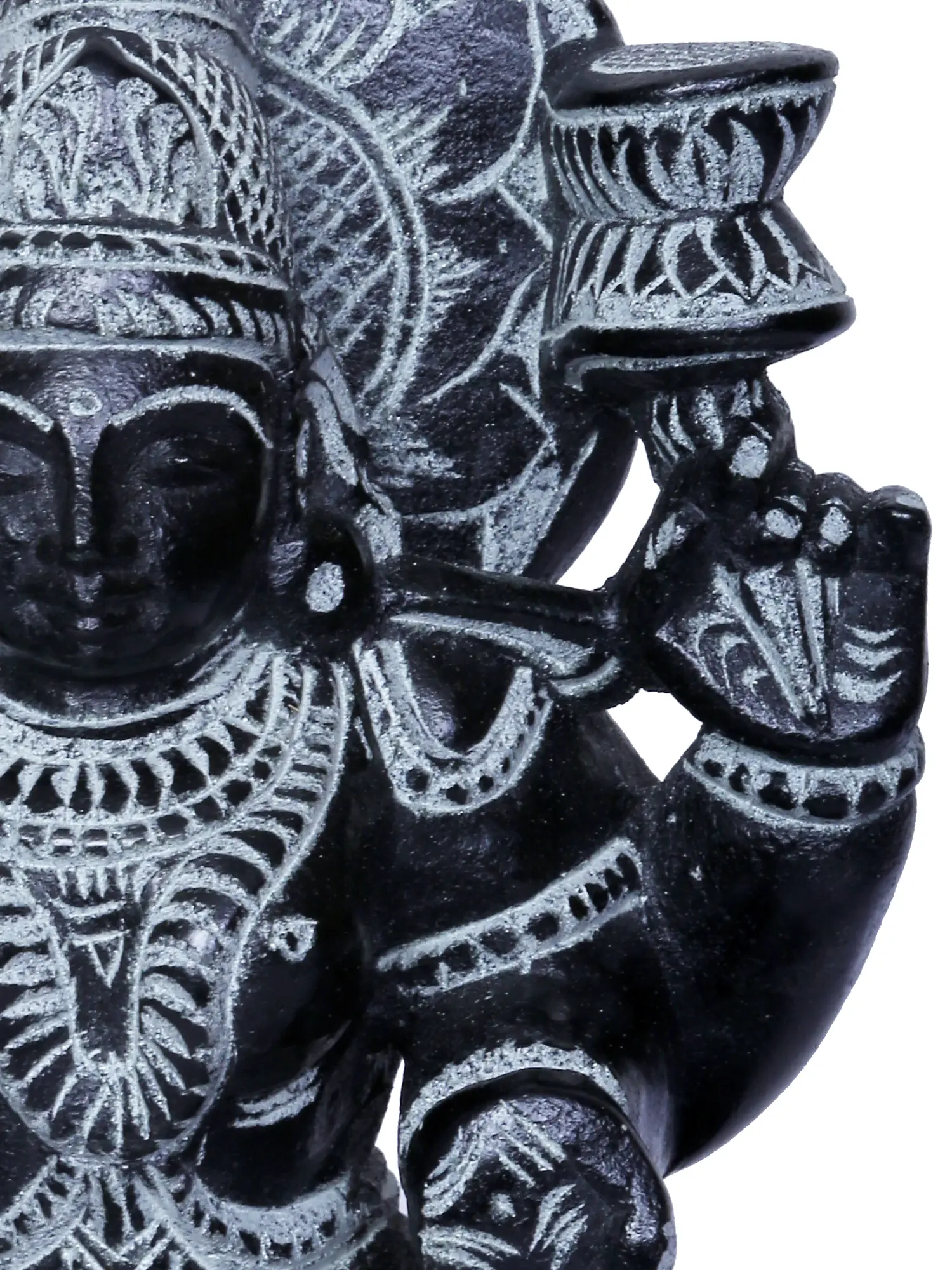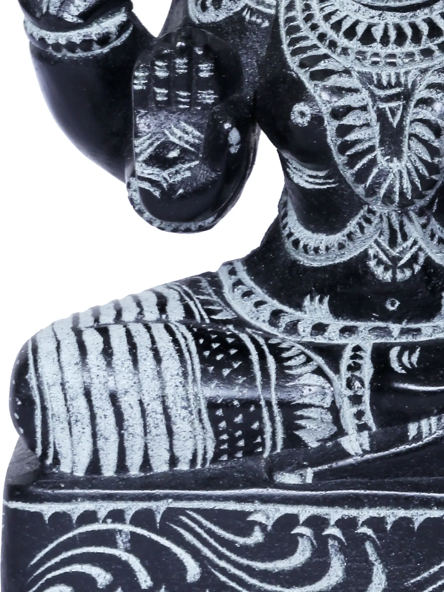 This particular representation of Devi Lakshmi showcases her seated in a meditative and graceful posture, symbolizing inner peace and stability, vital components of true prosperity. Her multiple arms, a common feature in divine iconography, are raised, holding symbolic objects that further deepen her spiritual significance. The intricate carvings adorning her divine form, from the elaborate crown and necklace to the decorative patterns on her garments and the base, speak to the skilled craftsmanship passed down through generations in South India. The contrast between the dark stone and the lighter, etched details accentuates the three-dimensional quality and the divine aura of the sculpture. The backdrop behind her, reminiscent of a lotus petal halo, signifies her purity and divine origin. The overall composition is one of profound serenity and divine grace. This statue is more than just a decorative piece; it is a conduit for positive energy, a reminder of the divine grace that sustains and enriches our lives. It is a perfect addition to any sacred space, home altar, or as a thoughtful gift for someone embarking on a new venture or seeking blessings of prosperity and well-being. Bringing this representation of Devi Lakshmi into your space is an invitation for her benevolent energies to flow, fostering an atmosphere of abundance and good fortune.