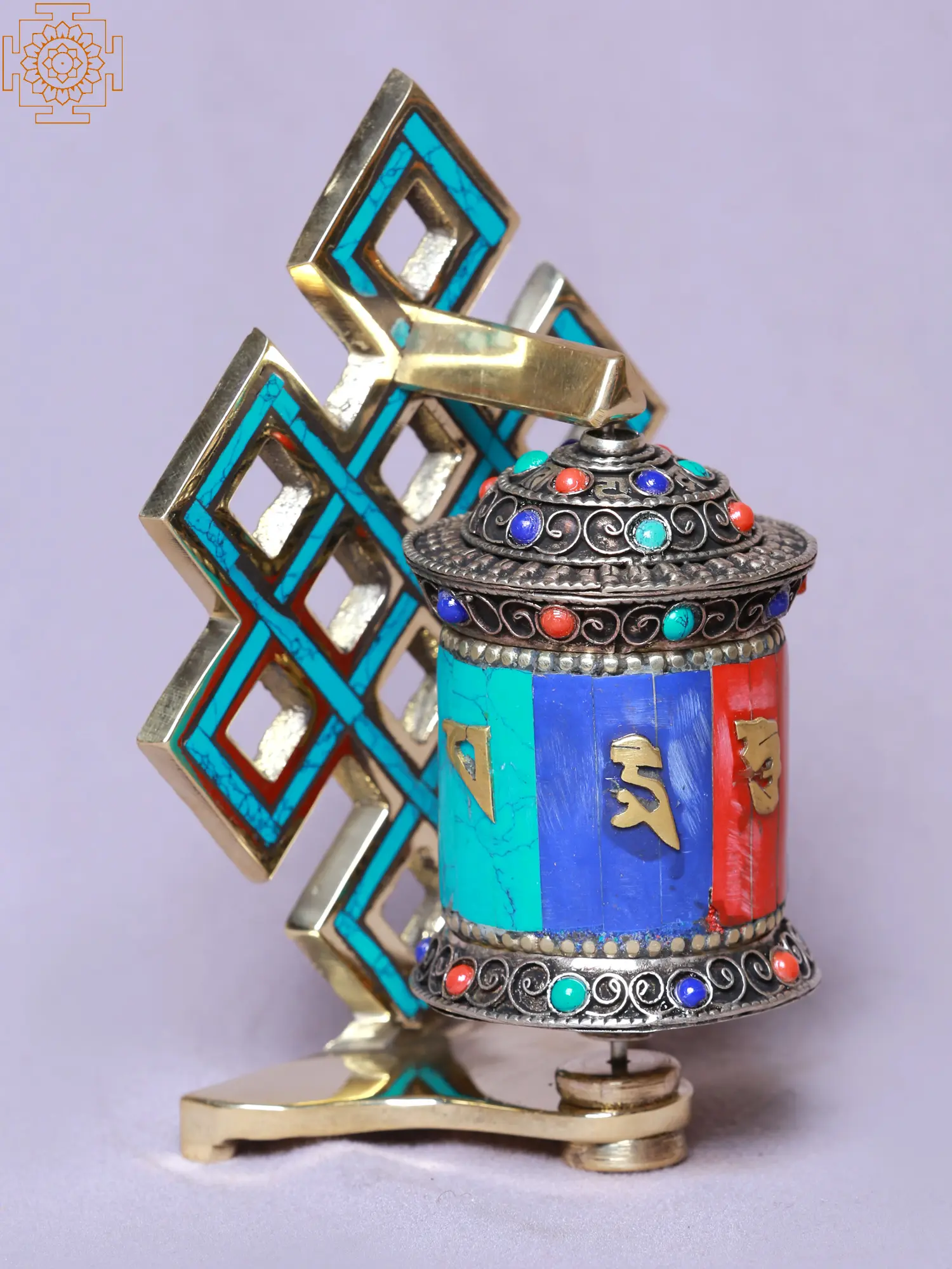 The Endless Knot Stone Setting Prayer Wheel depicts a prehistoric technique of deep meditation. This remarkable wheel showcases the power of symbolism and devotion. It features an endless knot, a sacred Buddhist symbol representing the interdependence and interconnectedness of all things. The Wheel is inserted with three types of crystals, including coral, turquoise, and royal blue, the wheel emanates spiritual energy and tranquility. Each color holds a particular significance, with coral representing passion, turquoise symbolizing healing and protection, and royal blue signifying wisdom and insight. By spinning this prayer wheel, one can engage in a deeply meaningful and focused prayer practice, seeking growth and enlightenment spiritually.
