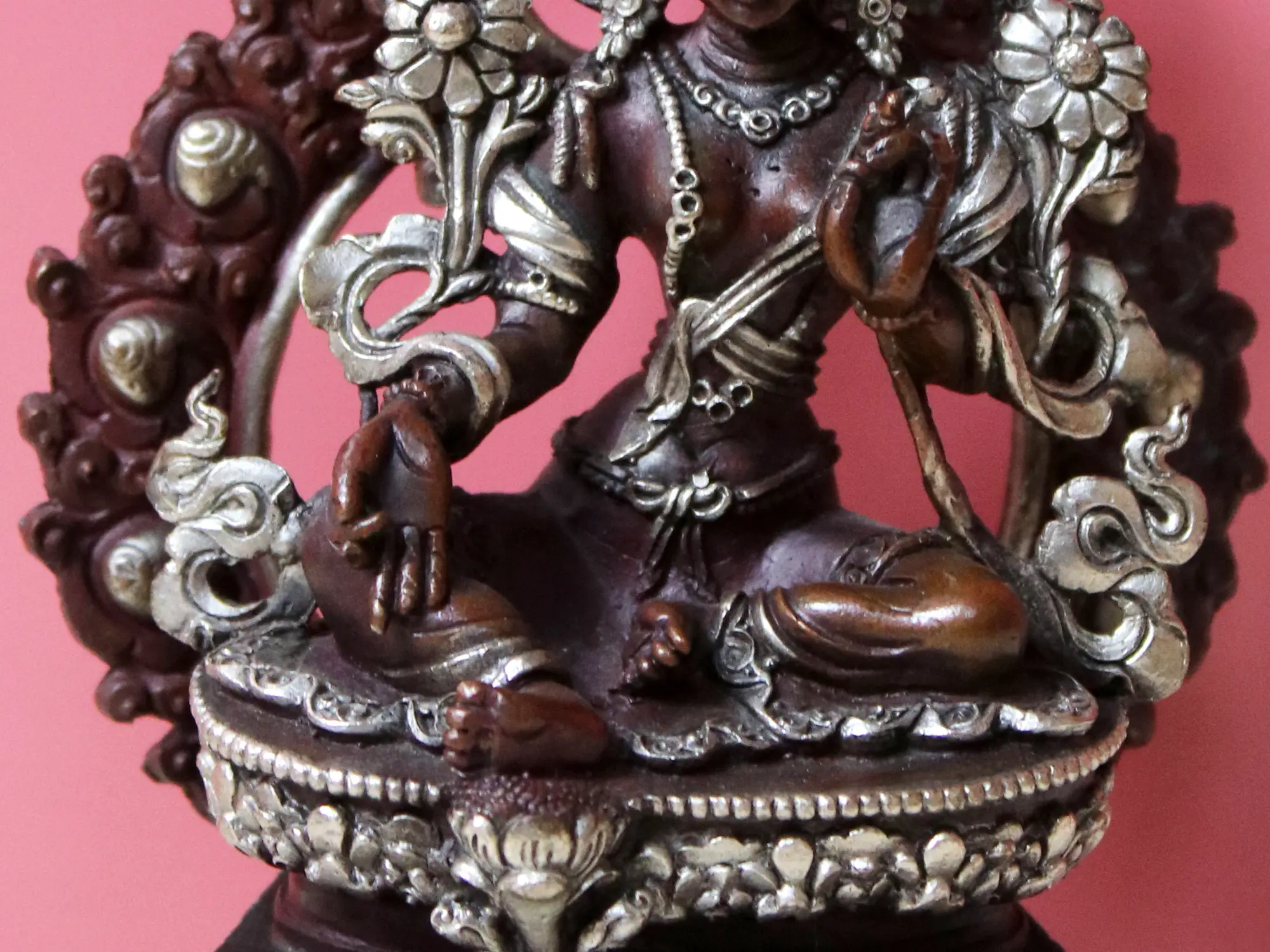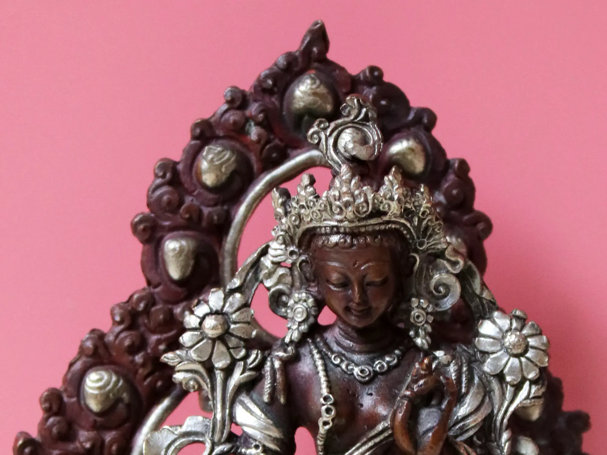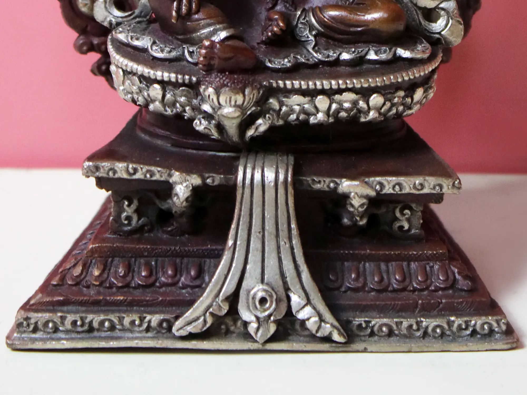 A subtle smile on the countenance of Tara brings a beautiful liveliness to the composition, which is further beautified by the traditional aureole and intricately sculpted pedestal for the statue, which is embellished by a silvery tint at places, contrasting and complementing the antique appeal of copper.
