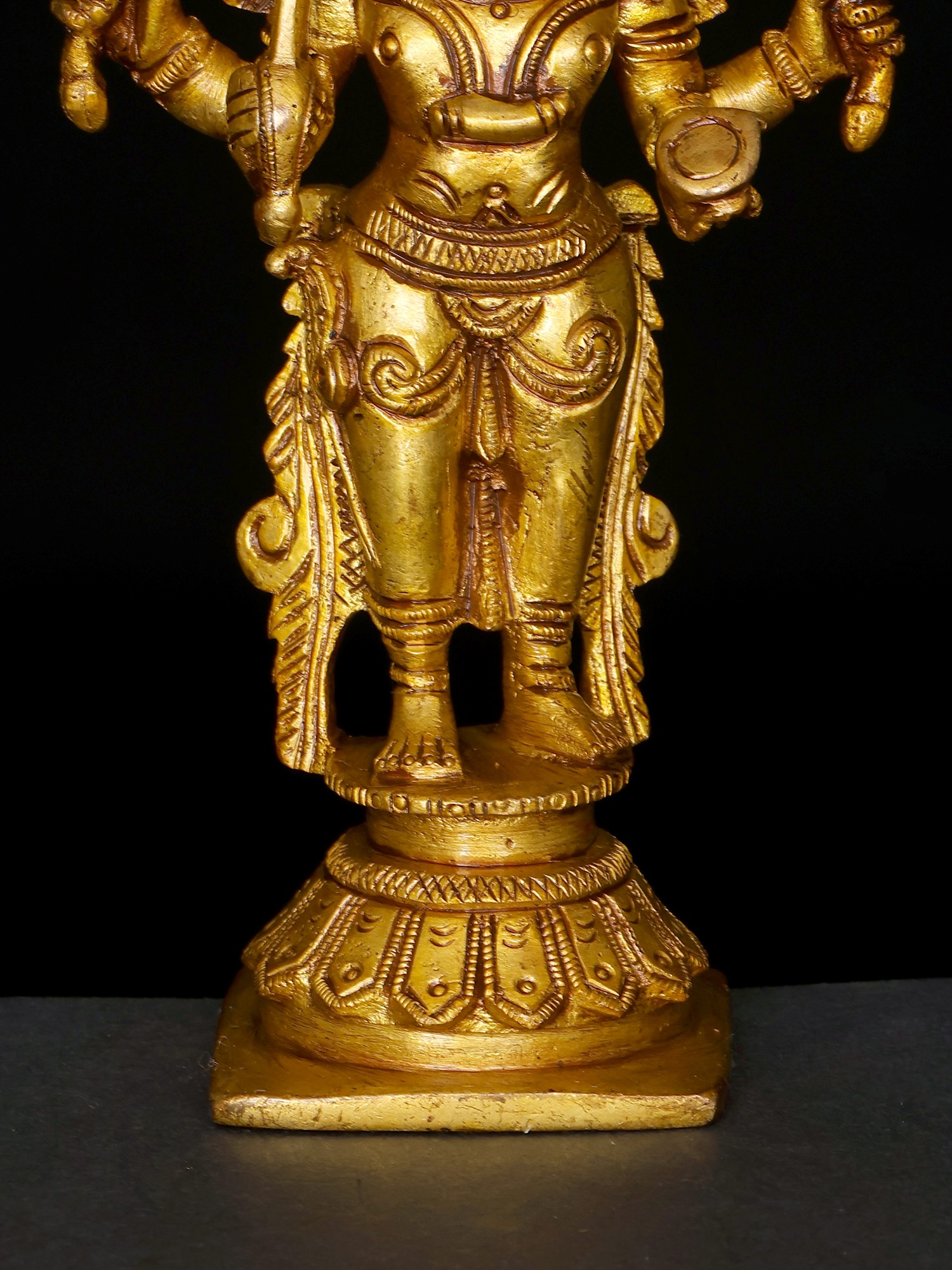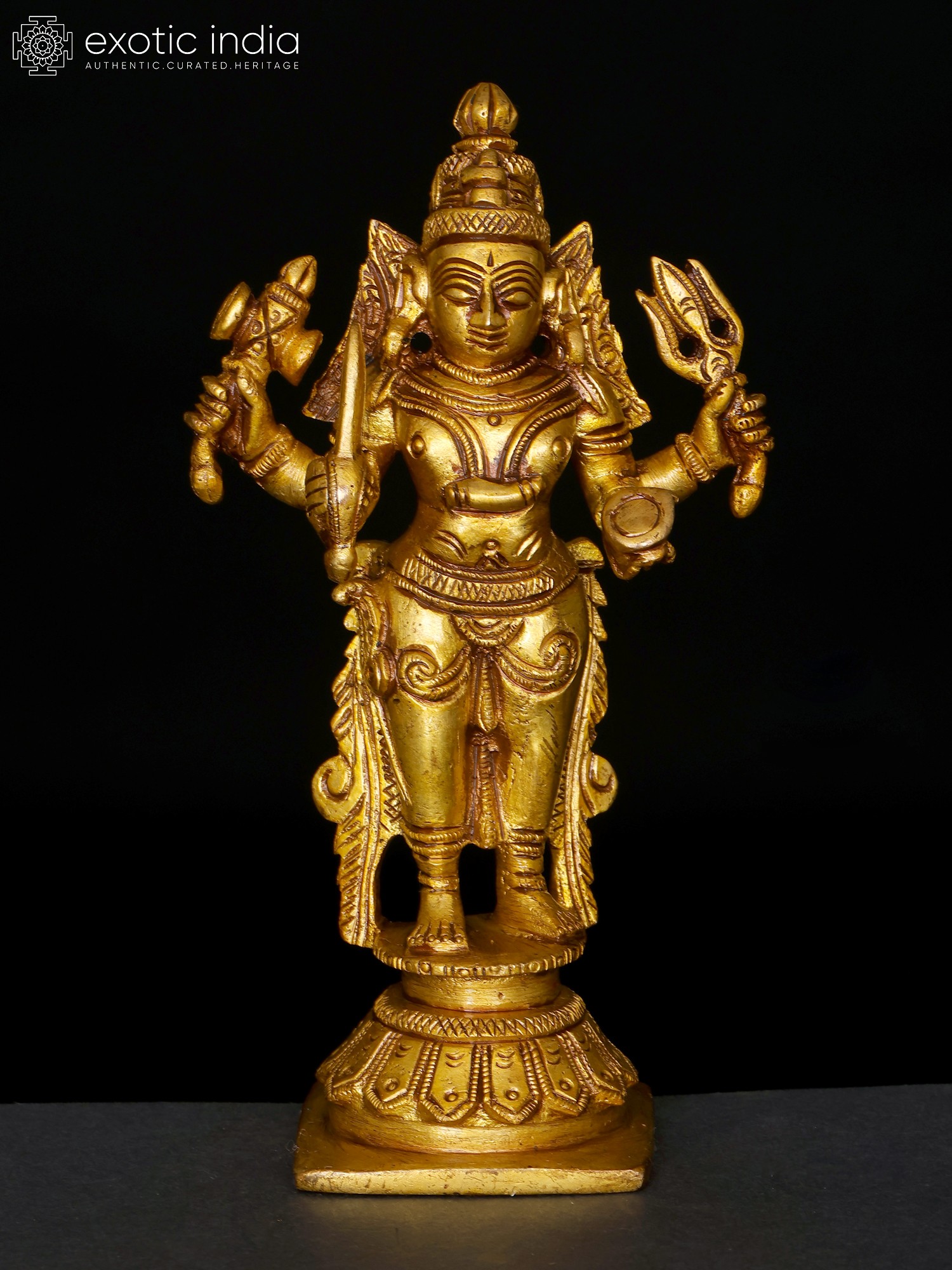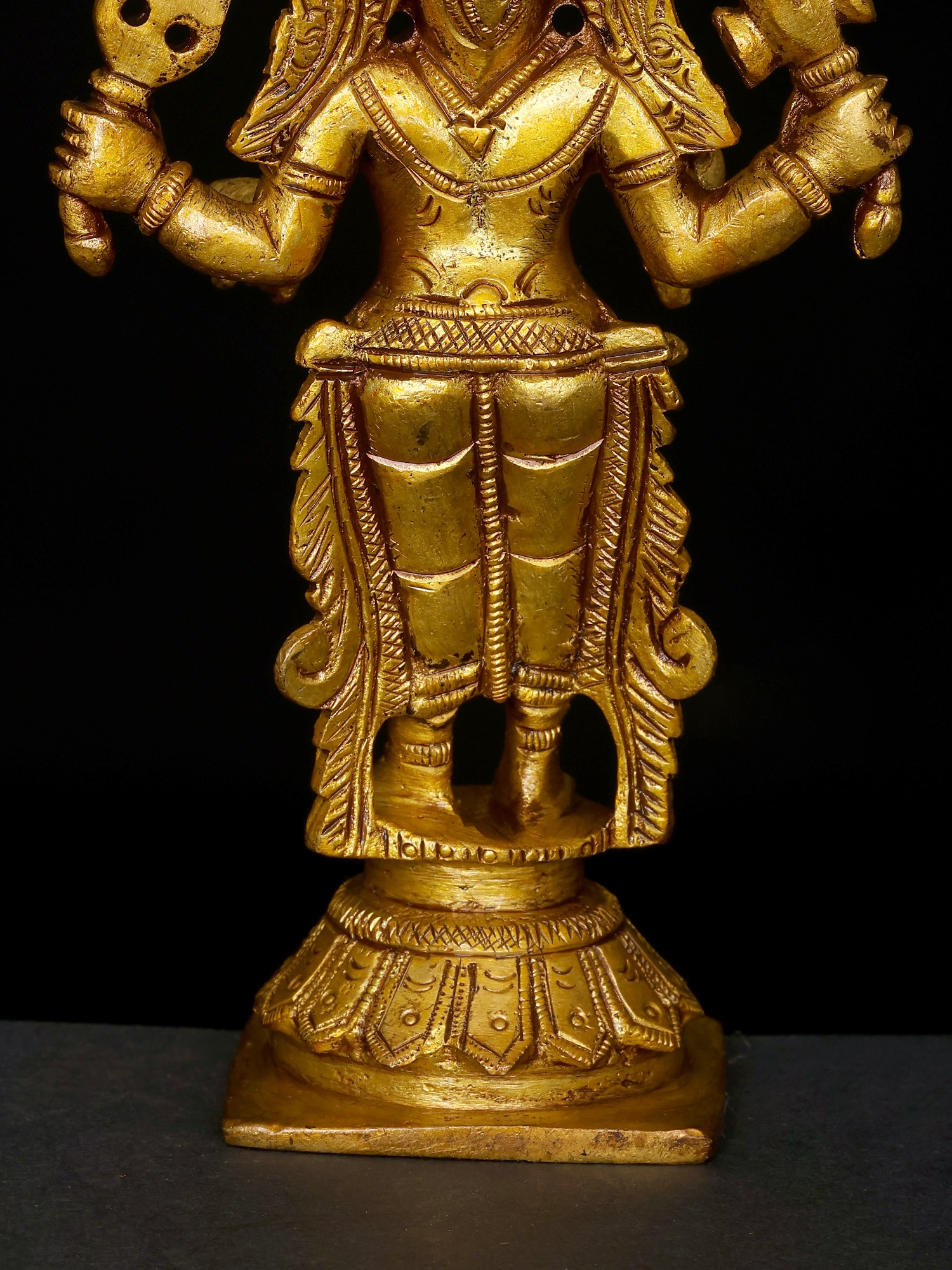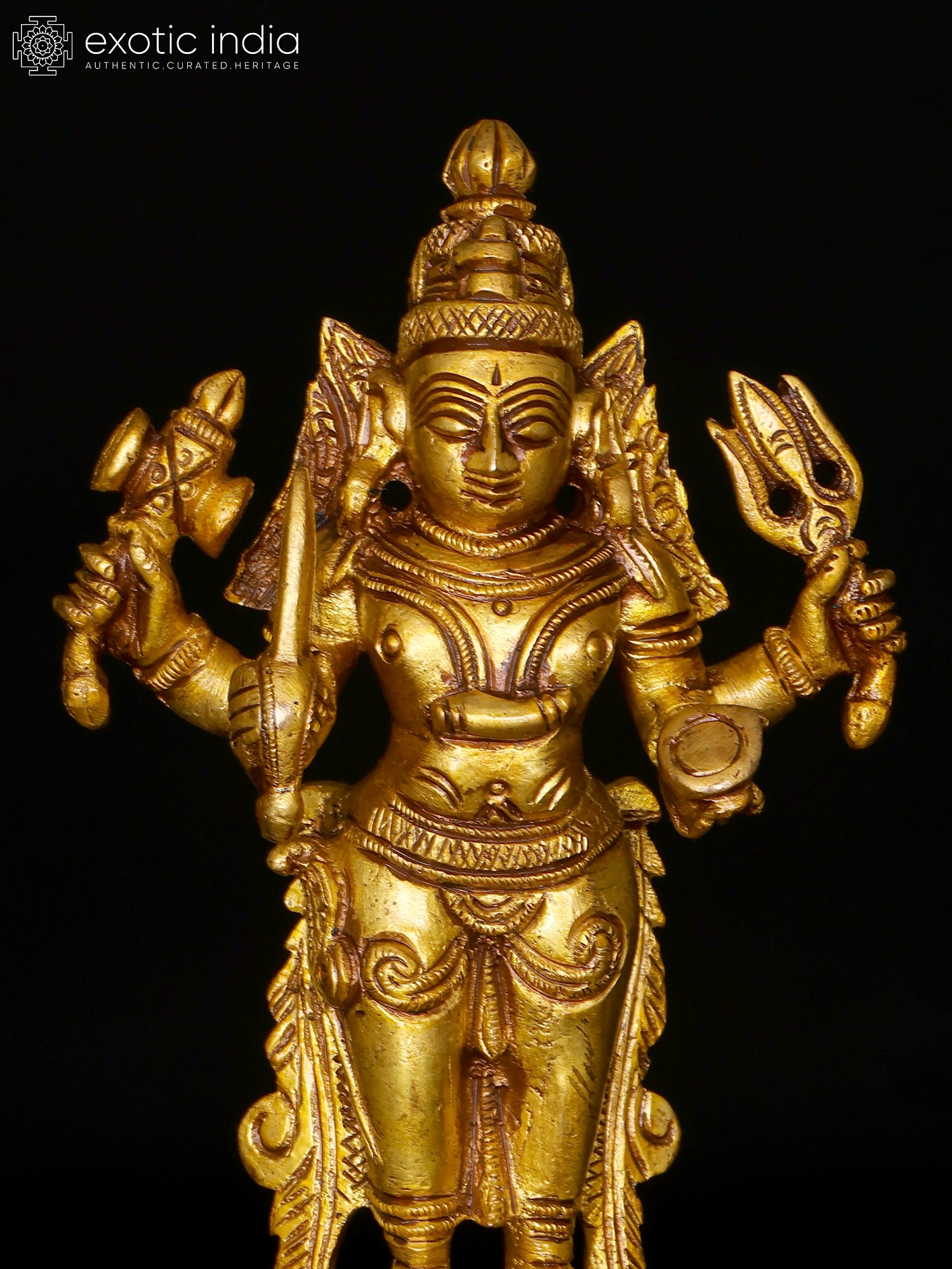 Holding a trident, sword, a serpent with a drum, and a skull cup, the mighty goddess gracing this small brass statue is Mariamman- the rain(mari) goddess of South India, who encapsulates within herself the powers of Kali, Parvati, Durga, and Renuka. Mariamman stands in a graceful form, on a beautifully delineated lotus pedestal, with minimal ornaments and a unique crown with a celestial stillness on her visage.