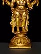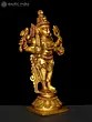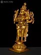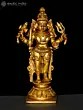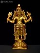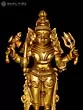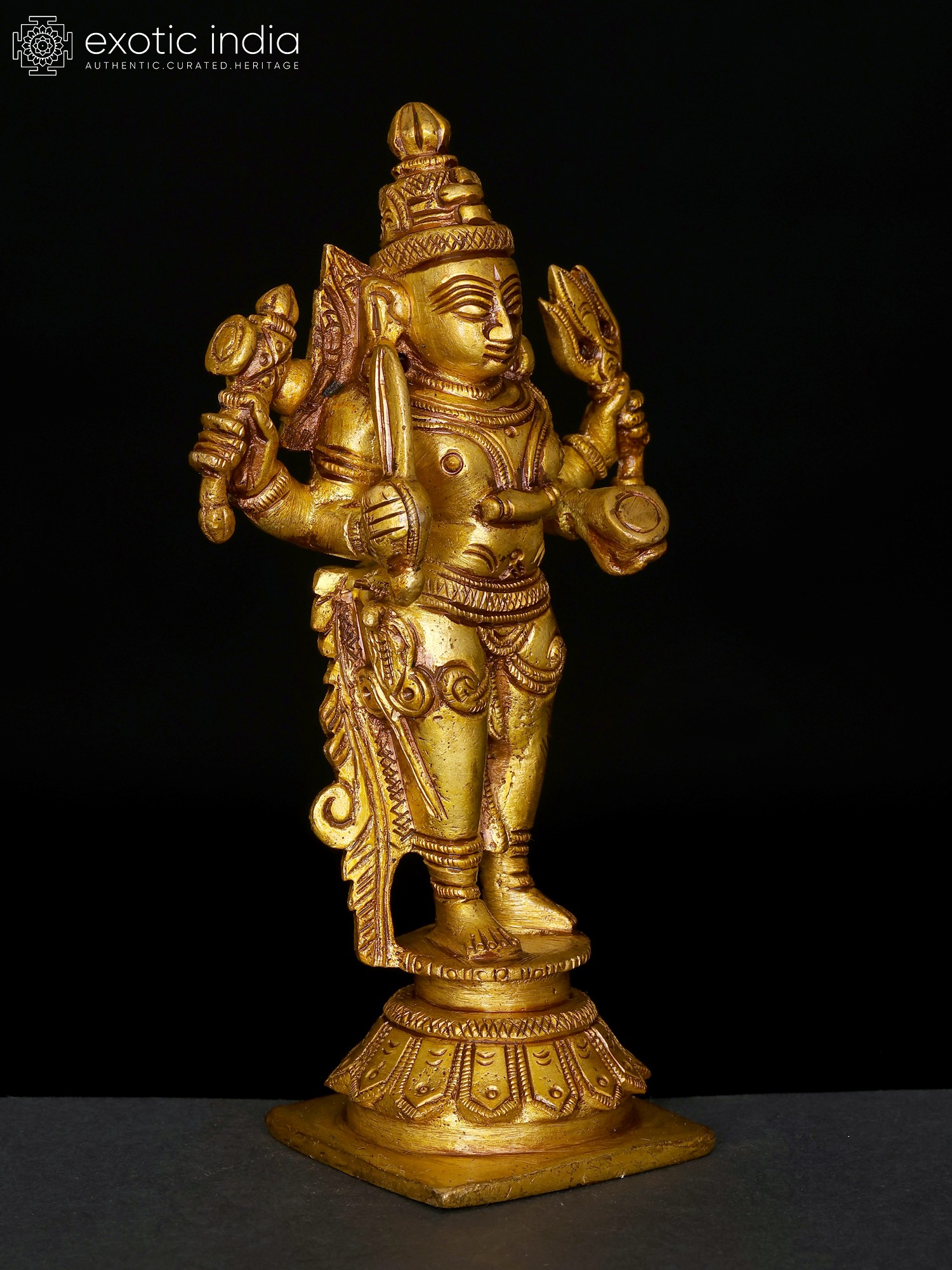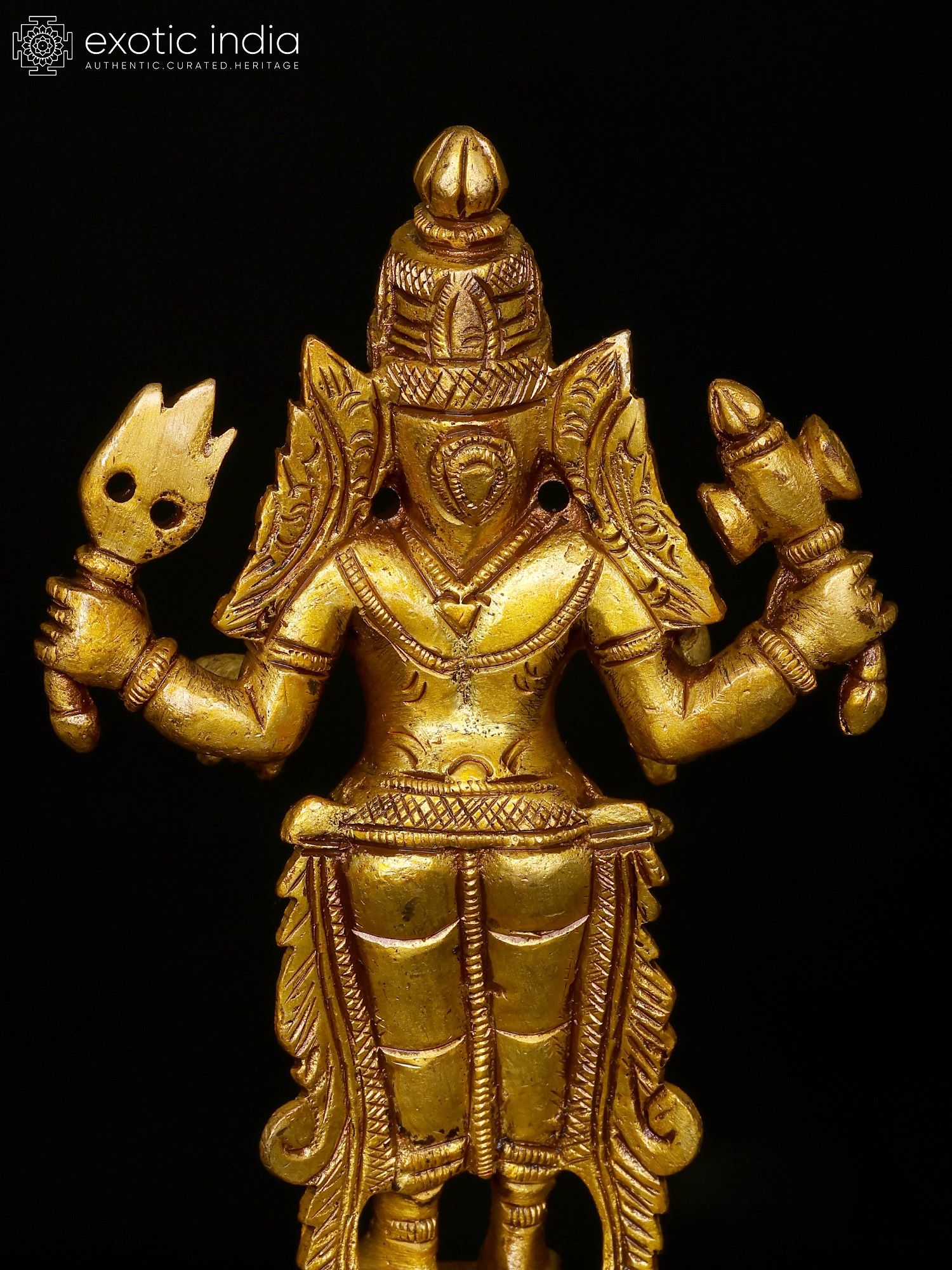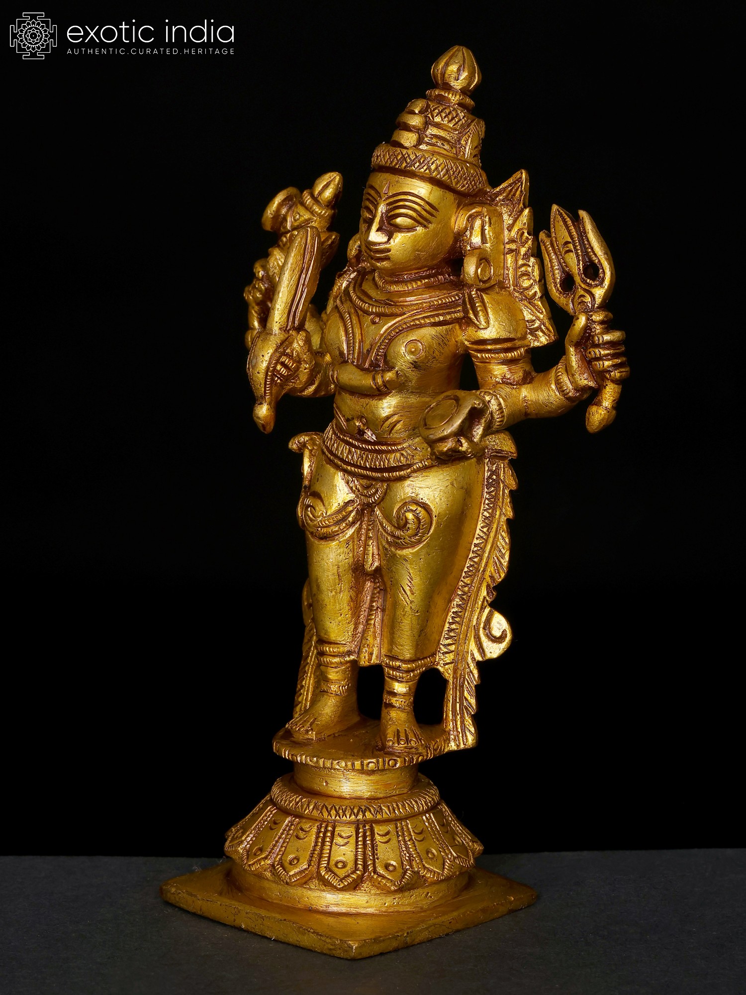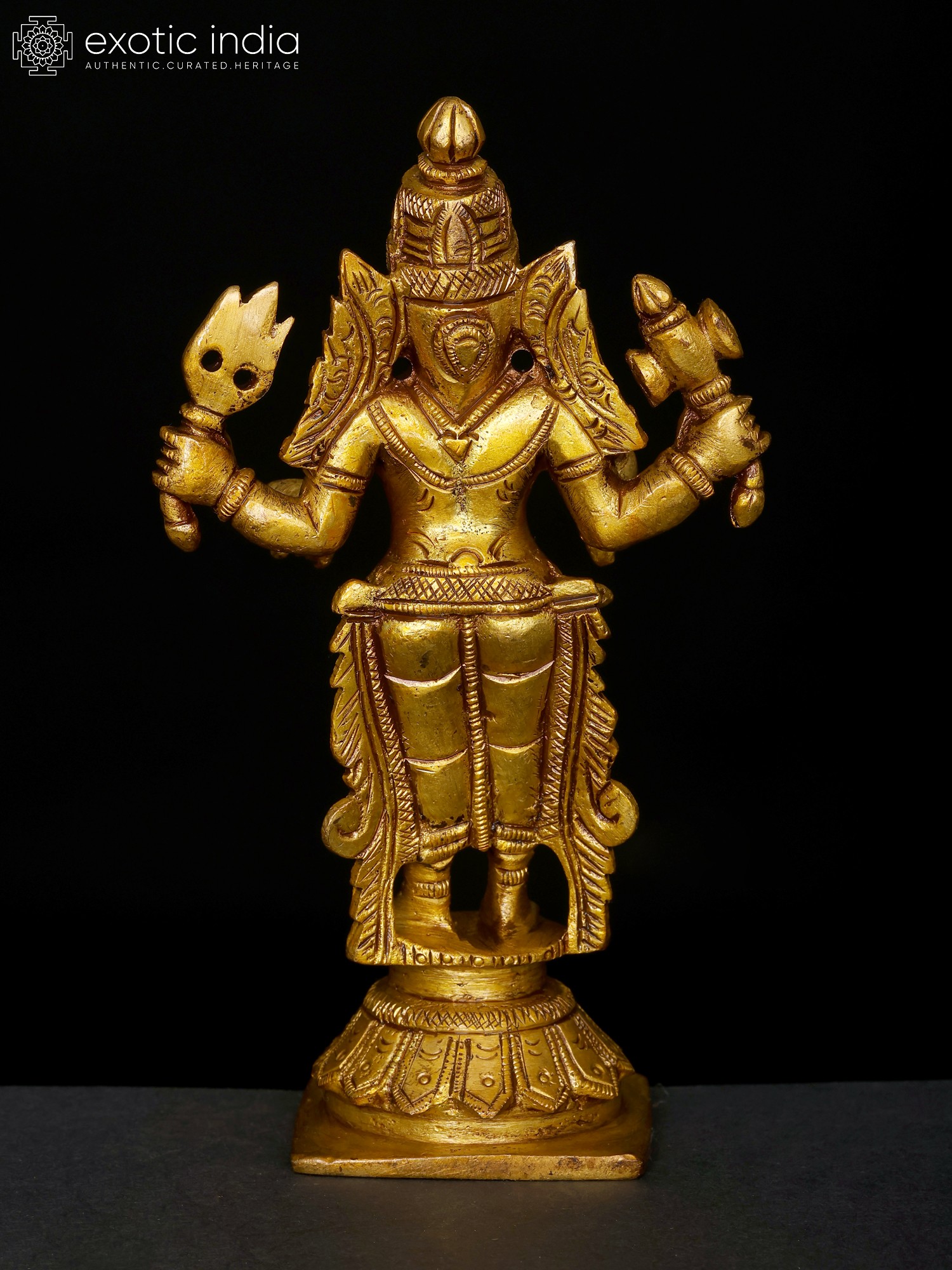 Holding a trident, sword, a serpent with a drum, and a skull cup, the mighty goddess gracing this small brass statue is Mariamman- the rain(mari) goddess of South India, who encapsulates within herself the powers of Kali, Parvati, Durga, and Renuka. Mariamman stands in a graceful form, on a beautifully delineated lotus pedestal, with minimal ornaments and a unique crown with a celestial stillness on her visage.
