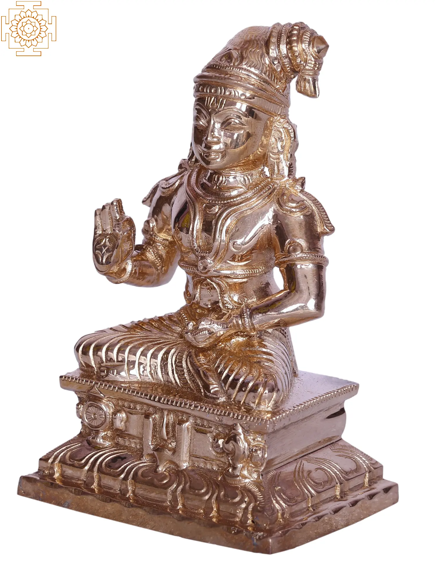 Nammalvar is considered to be the fifth in the line of the twelve Alvars. He is highly regarded as a great mystic of the Vaishnava tradition. Nammalvar is also considered to be the foremost among the twelve Alvars, and his contributions amount to 1352 among the 4000 stanzas in the Naalayira Divya Prabandam. Here, Sitting on the lotus pedestal, Nammalvar’s right hand is in Vitarka Mudra, symbolising the transmission of knowledge and the continuous flow of divine teachings. This portrayal, made from bronze, encapsulates Nammalvar’s divine connection, his enlightened teachings, and the transformative power of knowledge in the pursuit of spiritual awakening.