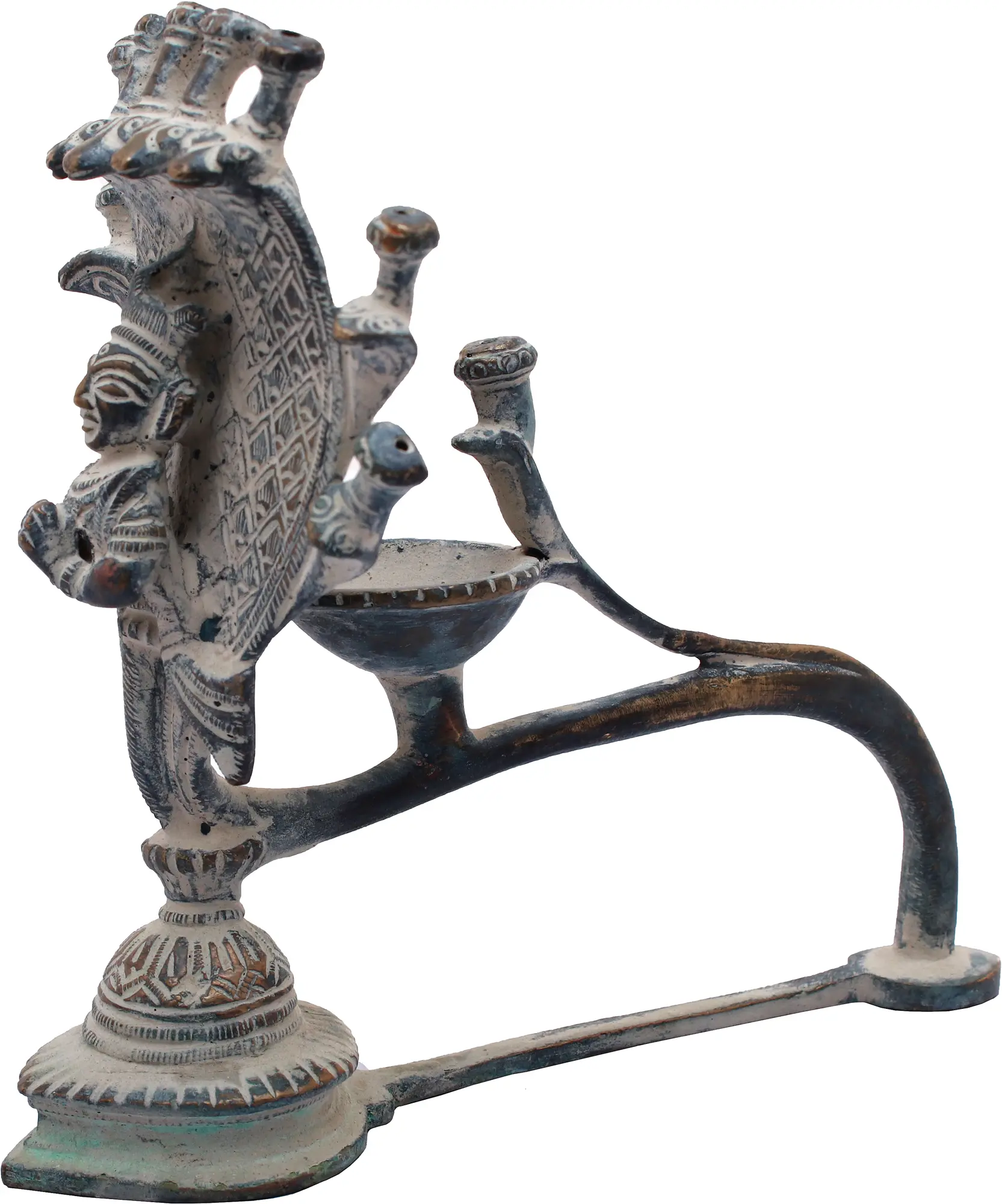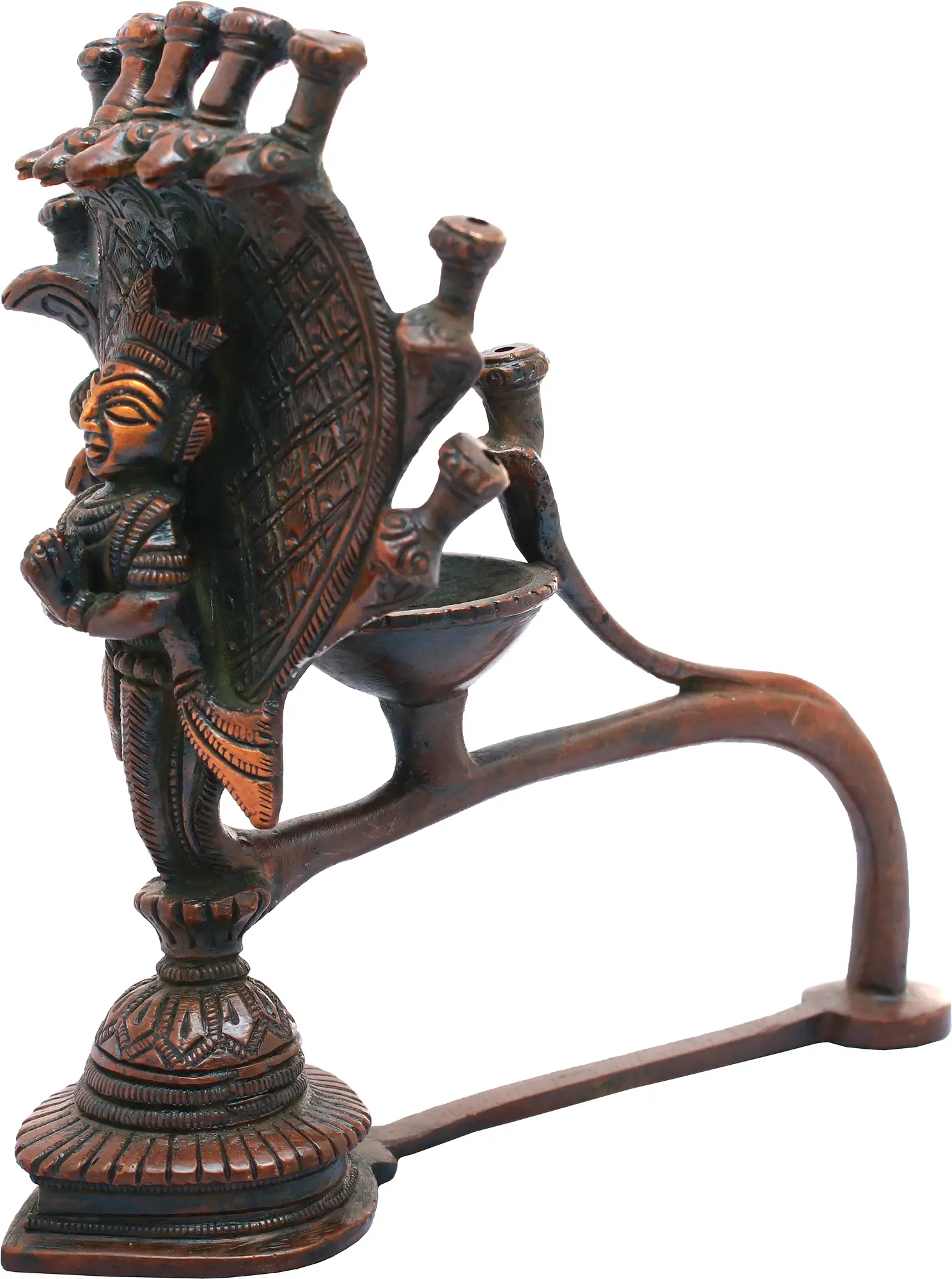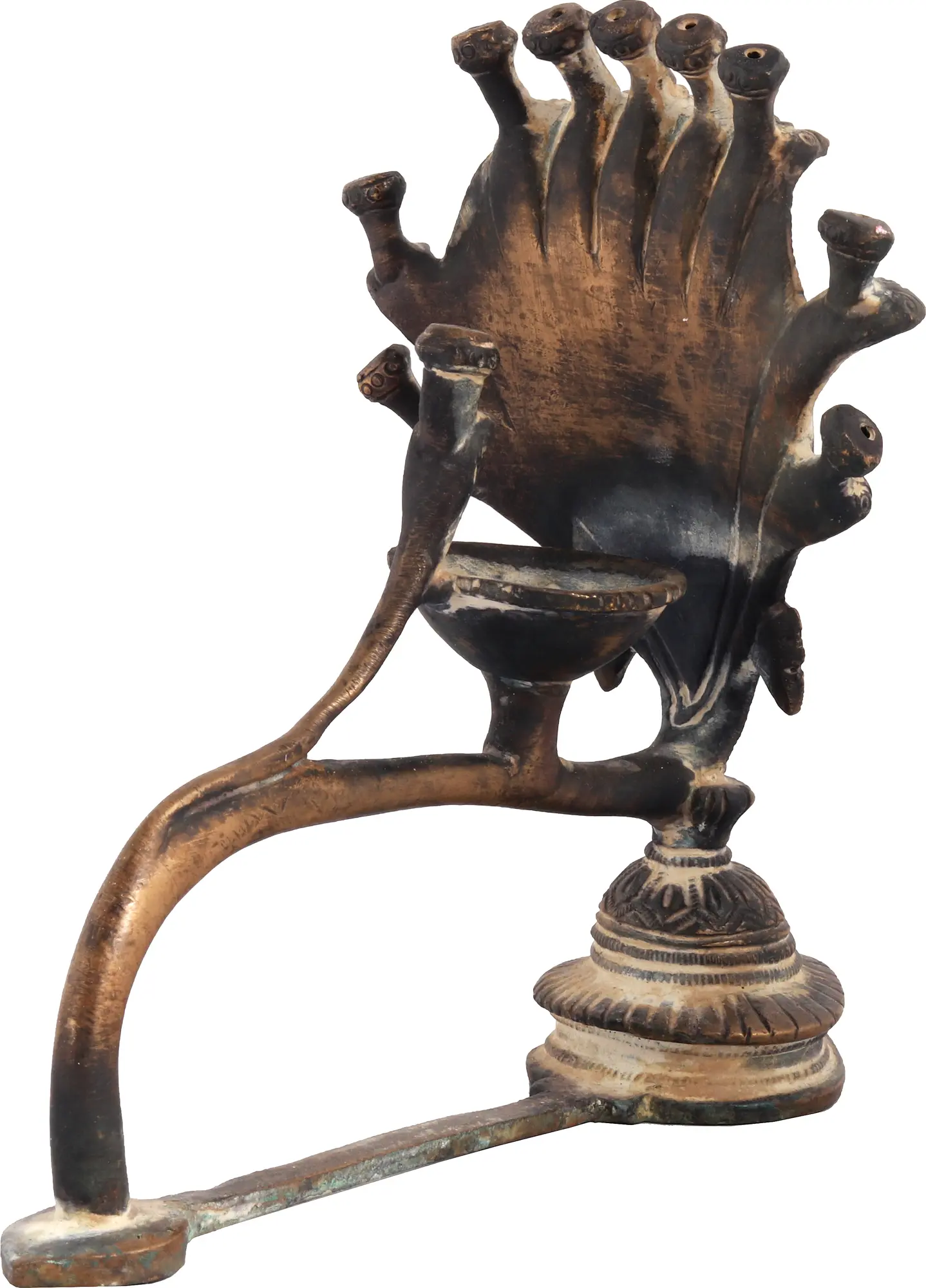 With the grace of a serpent's coiled form, the incense burner provides a sanctuary for ten fragrant sticks. Just as Patanjali's teachings guide seekers through the intricate layers of consciousness, each stick releases its aromatic essence, filling the air with an ambience of tranquillity and introspection. The serpent's hoods, elevated and vigilant, mirror the higher states of awareness attained through dedicated practice. As the fragrant tendrils of incense rise, they echo the ascent of the soul toward enlightenment, weaving a bridge between the material and the spiritual. The figure of Patanjali, the ancient sage and compiler of the Yoga Sutras, rests beside the serpent, symbolising the union of wisdom and serenity. His presence serves as a reminder of the path toward self-realisation and the harmony that can be achieved through the exploration of mind, body, and spirit.