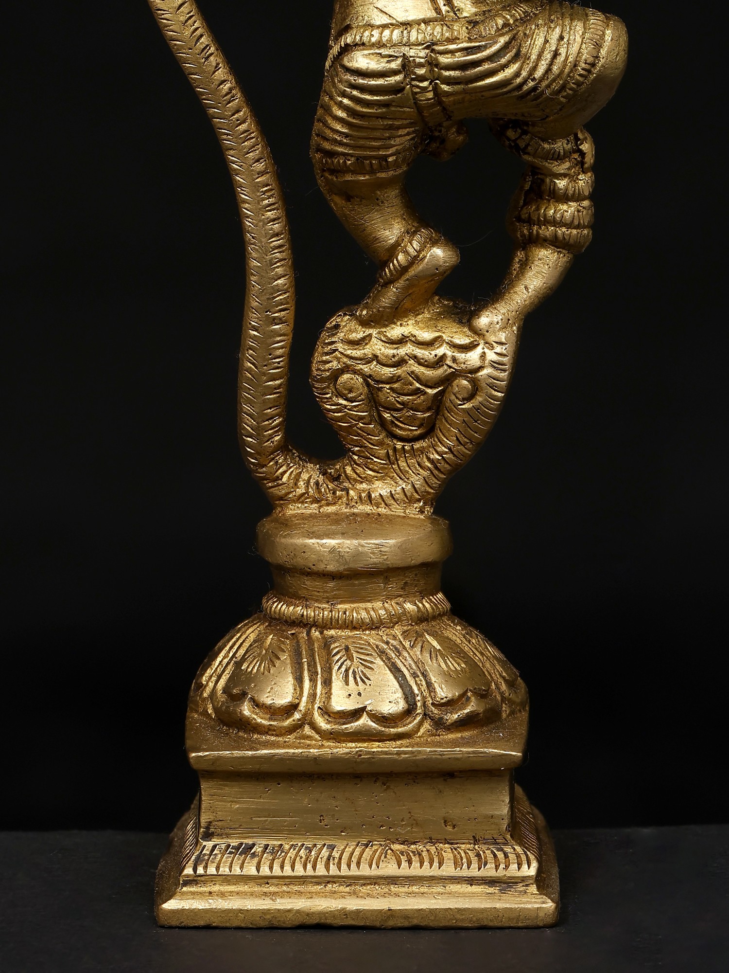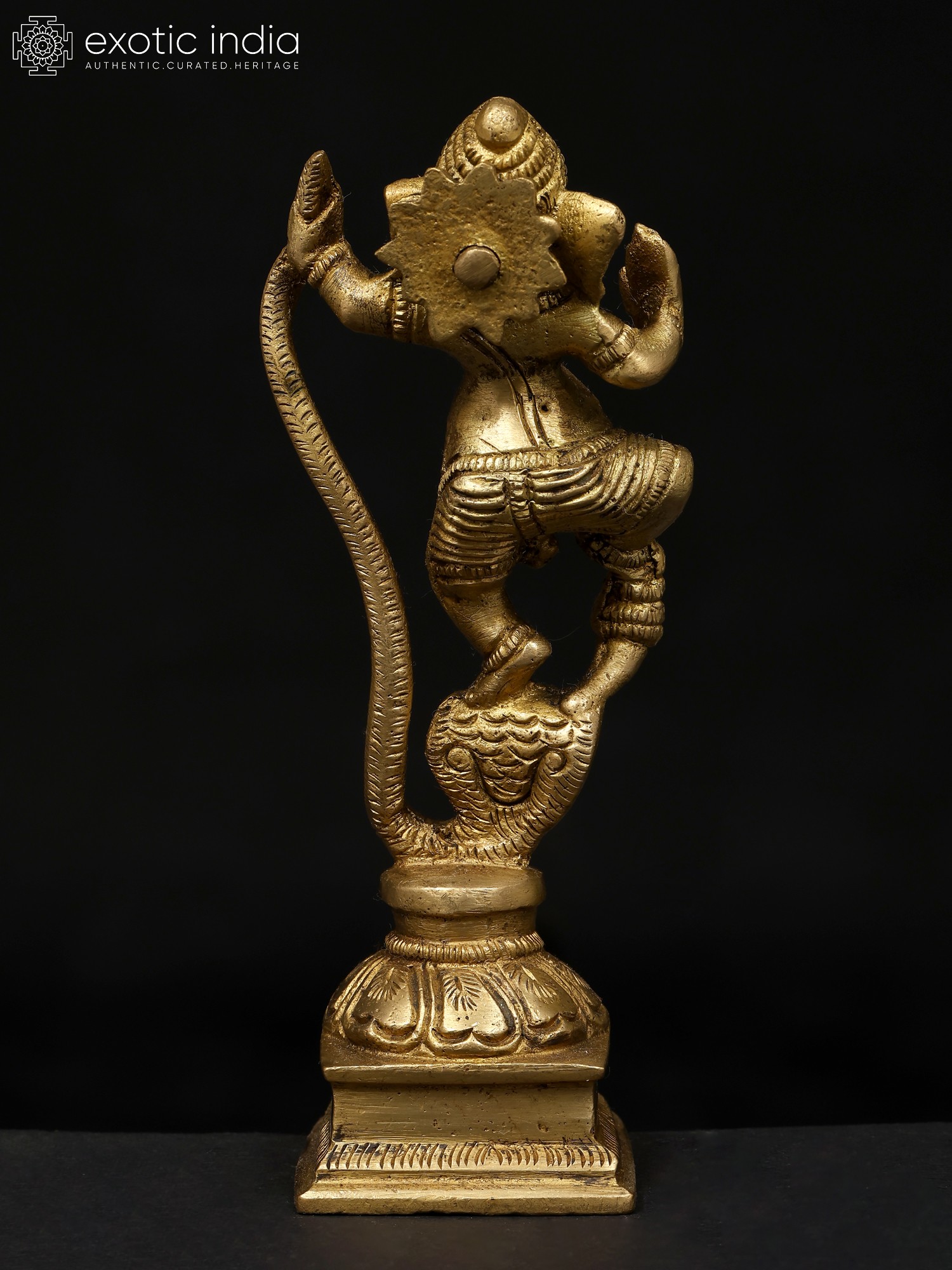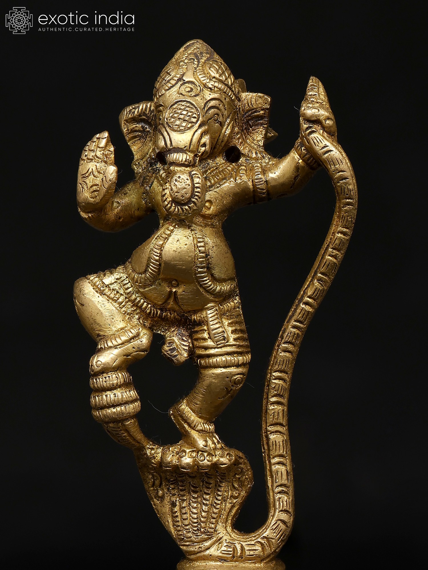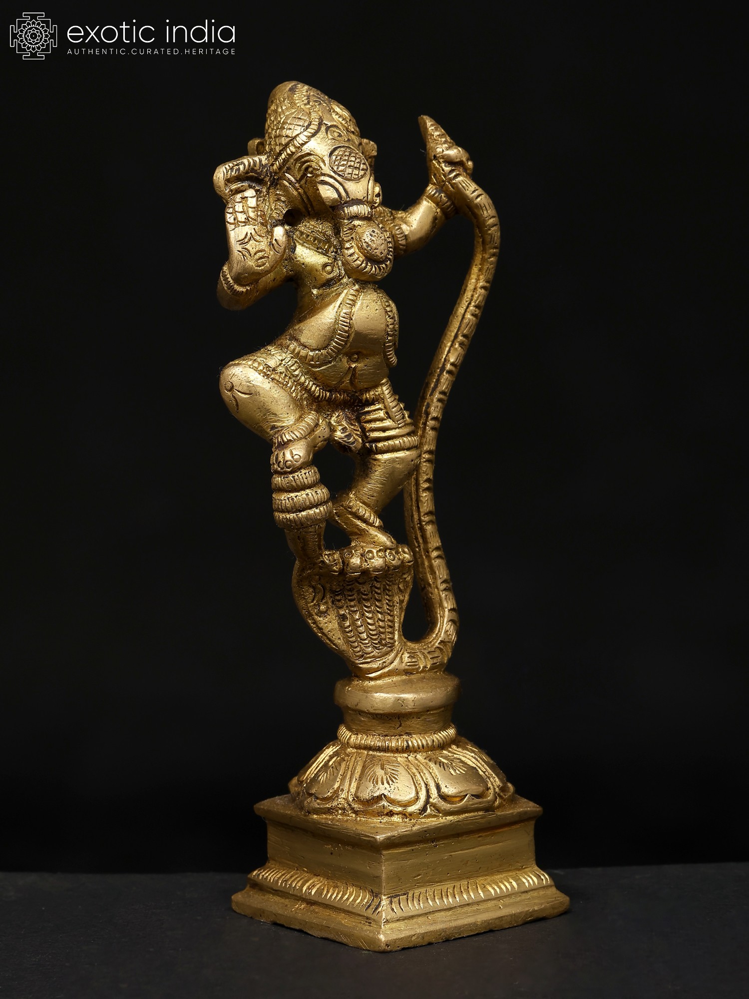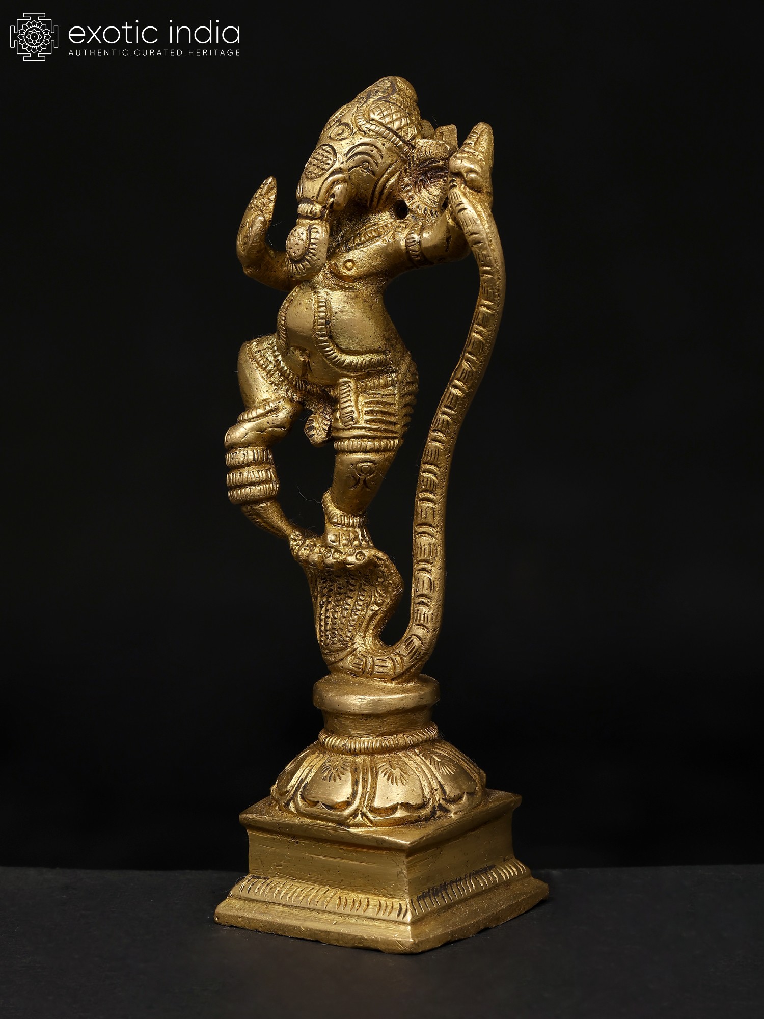 Lord Ganesha is also known as “Vignha-harta Shri Ganesha” as he removes all the obstacles from the path of prosperity and fortune in the lives of his worshipers. In this iconic representation, Ganesha, the remover of obstacles, demonstrates his playful and powerful demeanor. With utmost serenity, he holds Kaliya’s tail in one hand, signifying his mastery over malevolent forces. Lord Ganesha is depicted in Abhaya Mudra, symbolizing fearlessness. The dance represents the victory of wisdom and goodness over ignorance and evil, inspiring you to face life’s challenges with unwavering courage and faith. This sacred masterpiece embodies the rich cultural heritage of India. This brass artwork serves as a powerful reminder of the triumph of good over evil, a timeless symbol of divine protection and benevolence.